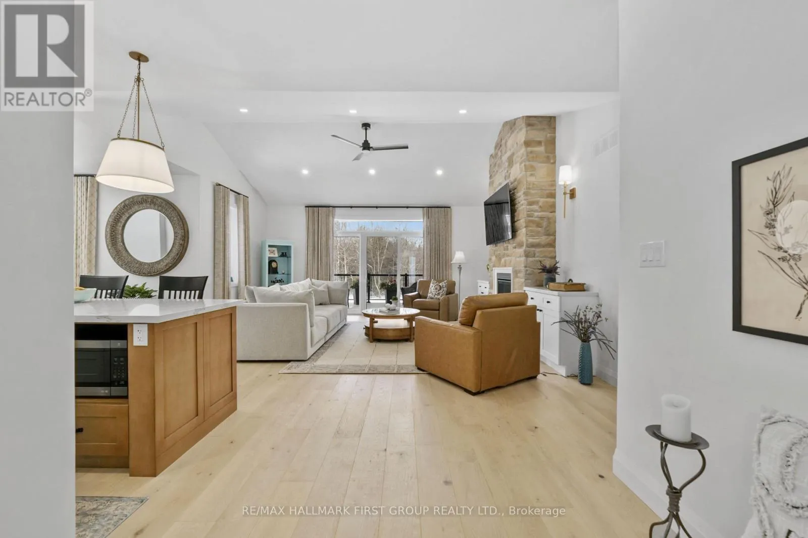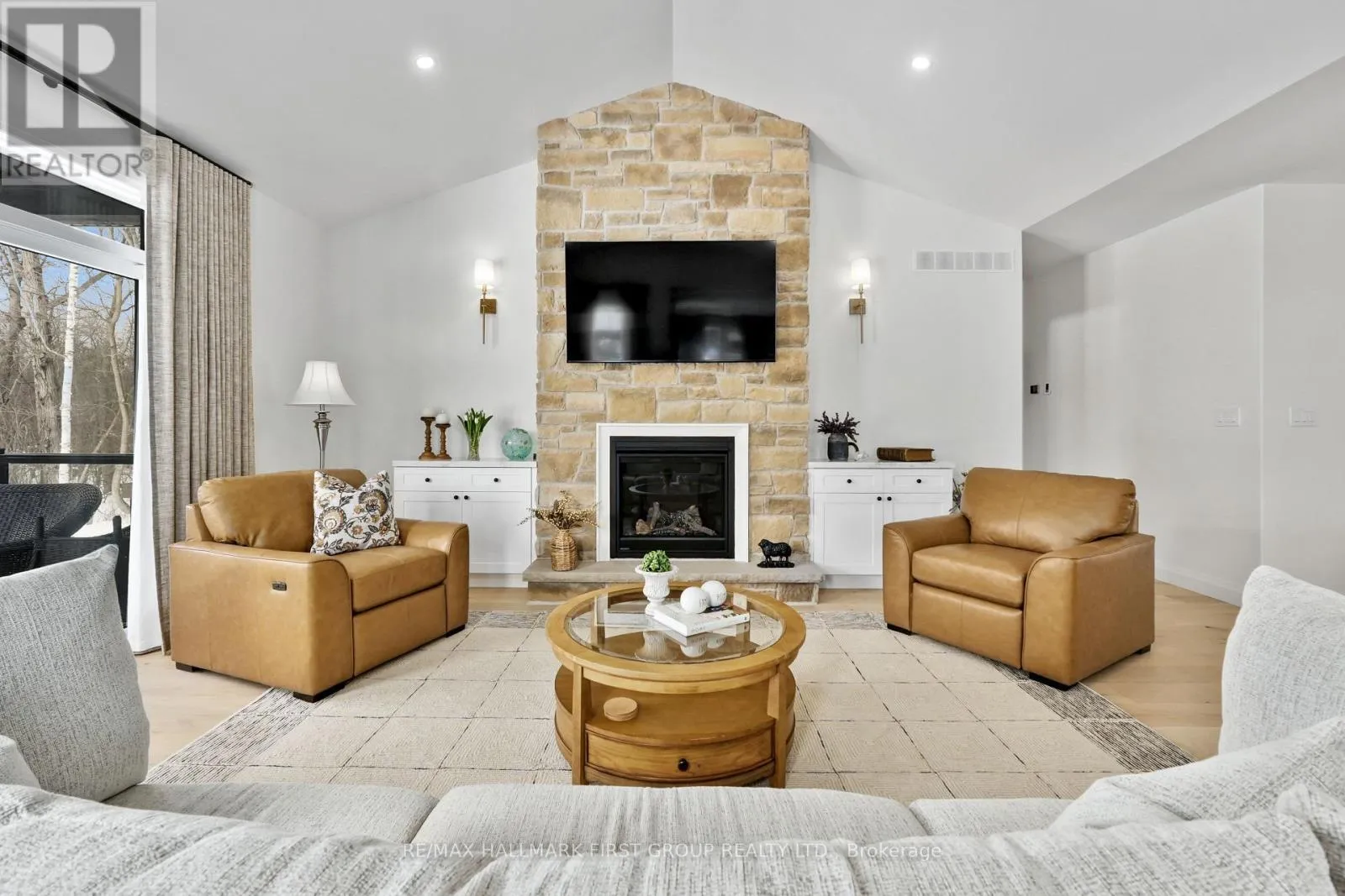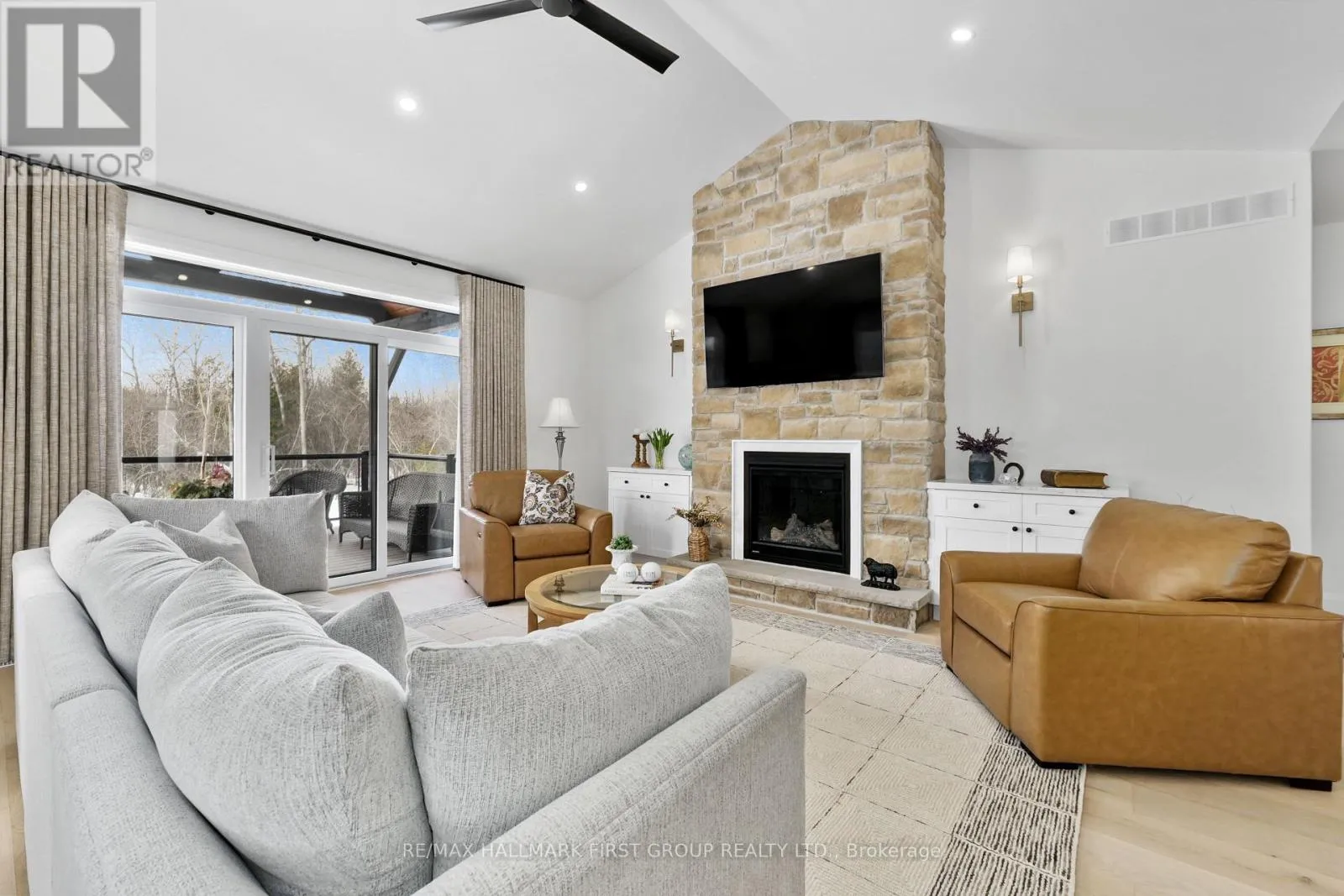 Cross Streets: Ridgeline Dr & Vista View Dr. ** Directions: Hwy 401 E, Exit Lyle St heading South, Turn Right onto Vista View Dr, Left onto Ridgeline Dr. Newly constructed luxury residence set within the sought-after hamlet of Grafton, showcasing elevated finishes throughout a generous private lot. Refined main-level living spans 2,052 square feet, complemented by an impressive 824-square-foot garage providing parking for three vehicles. A dramatic two-storey entry features striking contemporary lighting, creating a memorable first impression. The open principal living space offers an inviting area with a stone-clad fireplace feature wall, a soaring cathedral ceiling, and a walkout that extends everyday living outdoors. The dining area is framed by expansive windows, providing ample room for entertaining. The kitchen delivers modern elegance with ceiling height cabinetry finished with crown moulding detail, an oversized island with breakfast bar, statement pendant lighting, coordinated appliances, open shelving, plus sleek, timeless backsplash surfaces with refined countertops. The primary bedroom offers a serene retreat with a spa-inspired ensuite featuring a double vanity, glass shower enclosure, separate soaker tub, private water closet, and spacious walk-in closet. Two additional well-appointed bedrooms, a full bathroom, and convenient main-floor laundry complete the level. The fully finished lower level expands the living experience with a large recreation room ideal for games or relaxation, a dedicated office, two bright bedrooms, a stylish bathroom with glass shower enclosure, plus abundant storage. Outdoor living is elevated by a carefree Trex deck with glass railing that captures uninterrupted views across mature trees plus open greenspace, creating an ideal country setting paired with upscale comfort. Proximity to everyday amenities, minutes from the world-renowned Ste. Anne's Spa, plus quick access to Highway 401, completes this exceptional offering. (id:27476)
