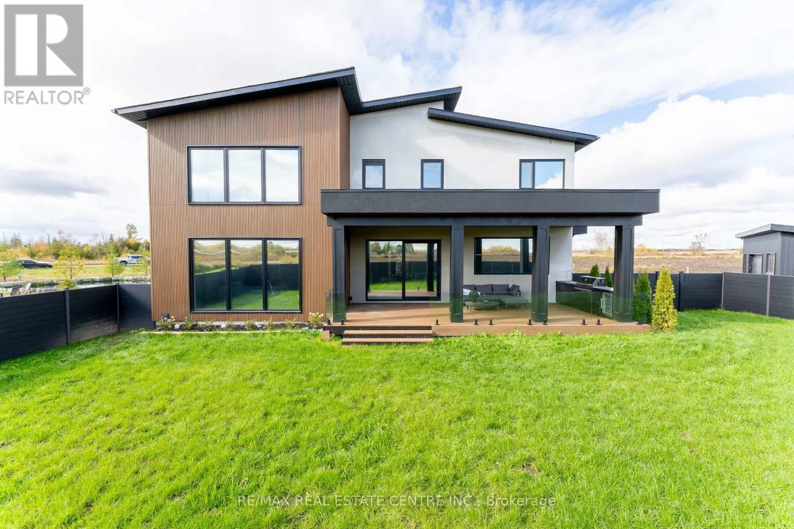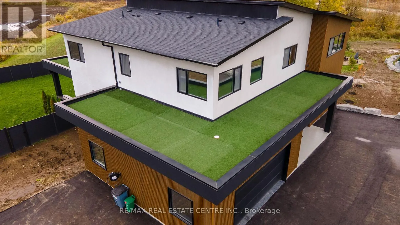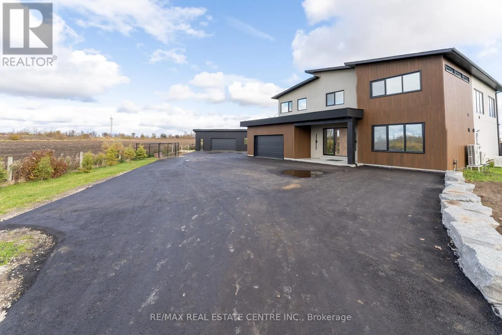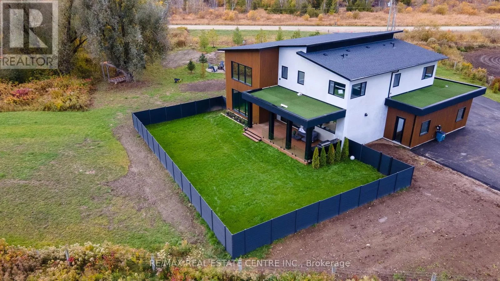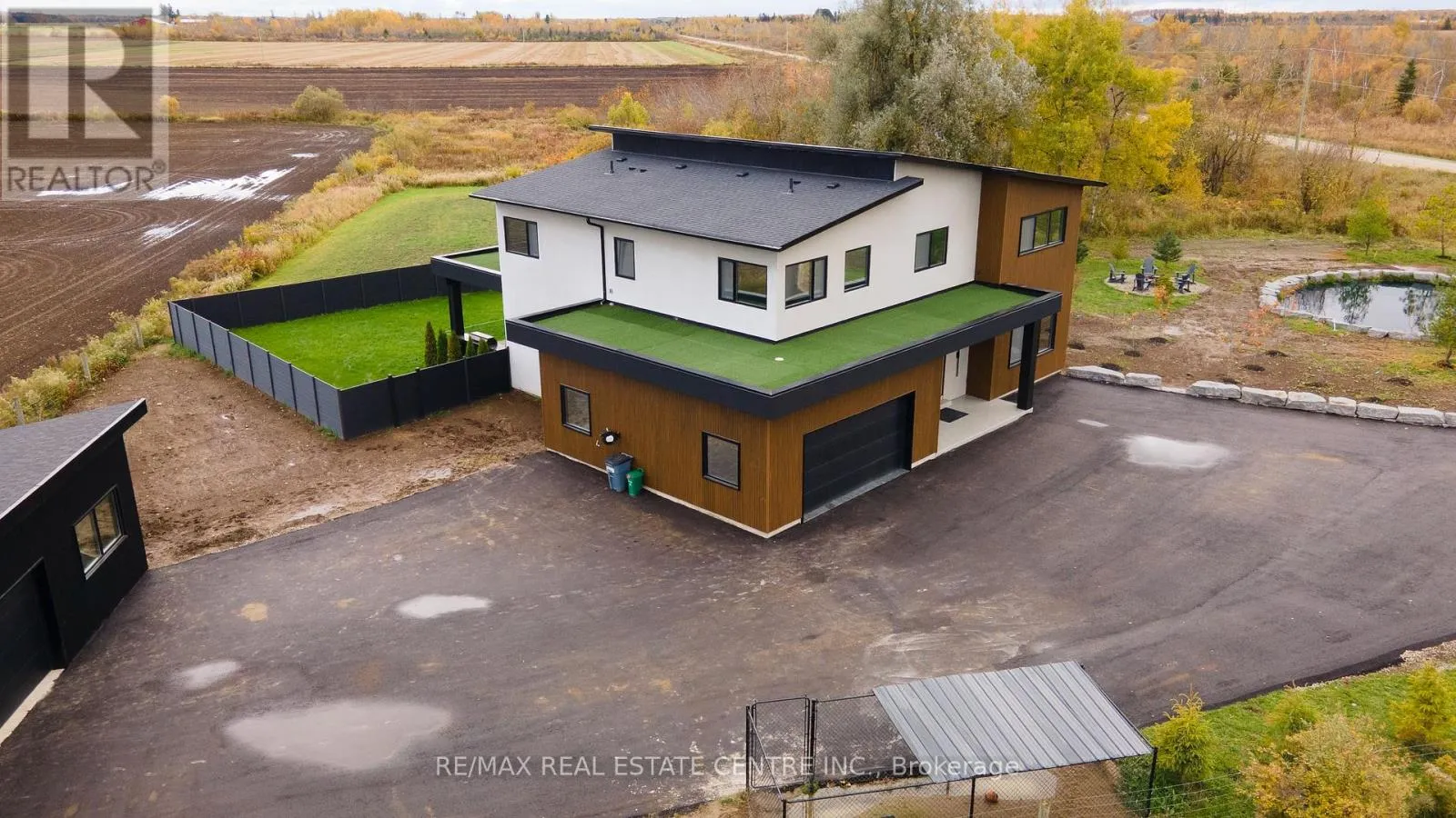 Cross Streets: Hwy 89 & 8th Line. ** Directions: Hwy 89 to 8th Line. Modern Luxury on 2.5 Acres. Discover the epitome of sophistication and architectural excellence. Completed in 2025, this 3,240 sq ft. super-modern luxury estate is a flawless fusion of European design, cutting-edge technology, and elegance-set on 2.5 acres of landscaped privacy. Step inside through grand 8-ft doors and be greeted by 10-ft ceilings, sleek black-framed triple-pane windows, and a dramatic 20-foot rock feature wall with mountain-inspired character. The showstopping grand staircase, adorned with glass railings and in-floor lighting is breathtaking The chef's kitchen is a masterpiece of function and style-featuring quartz waterfall countertops, porcelain backsplash, JennAir appliances, an induction cooktop, and hidden fridge dishwasher for a seamless aesthetic. Integrated cabinet handles, MDF wall paneling, and a walk-in pantry elevate the design. The living space flows outdoors to a covered composite deck and outdoor kitchen, overlooking a backyard with aluminum composite fencing, fire pit with Muskoka chairs, and a dug pond-creating an entertainer's dream. Every element of comfort has been considered-from heated floors and on-demand hot water, to 3 heat pumps, propane furnace, and full spray foam insulation. A Generac generator ensures whole-home reliability. The heated garage is a showpiece featuring epoxy floors, finished ceiling, electric car charger rough-in, and walkout through a custom mudroom. A detached 18'x40' workshop adds additional space for projects or storage. Luxury continues with built-in speakers, full security system, Ring doorbell, Ecobee thermostat, exterior timed lighting, and reflective window film for privacy and efficiency. The primary suite defines modern indulgence with a walk-behind custom closet, built-in organizers, heated shower floors, and wall-mount toilets with flush-mount floor and wall vents. From the composite siding to the magnetic door latches, every inch of this home reflects premium quality and forward-thinking. (id:27476)
