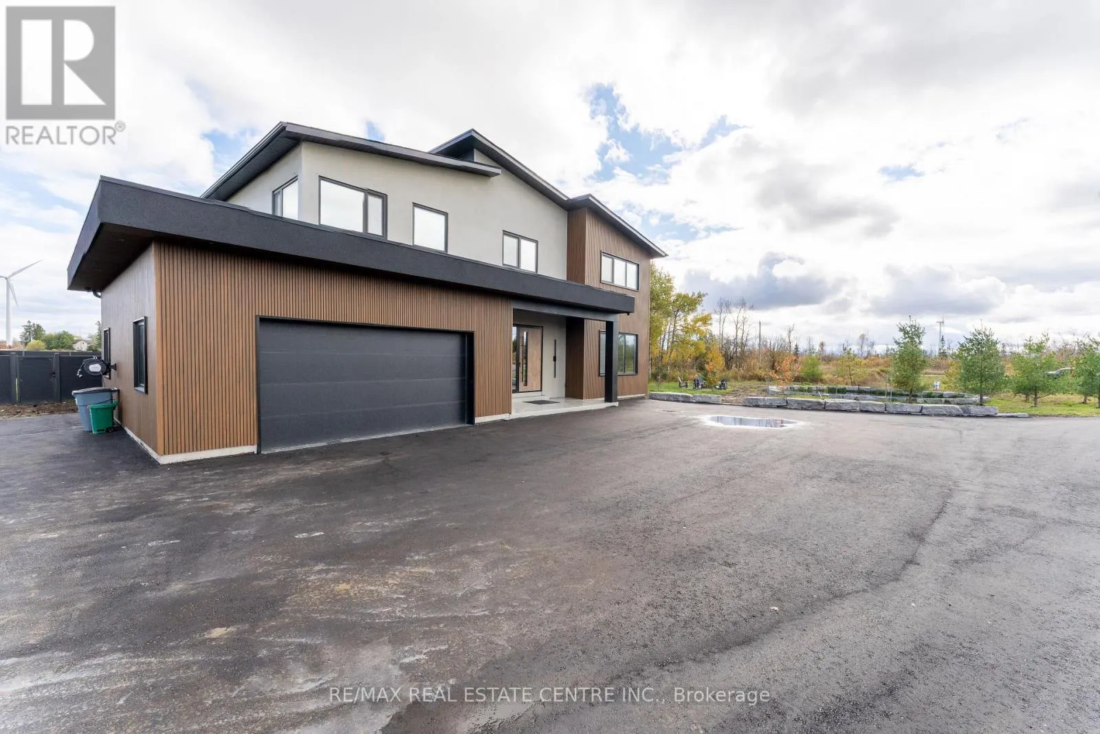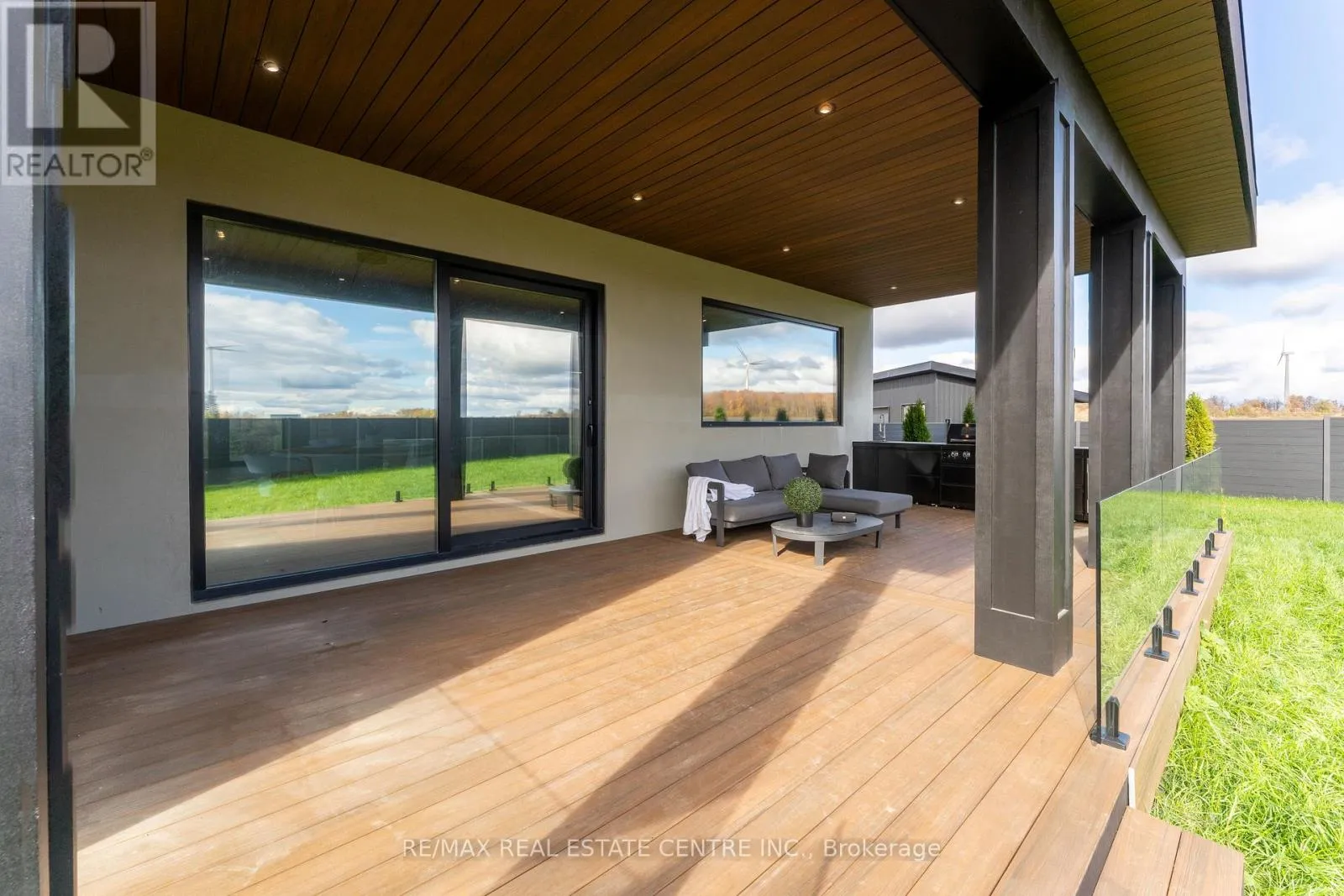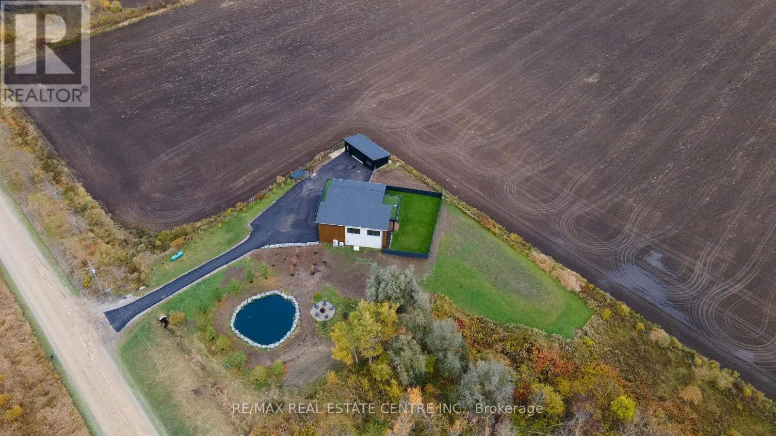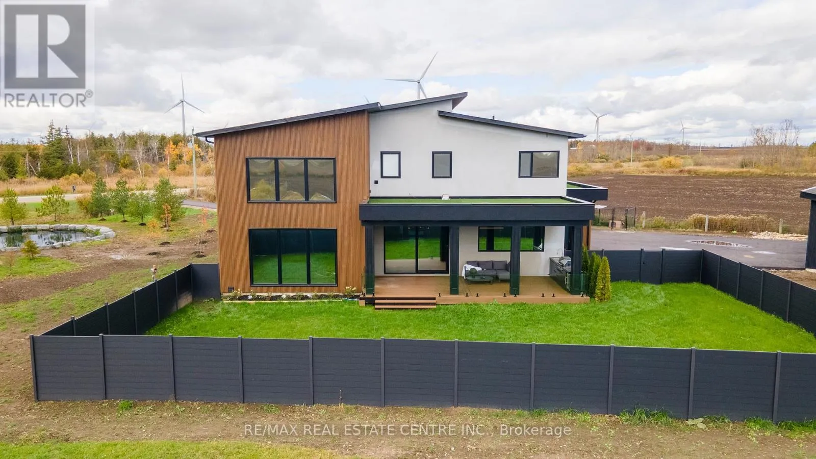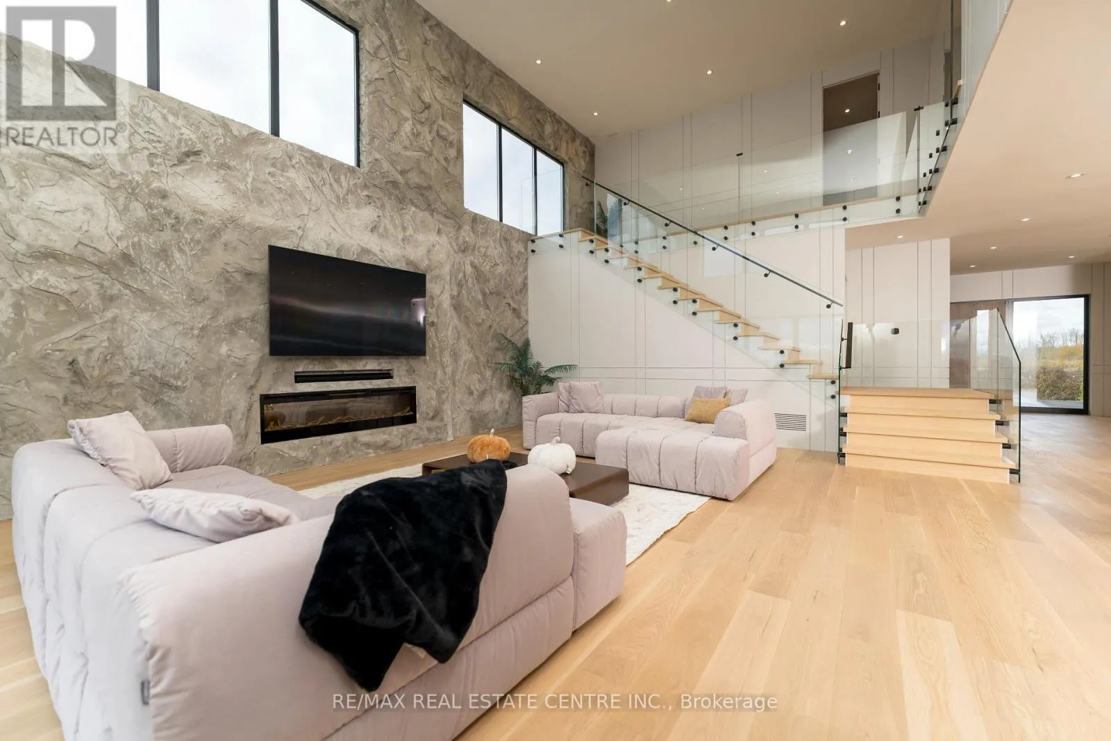 Cross Streets: Hwy 89 & 8th Line. ** Directions: Hwy 89 to 8th Line. Modern Luxury on 2.5 Acres. Discover the epitome of sophistication and architectural excellence. Completed in 2025, this 3,240 sq ft. super-modern luxury estate is a flawless fusion of European design, cutting-edge technology, and elegance-set on 2.5 acres of landscaped privacy. Step inside through grand 8-ft doors and be greeted by 10-ft ceilings, sleek black-framed triple-pane windows, and a dramatic 20-foot rock feature wall with mountain-inspired character. The showstopping grand staircase, adorned with glass railings and in-floor lighting is breathtaking The chef's kitchen is a masterpiece of function and style-featuring quartz waterfall countertops, porcelain backsplash, JennAir appliances, an induction cooktop, and hidden fridge dishwasher for a seamless aesthetic. Integrated cabinet handles, MDF wall paneling, and a walk-in pantry elevate the design. The living space flows outdoors to a covered composite deck and outdoor kitchen, overlooking a backyard with aluminum composite fencing, fire pit with Muskoka chairs, and a dug pond-creating an entertainer's dream. Every element of comfort has been considered-from heated floors and on-demand hot water, to 3 heat pumps, propane furnace, and full spray foam insulation. A Generac generator ensures whole-home reliability. The heated garage is a showpiece featuring epoxy floors, finished ceiling, electric car charger rough-in, and walkout through a custom mudroom. A detached 18'x40' workshop adds additional space for projects or storage. Luxury continues with built-in speakers, full security system, Ring doorbell, Ecobee thermostat, exterior timed lighting, and reflective window film for privacy and efficiency. The primary suite defines modern indulgence with a walk-behind custom closet, built-in organizers, heated shower floors, and wall-mount toilets with flush-mount floor and wall vents. From the composite siding to the magnetic door latches, every inch of this home reflects premium quality and forward-thinking. (id:27476)