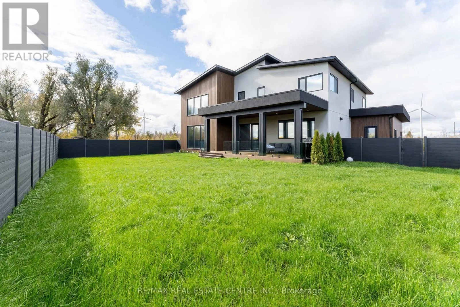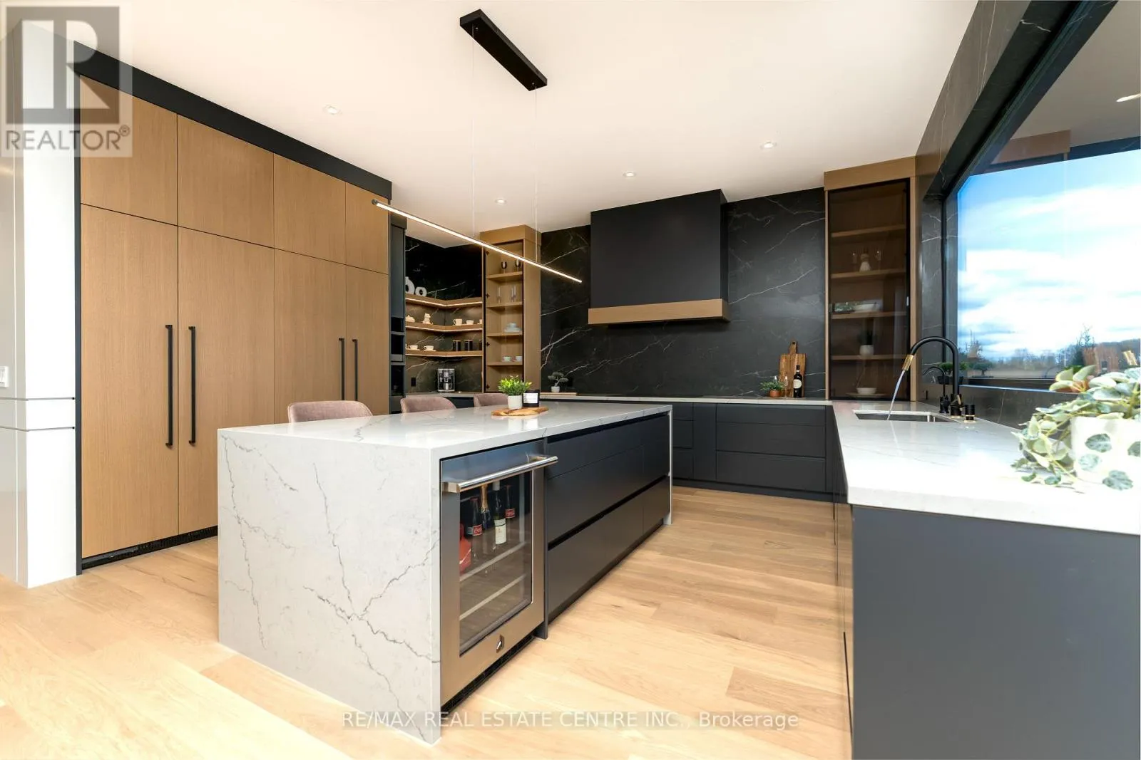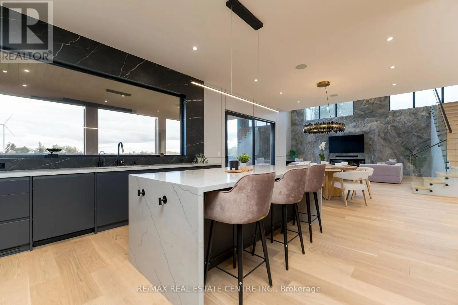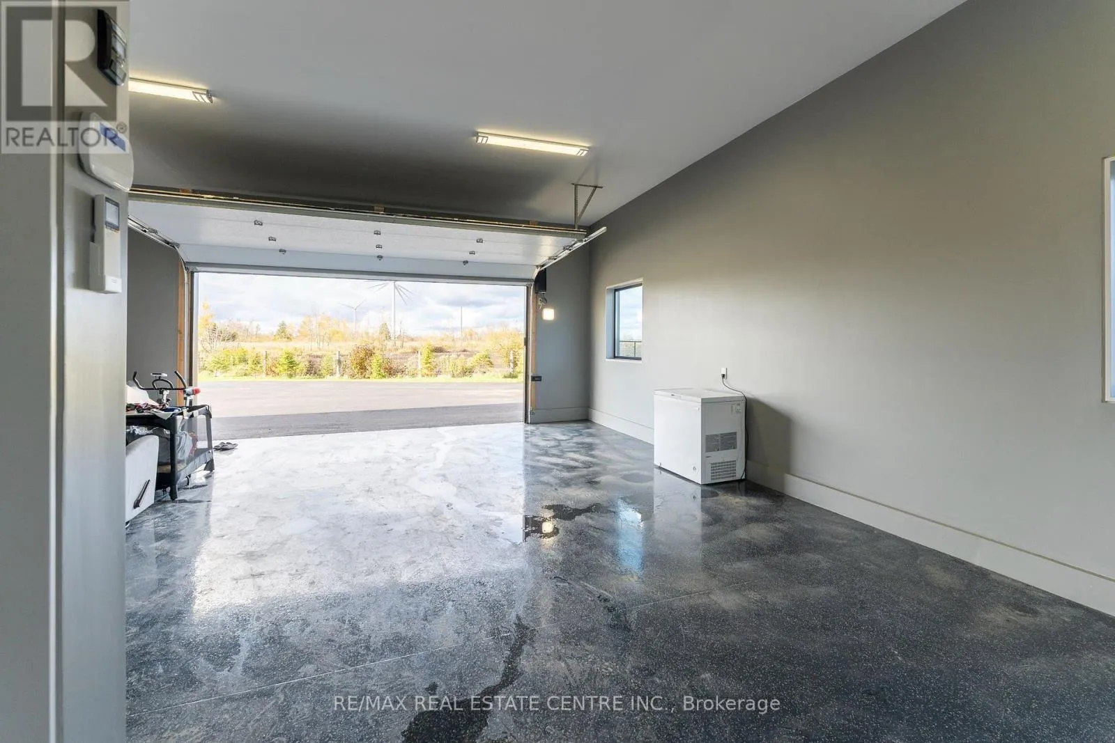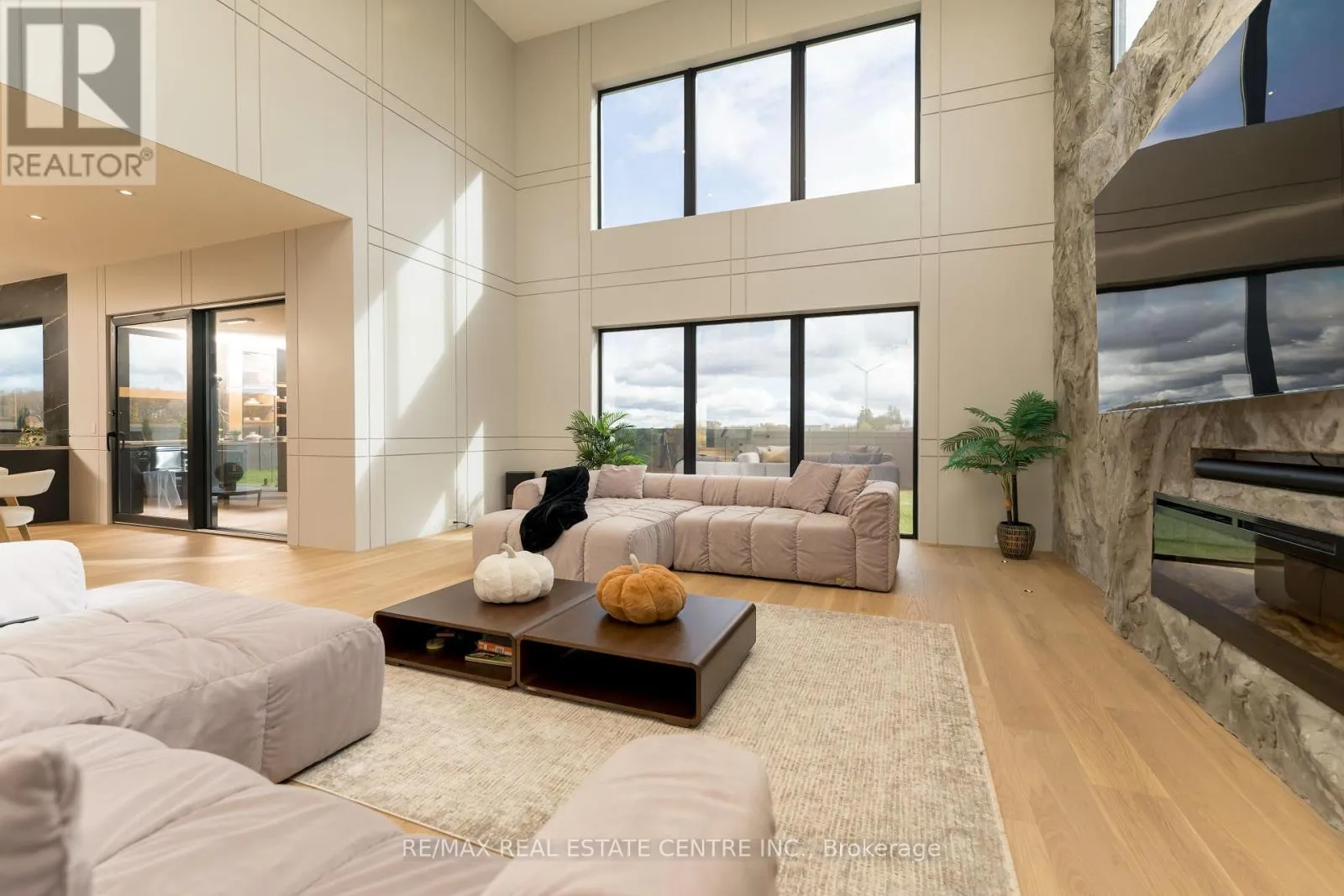 Cross Streets: Hwy 89 & 8th Line. ** Directions: Hwy 89 to 8th Line. Modern Luxury on 2.5 Acres. Discover the epitome of sophistication and architectural excellence. Completed in 2025, this 3,240 sq ft. super-modern luxury estate is a flawless fusion of European design, cutting-edge technology, and elegance-set on 2.5 acres of landscaped privacy. Step inside through grand 8-ft doors and be greeted by 10-ft ceilings, sleek black-framed triple-pane windows, and a dramatic 20-foot rock feature wall with mountain-inspired character. The showstopping grand staircase, adorned with glass railings and in-floor lighting is breathtaking The chef's kitchen is a masterpiece of function and style-featuring quartz waterfall countertops, porcelain backsplash, JennAir appliances, an induction cooktop, and hidden fridge dishwasher for a seamless aesthetic. Integrated cabinet handles, MDF wall paneling, and a walk-in pantry elevate the design. The living space flows outdoors to a covered composite deck and outdoor kitchen, overlooking a backyard with aluminum composite fencing, fire pit with Muskoka chairs, and a dug pond-creating an entertainer's dream. Every element of comfort has been considered-from heated floors and on-demand hot water, to 3 heat pumps, propane furnace, and full spray foam insulation. A Generac generator ensures whole-home reliability. The heated garage is a showpiece featuring epoxy floors, finished ceiling, electric car charger rough-in, and walkout through a custom mudroom. A detached 18'x40' workshop adds additional space for projects or storage. Luxury continues with built-in speakers, full security system, Ring doorbell, Ecobee thermostat, exterior timed lighting, and reflective window film for privacy and efficiency. The primary suite defines modern indulgence with a walk-behind custom closet, built-in organizers, heated shower floors, and wall-mount toilets with flush-mount floor and wall vents. From the composite siding to the magnetic door latches, every inch of this home reflects premium quality and forward-thinking. (id:27476)