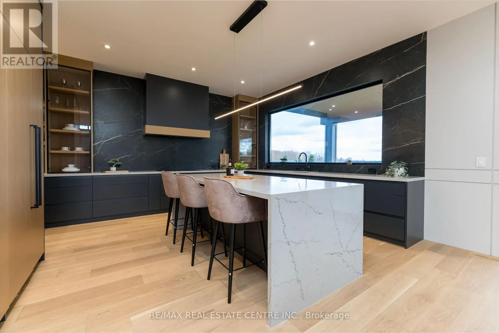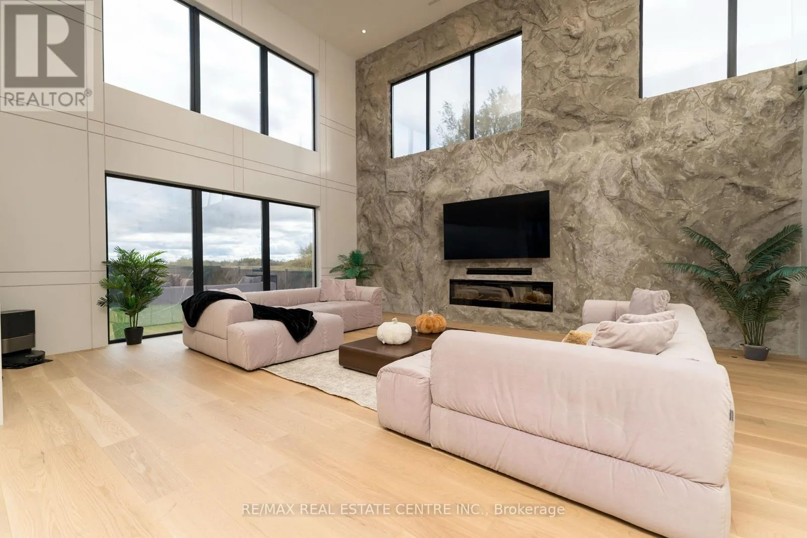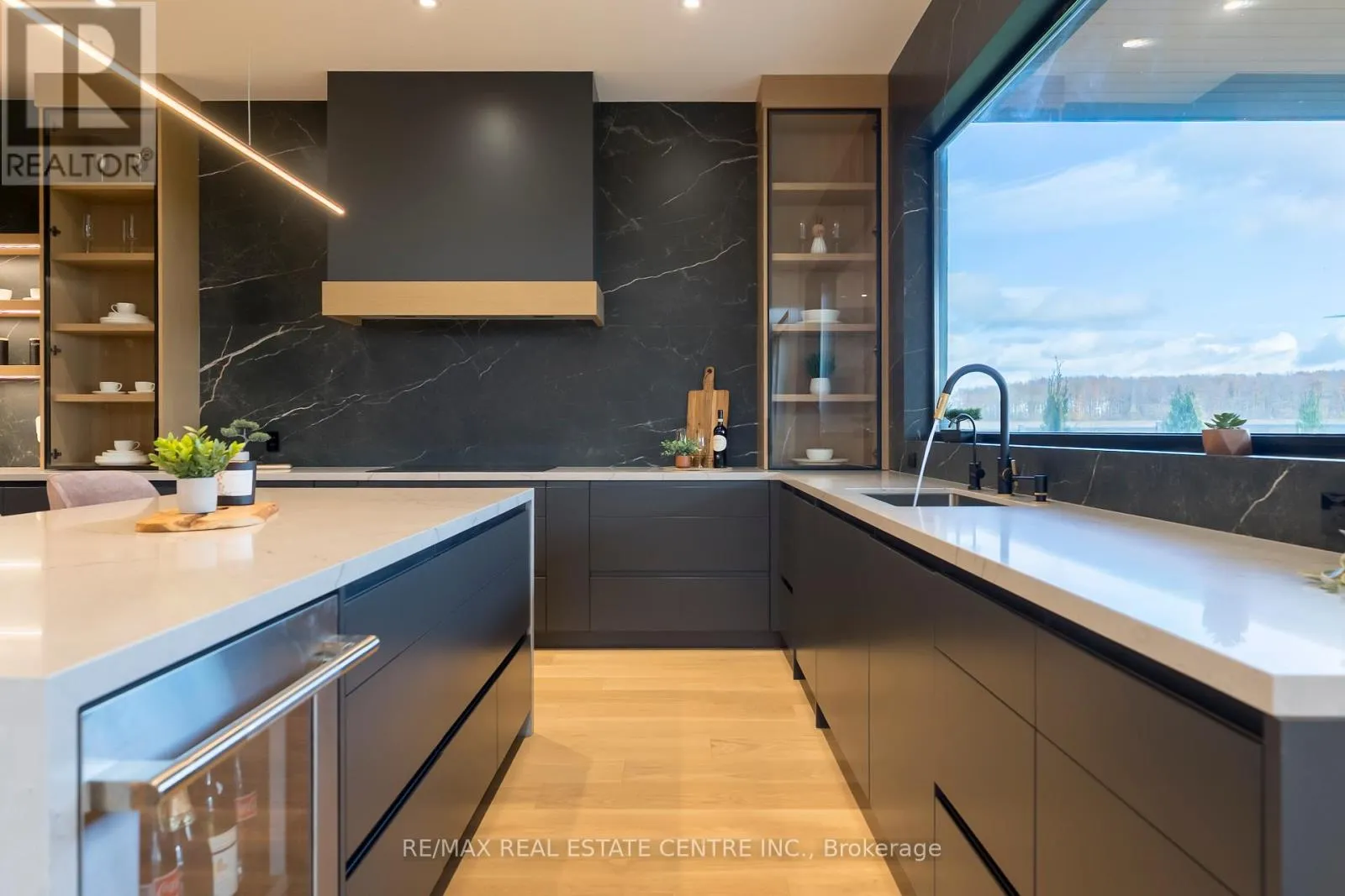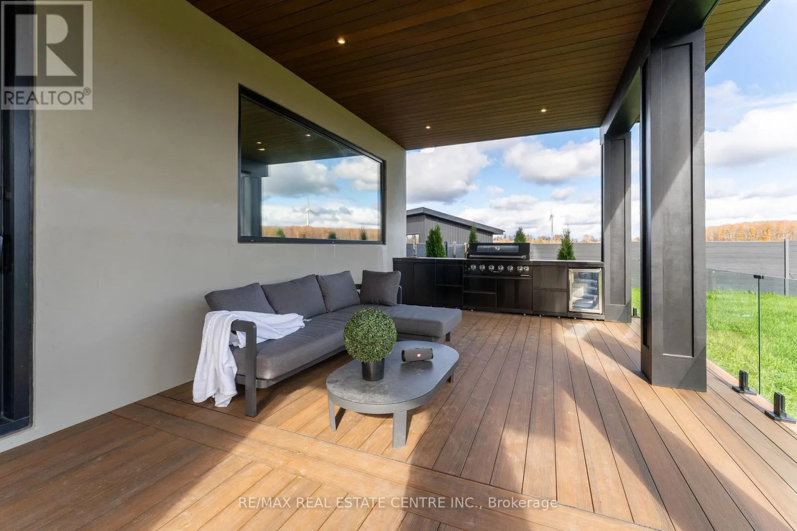 Cross Streets: Hwy 89 & 8th Line. ** Directions: Hwy 89 to 8th Line. Modern Luxury on 2.5 Acres. Discover the epitome of sophistication and architectural excellence. Completed in 2025, this 3,240 sq ft. super-modern luxury estate is a flawless fusion of European design, cutting-edge technology, and elegance-set on 2.5 acres of landscaped privacy. Step inside through grand 8-ft doors and be greeted by 10-ft ceilings, sleek black-framed triple-pane windows, and a dramatic 20-foot rock feature wall with mountain-inspired character. The showstopping grand staircase, adorned with glass railings and in-floor lighting is breathtaking The chef's kitchen is a masterpiece of function and style-featuring quartz waterfall countertops, porcelain backsplash, JennAir appliances, an induction cooktop, and hidden fridge dishwasher for a seamless aesthetic. Integrated cabinet handles, MDF wall paneling, and a walk-in pantry elevate the design. The living space flows outdoors to a covered composite deck and outdoor kitchen, overlooking a backyard with aluminum composite fencing, fire pit with Muskoka chairs, and a dug pond-creating an entertainer's dream. Every element of comfort has been considered-from heated floors and on-demand hot water, to 3 heat pumps, propane furnace, and full spray foam insulation. A Generac generator ensures whole-home reliability. The heated garage is a showpiece featuring epoxy floors, finished ceiling, electric car charger rough-in, and walkout through a custom mudroom. A detached 18'x40' workshop adds additional space for projects or storage. Luxury continues with built-in speakers, full security system, Ring doorbell, Ecobee thermostat, exterior timed lighting, and reflective window film for privacy and efficiency. The primary suite defines modern indulgence with a walk-behind custom closet, built-in organizers, heated shower floors, and wall-mount toilets with flush-mount floor and wall vents. From the composite siding to the magnetic door latches, every inch of this home reflects premium quality and forward-thinking. (id:27476)
