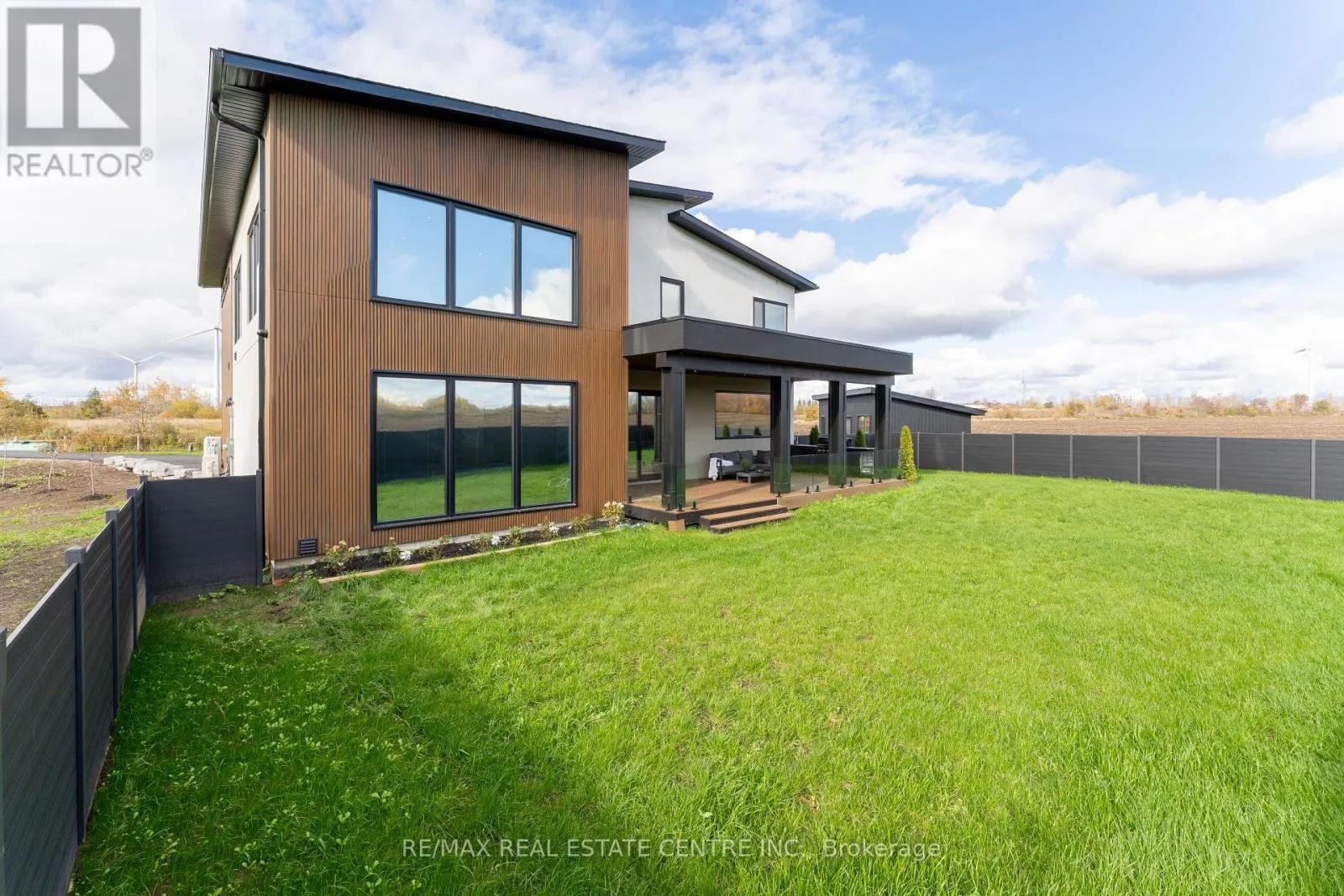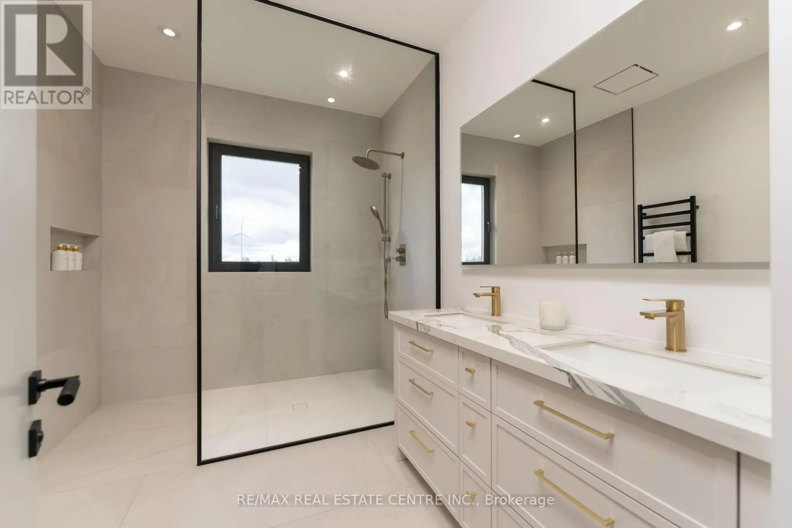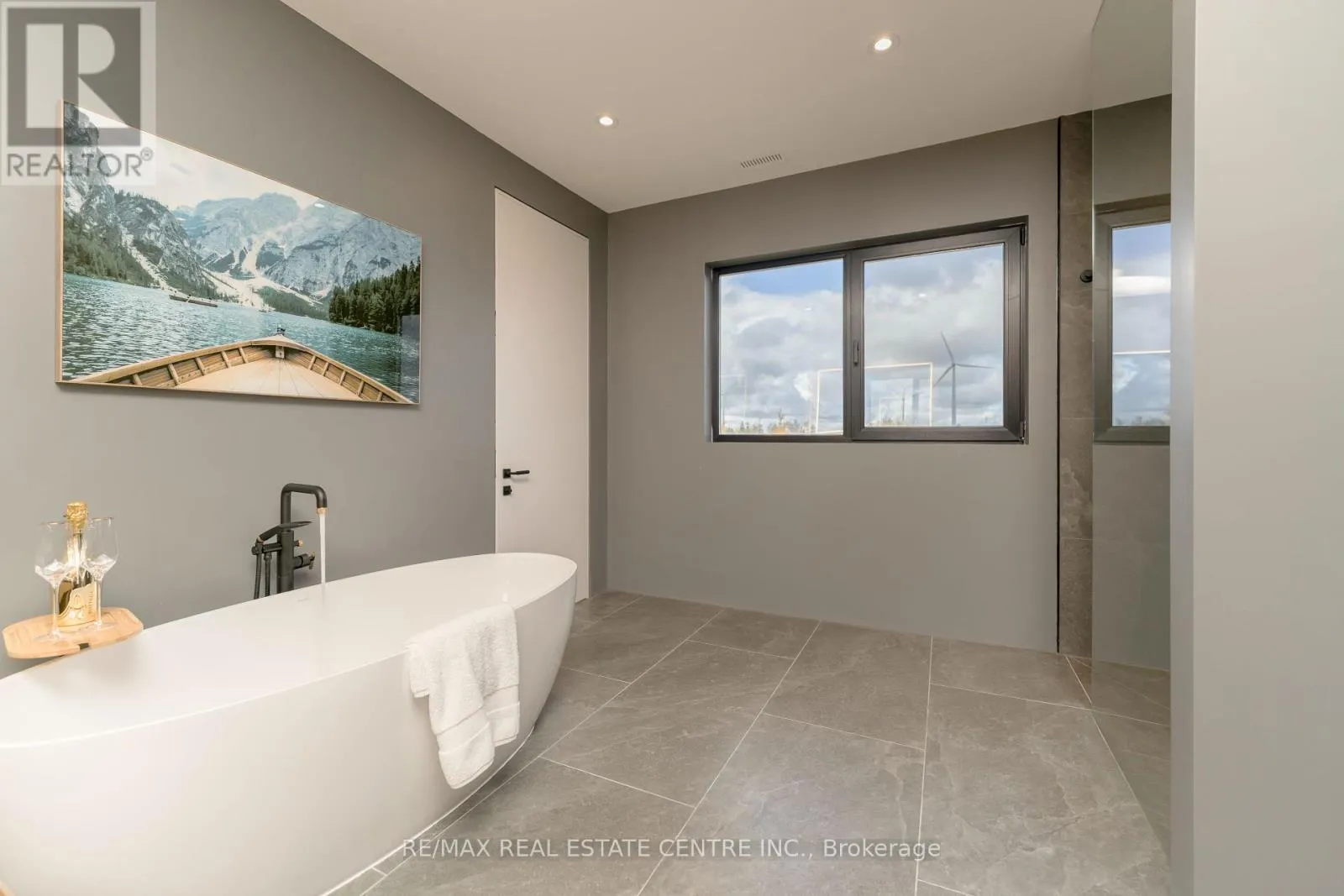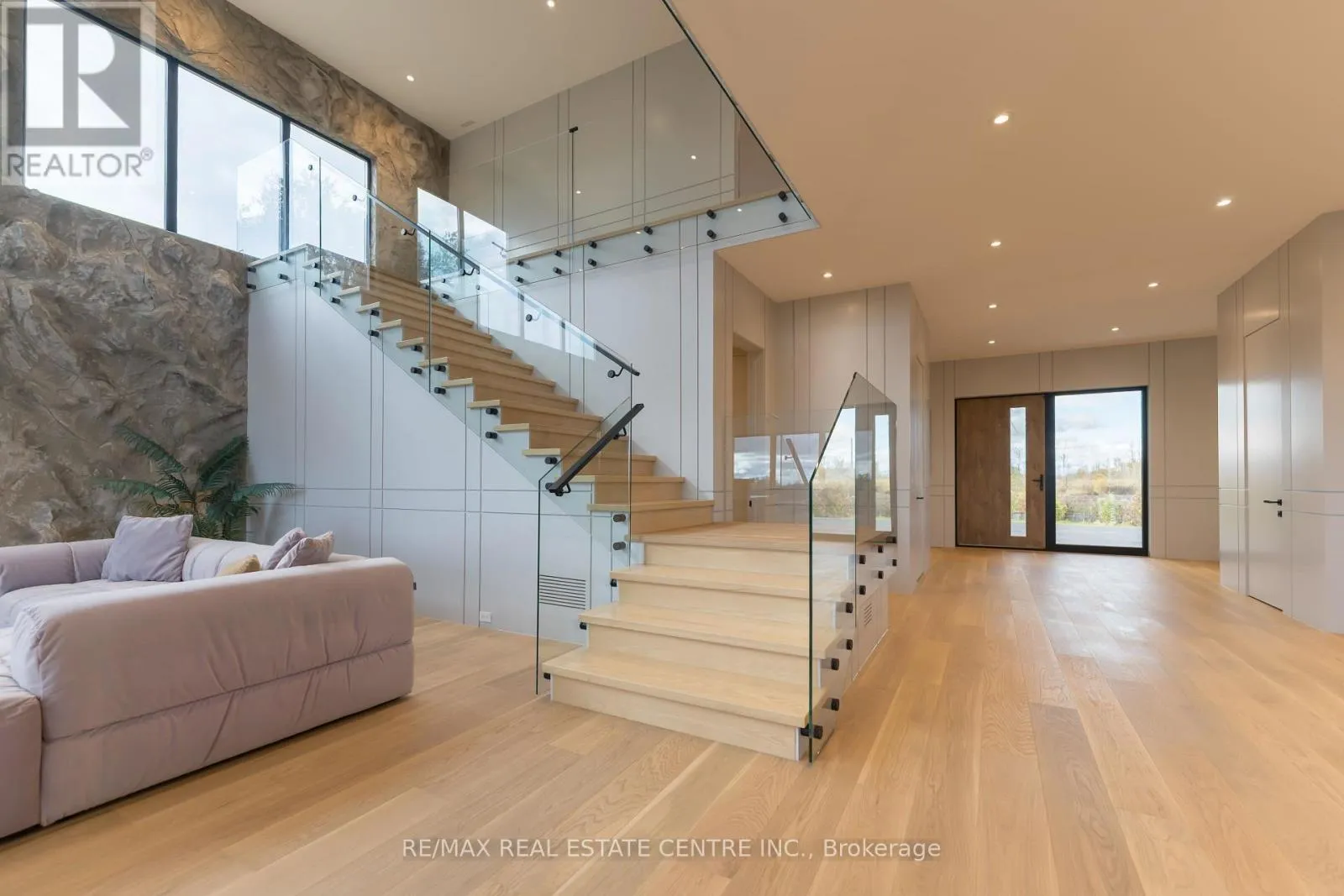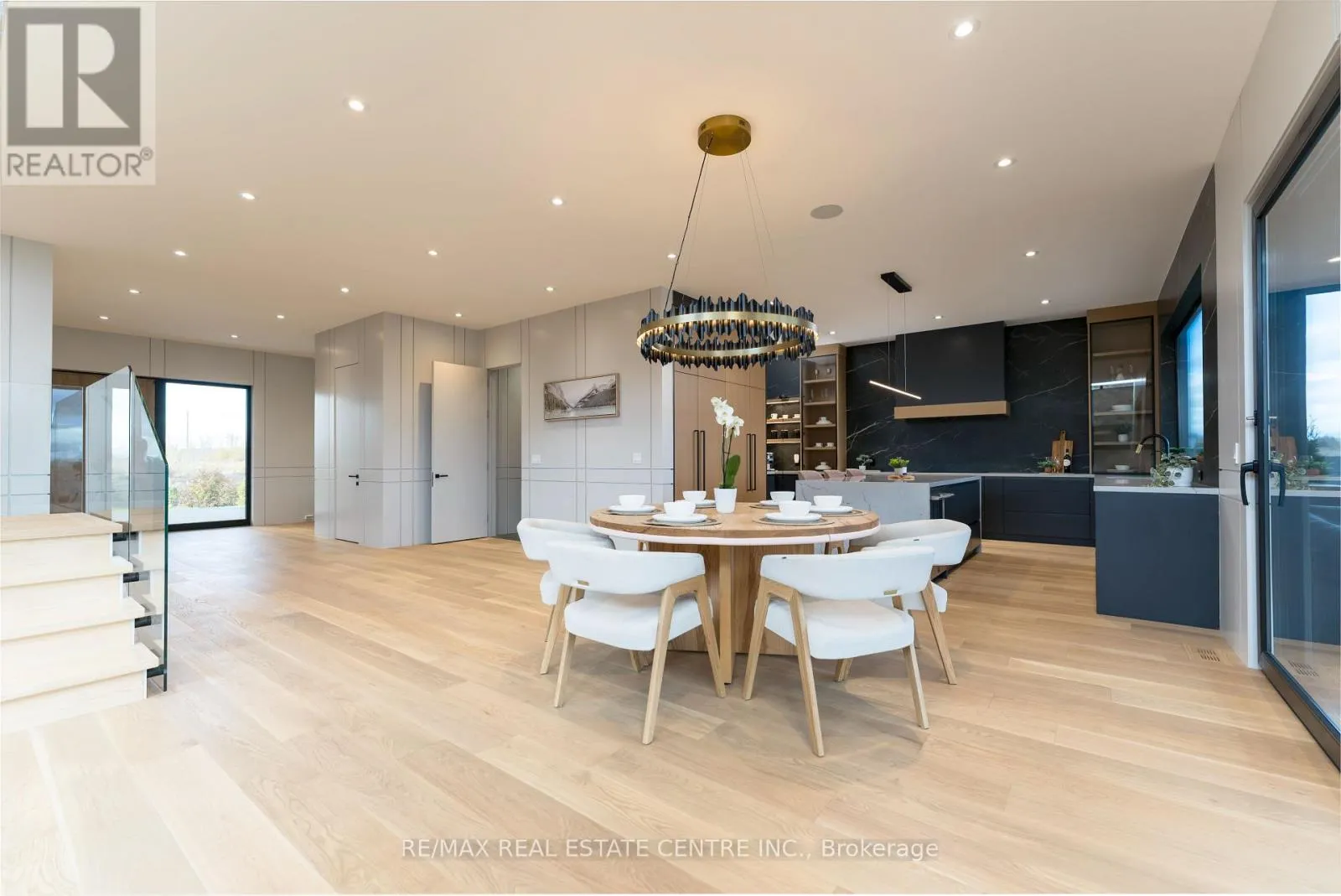 Cross Streets: Hwy 89 & 8th Line. ** Directions: Hwy 89 to 8th Line. Modern Luxury on 2.5 Acres. Discover the epitome of sophistication and architectural excellence. Completed in 2025, this 3,240 sq ft. super-modern luxury estate is a flawless fusion of European design, cutting-edge technology, and elegance-set on 2.5 acres of landscaped privacy. Step inside through grand 8-ft doors and be greeted by 10-ft ceilings, sleek black-framed triple-pane windows, and a dramatic 20-foot rock feature wall with mountain-inspired character. The showstopping grand staircase, adorned with glass railings and in-floor lighting is breathtaking The chef's kitchen is a masterpiece of function and style-featuring quartz waterfall countertops, porcelain backsplash, JennAir appliances, an induction cooktop, and hidden fridge dishwasher for a seamless aesthetic. Integrated cabinet handles, MDF wall paneling, and a walk-in pantry elevate the design. The living space flows outdoors to a covered composite deck and outdoor kitchen, overlooking a backyard with aluminum composite fencing, fire pit with Muskoka chairs, and a dug pond-creating an entertainer's dream. Every element of comfort has been considered-from heated floors and on-demand hot water, to 3 heat pumps, propane furnace, and full spray foam insulation. A Generac generator ensures whole-home reliability. The heated garage is a showpiece featuring epoxy floors, finished ceiling, electric car charger rough-in, and walkout through a custom mudroom. A detached 18'x40' workshop adds additional space for projects or storage. Luxury continues with built-in speakers, full security system, Ring doorbell, Ecobee thermostat, exterior timed lighting, and reflective window film for privacy and efficiency. The primary suite defines modern indulgence with a walk-behind custom closet, built-in organizers, heated shower floors, and wall-mount toilets with flush-mount floor and wall vents. From the composite siding to the magnetic door latches, every inch of this home reflects premium quality and forward-thinking. (id:27476)