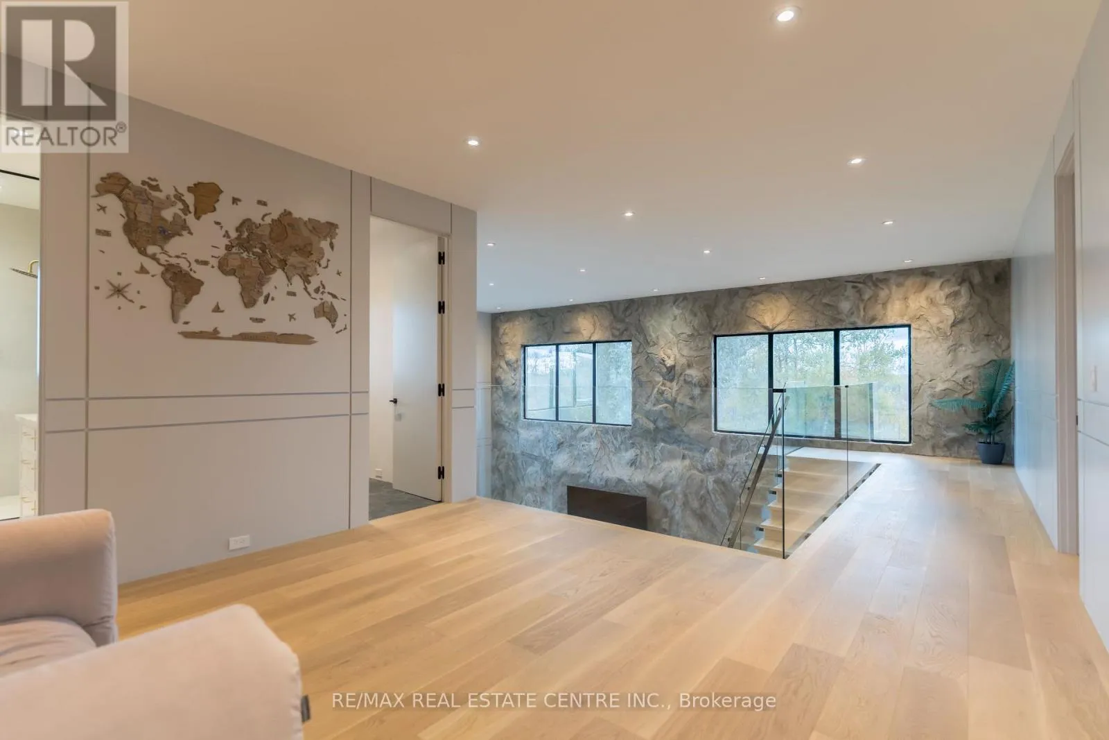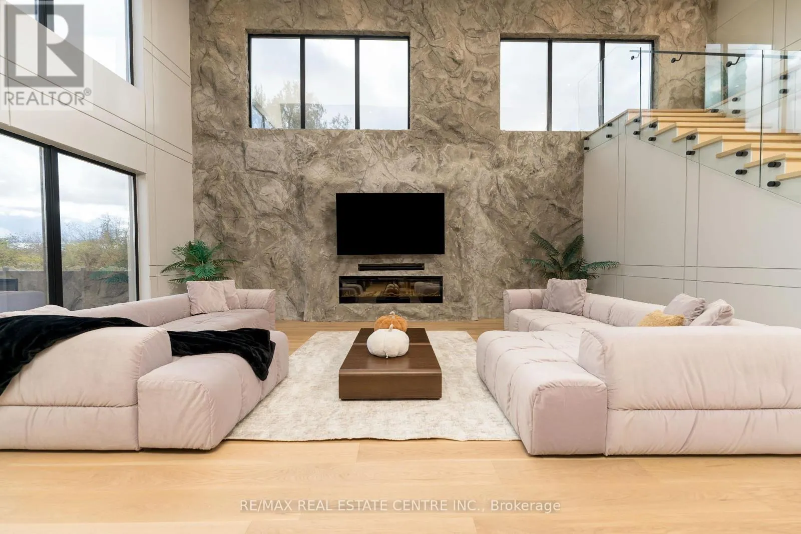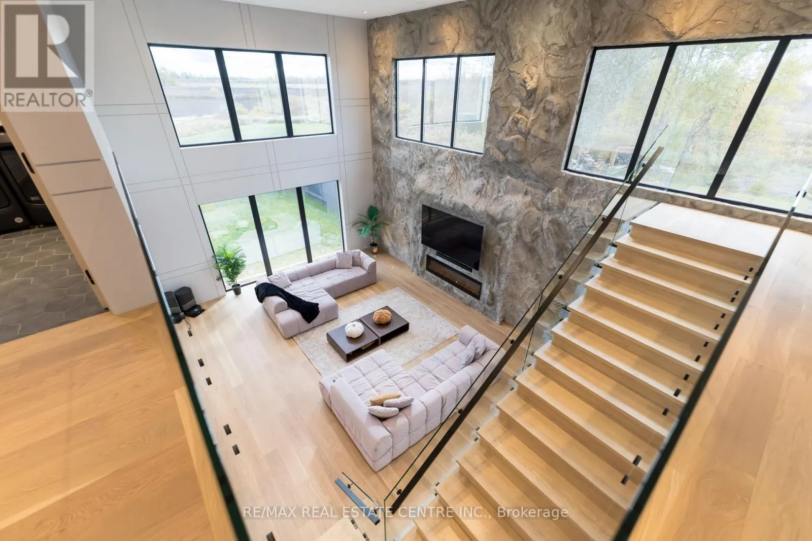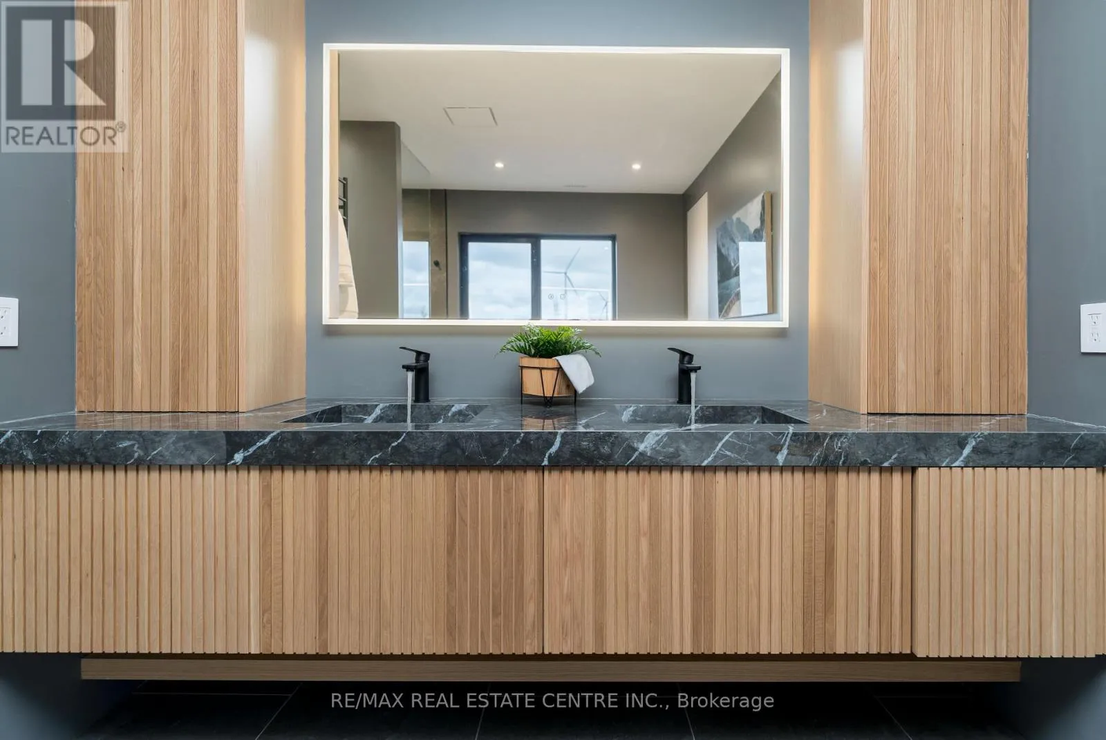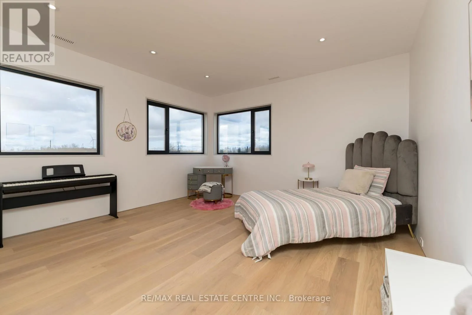 Cross Streets: Hwy 89 & 8th Line. ** Directions: Hwy 89 to 8th Line. Modern Luxury on 2.5 Acres. Discover the epitome of sophistication and architectural excellence. Completed in 2025, this 3,240 sq ft. super-modern luxury estate is a flawless fusion of European design, cutting-edge technology, and elegance-set on 2.5 acres of landscaped privacy. Step inside through grand 8-ft doors and be greeted by 10-ft ceilings, sleek black-framed triple-pane windows, and a dramatic 20-foot rock feature wall with mountain-inspired character. The showstopping grand staircase, adorned with glass railings and in-floor lighting is breathtaking The chef's kitchen is a masterpiece of function and style-featuring quartz waterfall countertops, porcelain backsplash, JennAir appliances, an induction cooktop, and hidden fridge dishwasher for a seamless aesthetic. Integrated cabinet handles, MDF wall paneling, and a walk-in pantry elevate the design. The living space flows outdoors to a covered composite deck and outdoor kitchen, overlooking a backyard with aluminum composite fencing, fire pit with Muskoka chairs, and a dug pond-creating an entertainer's dream. Every element of comfort has been considered-from heated floors and on-demand hot water, to 3 heat pumps, propane furnace, and full spray foam insulation. A Generac generator ensures whole-home reliability. The heated garage is a showpiece featuring epoxy floors, finished ceiling, electric car charger rough-in, and walkout through a custom mudroom. A detached 18'x40' workshop adds additional space for projects or storage. Luxury continues with built-in speakers, full security system, Ring doorbell, Ecobee thermostat, exterior timed lighting, and reflective window film for privacy and efficiency. The primary suite defines modern indulgence with a walk-behind custom closet, built-in organizers, heated shower floors, and wall-mount toilets with flush-mount floor and wall vents. From the composite siding to the magnetic door latches, every inch of this home reflects premium quality and forward-thinking. (id:27476)