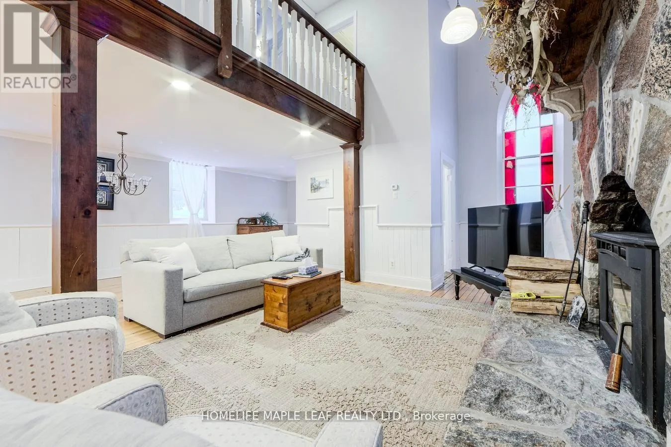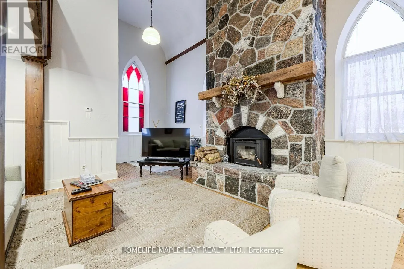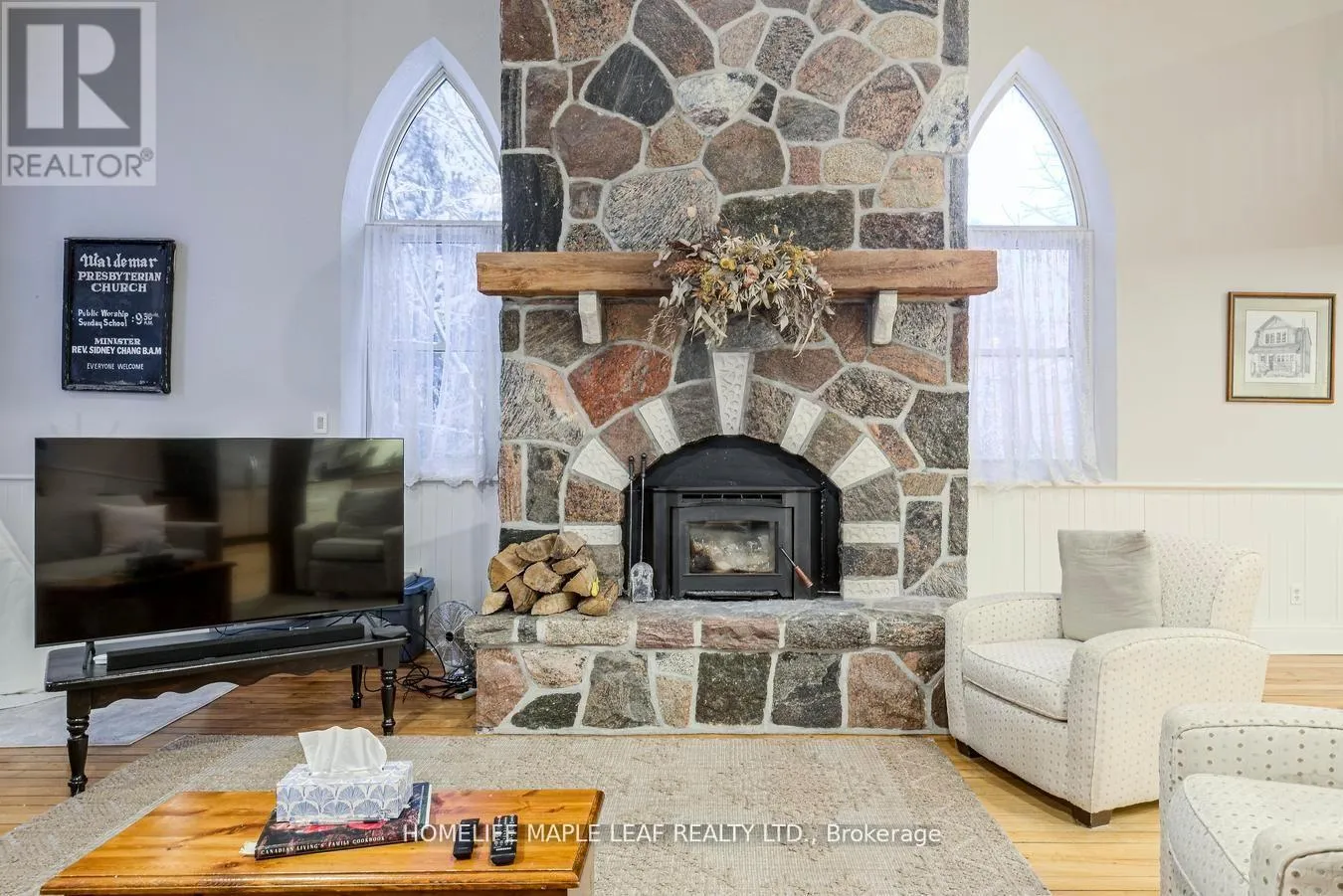 Hwy 109 to 10th Line to Waldemar. Corner of Church and Mill St Welcome to 10 Mill Street in the beautiful Hamlet of Waldemar. This remarkable 1887 church conversion offers exceptional flexibility for multi-generational living across its thoughtfully designed multi-level layout. With 5 bedrooms and 4 bathrooms, the home provides generous shared spaces along with private retreats for families of all sizes. The main floor features a dramatic 17-ft granite fireplace, an inviting open-concept living area, and a spacious gourmet kitchen ideal for everyday living and entertaining. The upper levels include three bedrooms and a private third-level suite, offering comfort and separation for growing or blended households. The lower level presents a complete two-bedroom in-law suite with its own kitchen, wood-burning fireplace, and separate entrance-perfect for extended family, guests, or those seeking additional independent space. Set on a 46 * 143 ft corner lot with greenbelt views, the property also includes a detached two-car garage with a heated basement, a double-wide drive, and parking for up to six vehicles. With over 2,400 sq. ft. of finished living space and close proximity to Orangeville, Grand Valley, and major commuter routes, this unique residence blends character, versatility, and convenience in a sought-after rural community. (id:27476)
