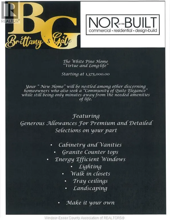 TEXAS RD TO STONE RD TO BRITTANY CRES Introducing The White Pine Home at Brittany's Gate, where luxury and elegance redefine modern living in Amherstburg. This stunning 2 storey, crafted by Nor-Built Construction, offers expansive living on a 75 ft frontage and 157 ft deep executive lot, complete with no rear neighbors for ultimate privacy. Situated on a peaceful cul-de-sac off Texas Road, The White Pine Home design features 4 spacious bedrooms on the second floor including impressive master suite and private deck overlooking rear property, 3 full baths and is ideal for the growing family with impressive 2nd floor loft area leading to additional deck and second office. Main floor perfect for entertaining with open concept layout and three covered porch's. 3 car garage. Located minutes from Amherstburg's vibrant town center, The Birch Home at Brittany's Gate offers an unmatched blend of luxury, tranquility, and convenience. (id:27476)