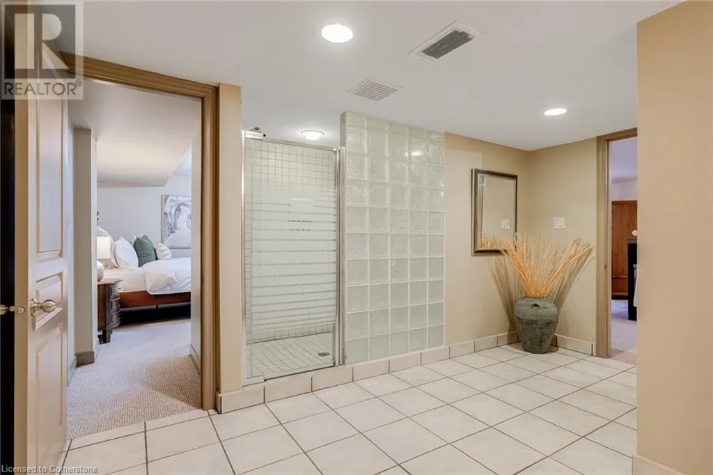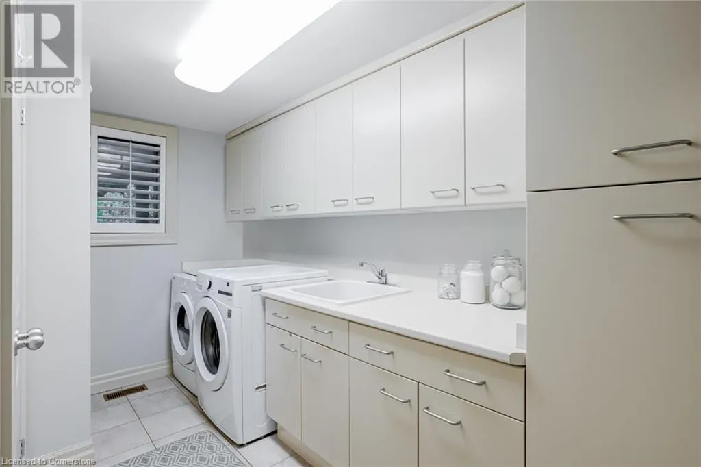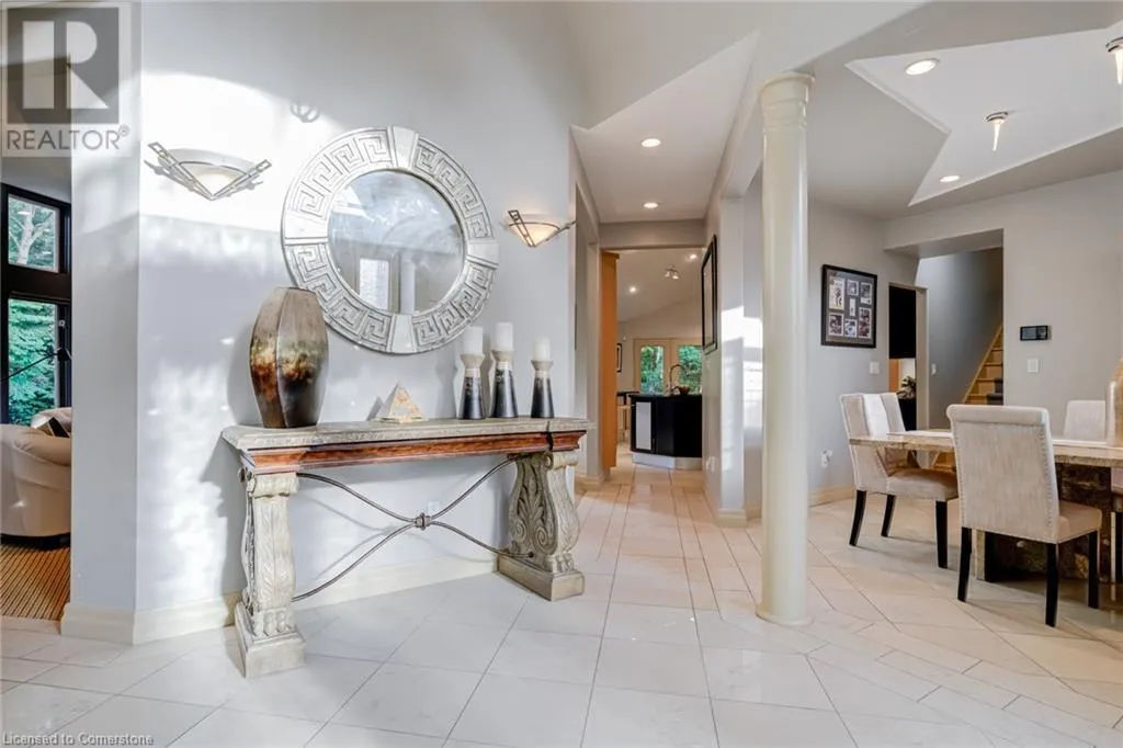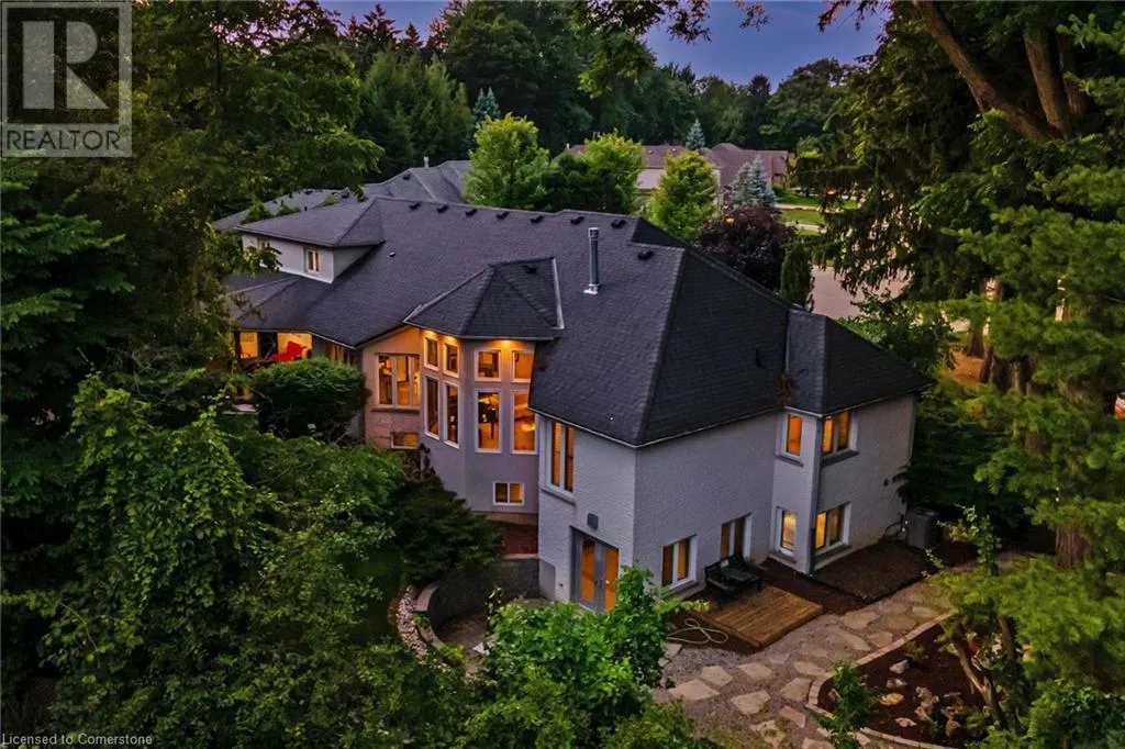 Jerseyville Rd or Sulphur Springs to Lovers Lane - to Harrington Place (Court) Located on a quiet court in Ancasterâs prestigious Oakhill neighbourhood, 34 Harrington Place is a one-of-a-kind bungaloft designed for elegant living and unforgettable entertaining. Set on a pie-shaped, nearly half-acre lot with an impressive 217 ft across the rear, this custom-built Atherton home is surrounded by estate properties and award-winning Trillium gardens that elevate the curb appeal and outdoor experience. Boasting almost 5,000 sqft of impeccably finished living space, this home offers 3+1 bedrooms, 4 full baths, and a layout that perfectly blends everyday comfort with timeless sophistication. The main floor features a gourmet eat-in kitchen with custom cabinetry, cathedral ceiling, and access to a covered porch, flowing into a striking 12-ft great room with gas fireplace and floor-to-ceiling windows overlooking the oasis backyard. A formal dining room provides the ideal setting for hosting family gatherings and elegant dinner parties. The luxurious main-floor primary suite includes a cozy gas fireplace, an oversized walk-in dressing room, and a 5-pc spa-inspired ensuite. Also on the main level: a large private office, a full laundry room, and a stylish guest bath with direct outdoor accessâperfect for rinsing off after a dip in the custom-designed hot and cold soaker pool spa or post-garden clean-up. Upstairs, two well-appointed bedrooms, a full bath, and a versatile loft area offer space for teens, guests, or a second home office. The bright walk-out basement features a 3-sided gas fireplace, spacious recreation room, kitchenette/bar, 4th bedroom, full spa bath, gym area, and abundant storageâideal for in-laws or extended family. The backyard is a showstopper: private, lush, and tailored for gatherings large or small. Multiple seating and dining areas, a covered porch, and the signature pool spa create an outdoor sanctuary youâll enjoy in every season. This is more than a homeâitâs a statement of lifestyle in one of Ancasterâs most exclusive enclaves. (id:27476)