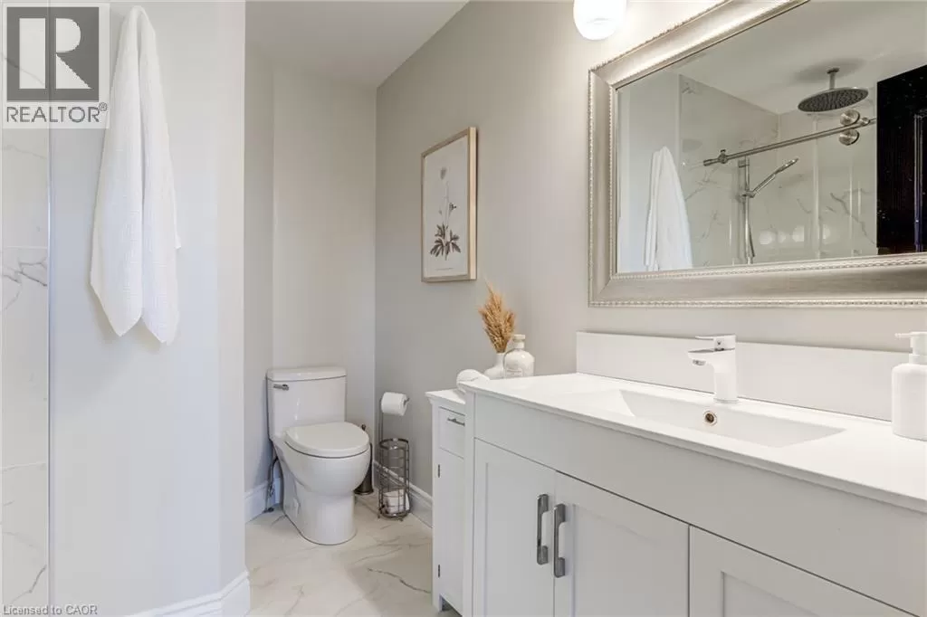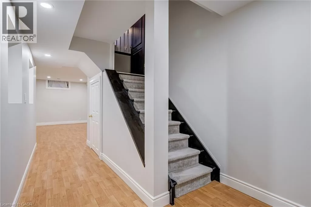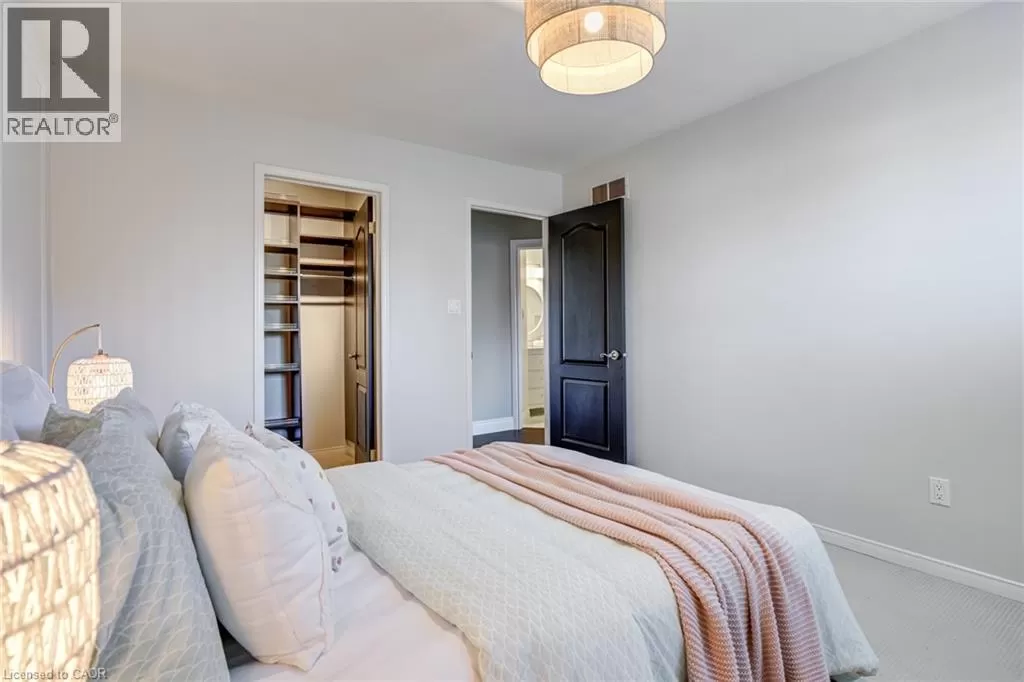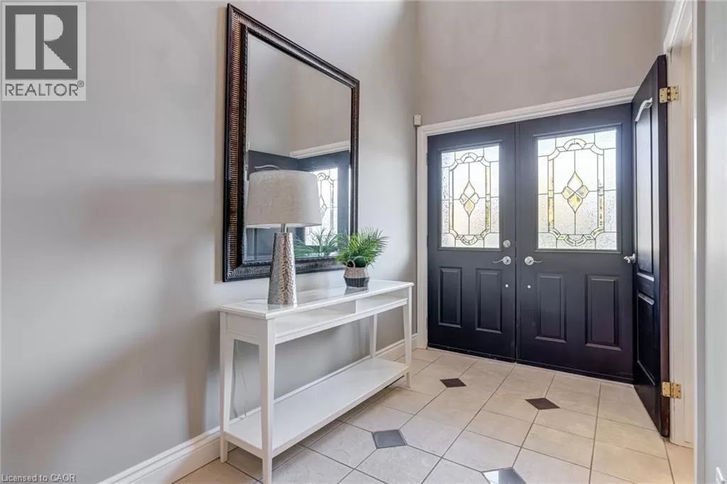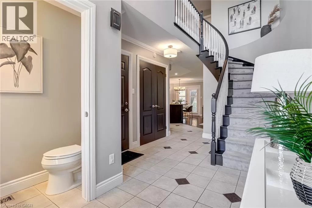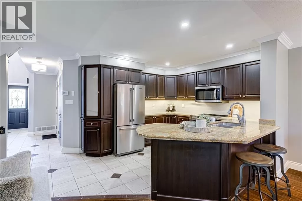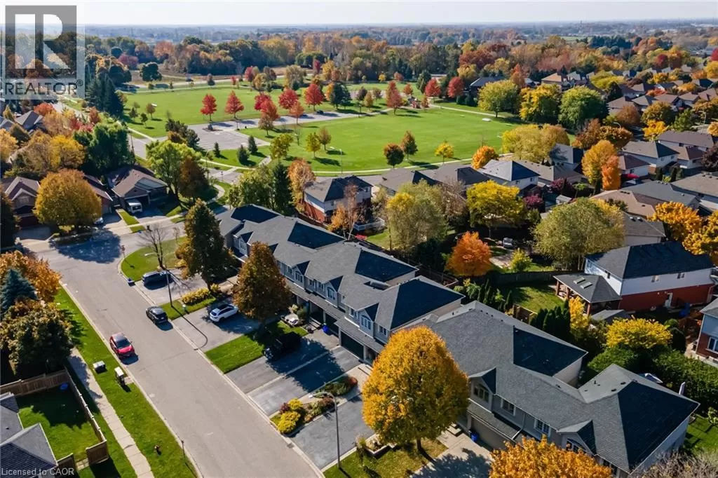highway 403 to Fiddlers Green to Liam Drive to Foxborough Dr Executive end unit freehold townhome in a mature and family friendly Ancaster neighbourhood just steps to James Smith Park and only a minute drive from highway access. This stunning home offers more than 1600 square feet above grade plus a fully finished basement. Opulent double doors enter into a large two-storey foyer with double coat closet, inside entry from the garage and a main floor powder room. An open concept gourmet kitchen and living area is a fantastic entertaining space offering a gas fireplace, granite counters and stainless-steel appliances. French doors provide access to a fully fenced and beautifully landscaped yard with mature cedar trees providing plenty of privacy while you relax on a large deck with pergola. Additional features include a gas line for BBQ, side access to the front of the home and an entry door into the designer 1.5 car garage with built-in shelving and workbench. The recently renovated upper level offers 3 spacious bedrooms with two walk-in closets and unique to the townhomes in this area, there are two brand new full bathrooms with stylish finishes including a primary ensuite with glass walk-in shower. A fully finished basement provides a fantastic recreation space, a laundry room with sink, cold room, and a cedar storage closet. This wonderful home has excellent curb appeal and it is centrally located close to great schools, as well as all shopping amenities. (id:27476)
