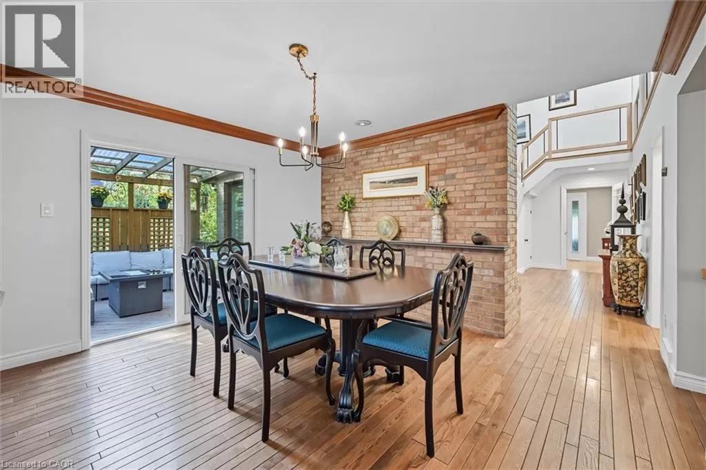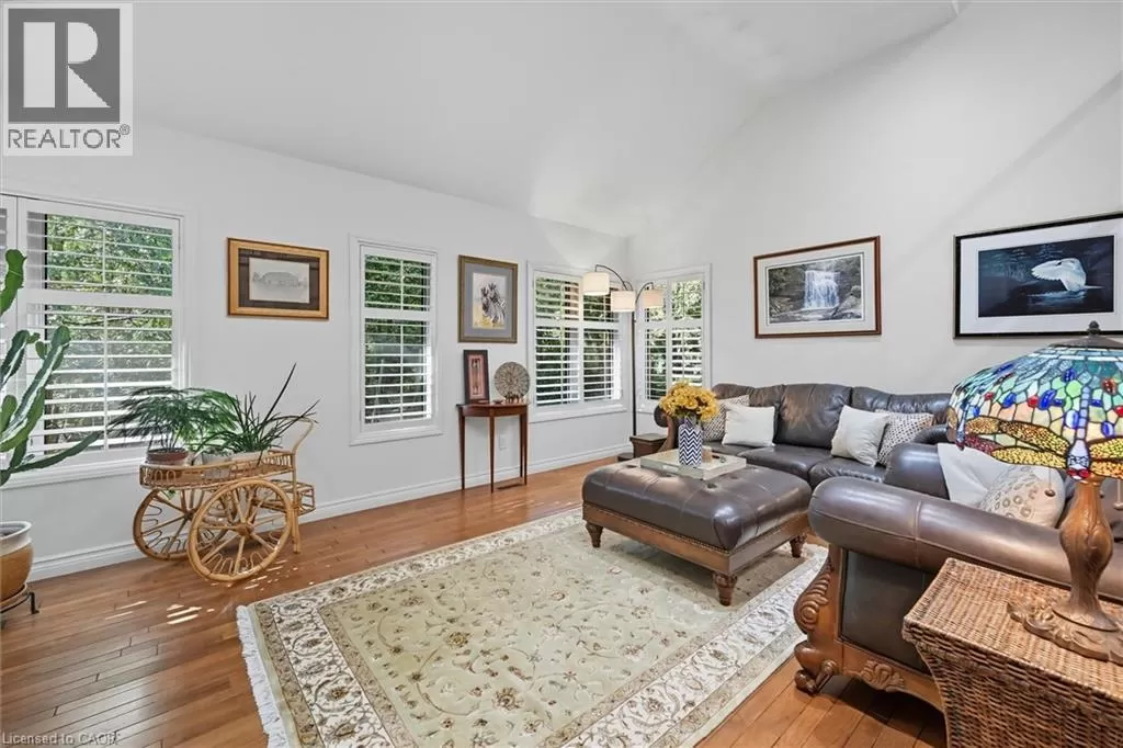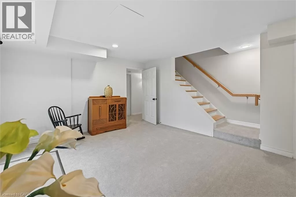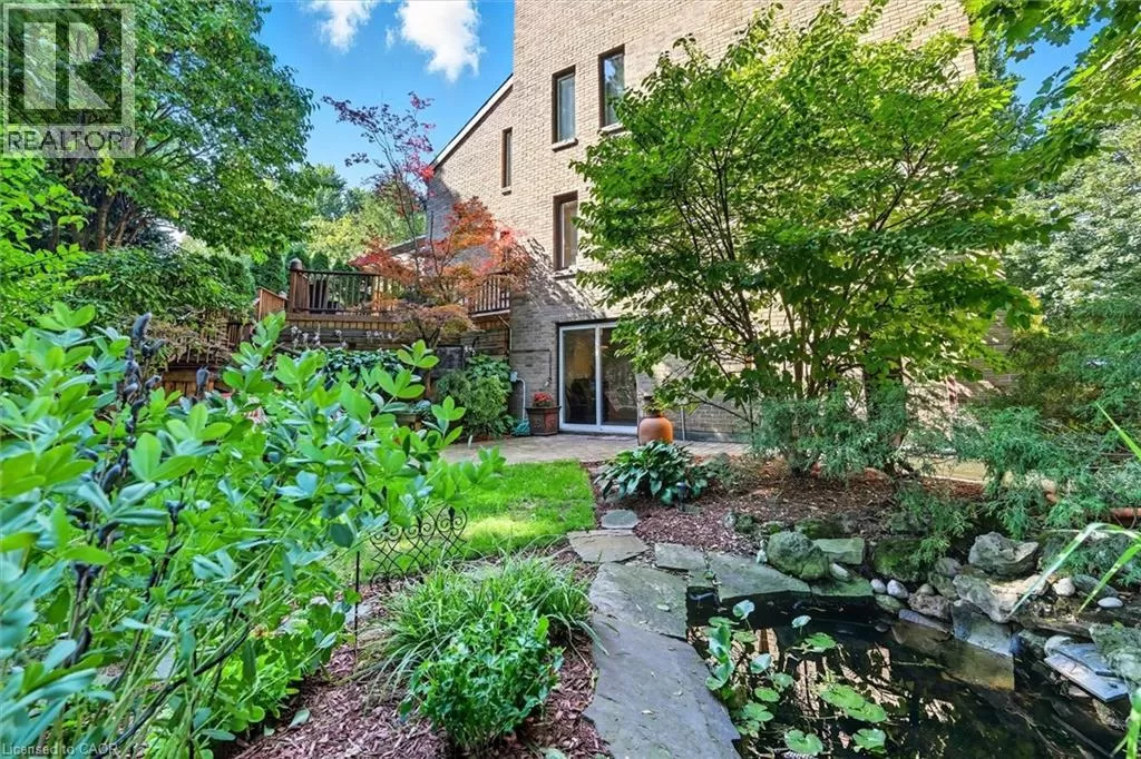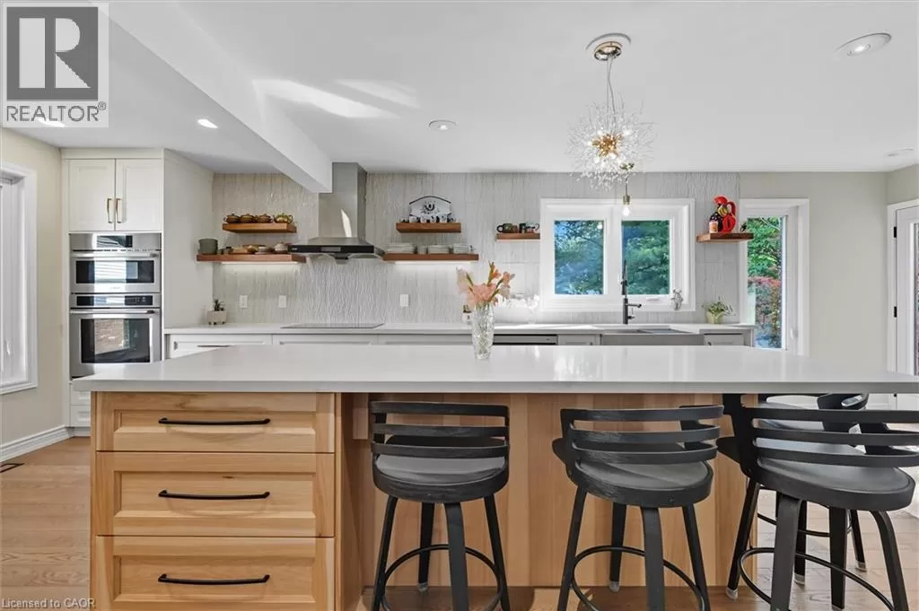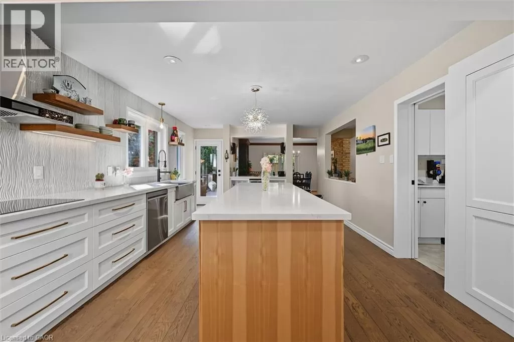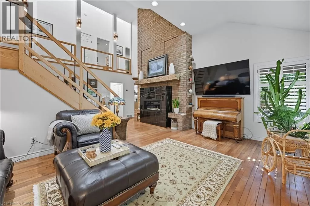 South on Southcote Road and right on John Frederick Dr. and right on Greenbriar Road. In Ancasterâs sought-after Harmony Hall neighbourhood, this distinctive split -gable architectural design offers a blend of modern comfort and timeless character with approximately 3500 square feet of finished living space with an in-law suite in the walk-out basement on a beautifully private, tree-framed lot. Renovated extensively in 2022, this three-bedroom, three-bath home features a flexible layout that adapts easily to todayâs lifestyle. The inviting entry opens into a dramatic living space with soaring vaulted ceilings, a new gas fireplace with full-height brick surround, and expansive windows that frame views of the mature gardens. The enlarged kitchen was extended seven feet to create an open and functional design, finished with custom cabinetry including a coffee bar, a 10-foot island, stone counters, and premium KitchenAid appliances. Hardwood flooring runs throughout, replacing carpeted areas, while custom oak treads and railings add timeless detail to the stairs and upper level, where knee walls and plaster barriers were removed to create brighter, open sightlines. The primary suite was completely reimagined with built-in closet cabinetry and a spa-inspired ensuite featuring heated floors, a built-in toilet/bidet, and a glass shower with skylight. A new guest bathroom and laundry area were also added with custom cabinets and high-end finishes. The walkout lower level was redesigned as an in-law suite to include an additional bathroom, kitchen, and reclaimed storage areas, upgrades include a new glass front door, rear entrance, and garage doors, a covered patio with gas fireplace, rebuilt retaining walls in the backyard, and landscaped gardens with stone walkways, water features, and shaded seating areas. With an attached double garage, wide interlock driveway, and every major detail thoughtfully updated, this property combines architectural distinction, privacy, and modern practicality, all within minutes of shops, dining, golf, parks, and the highway. (id:27476)