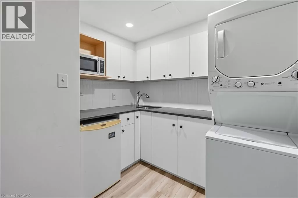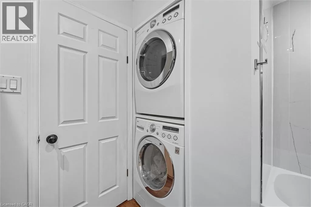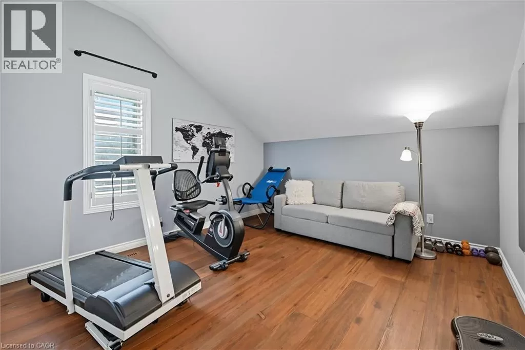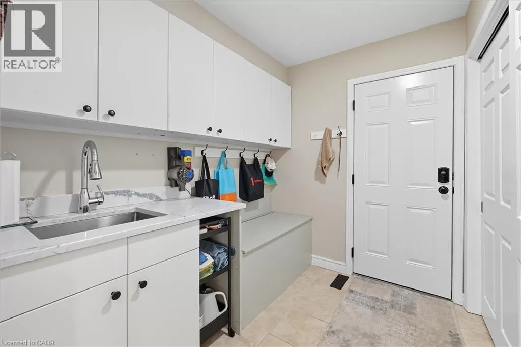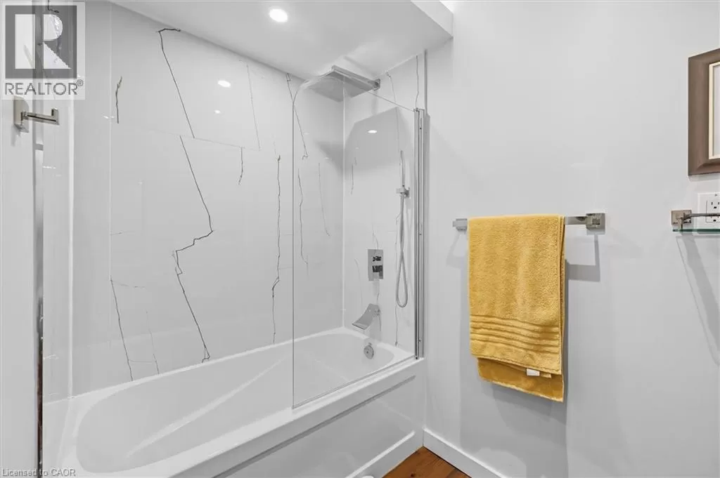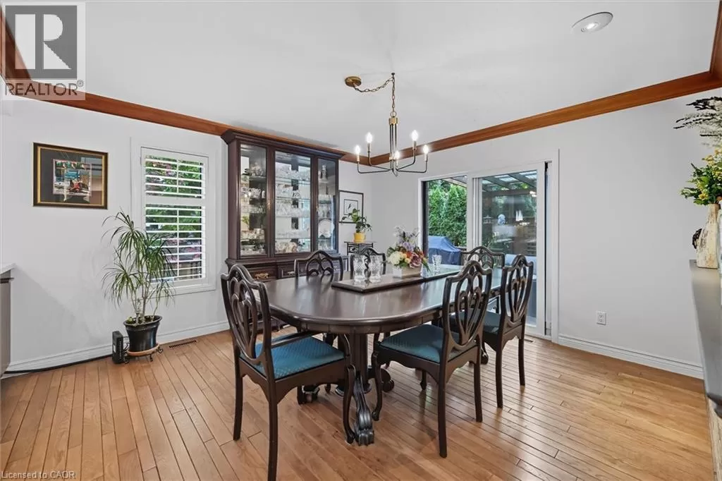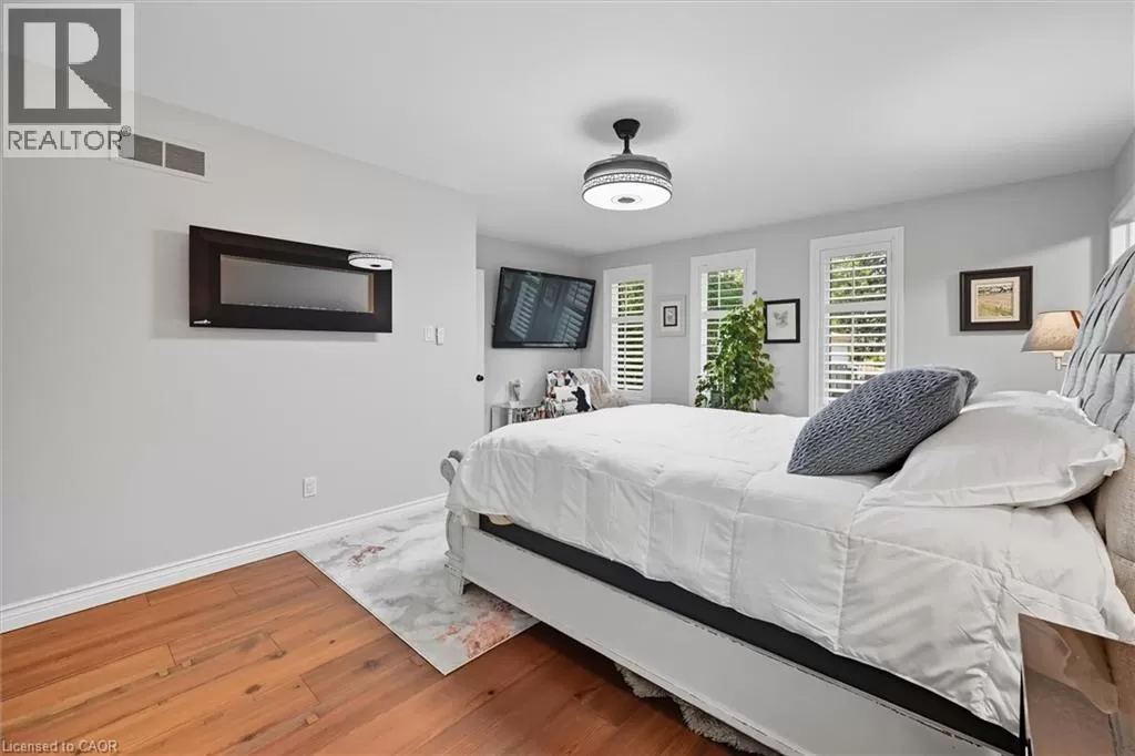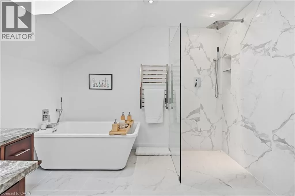 South on Southcote Road and right on John Frederick Dr. and right on Greenbriar Road. In Ancasterâs sought-after Harmony Hall neighbourhood, this distinctive split -gable architectural design offers a blend of modern comfort and timeless character with approximately 3500 square feet of finished living space with an in-law suite in the walk-out basement on a beautifully private, tree-framed lot. Renovated extensively in 2022, this three-bedroom, three-bath home features a flexible layout that adapts easily to todayâs lifestyle. The inviting entry opens into a dramatic living space with soaring vaulted ceilings, a new gas fireplace with full-height brick surround, and expansive windows that frame views of the mature gardens. The enlarged kitchen was extended seven feet to create an open and functional design, finished with custom cabinetry including a coffee bar, a 10-foot island, stone counters, and premium KitchenAid appliances. Hardwood flooring runs throughout, replacing carpeted areas, while custom oak treads and railings add timeless detail to the stairs and upper level, where knee walls and plaster barriers were removed to create brighter, open sightlines. The primary suite was completely reimagined with built-in closet cabinetry and a spa-inspired ensuite featuring heated floors, a built-in toilet/bidet, and a glass shower with skylight. A new guest bathroom and laundry area were also added with custom cabinets and high-end finishes. The walkout lower level was redesigned as an in-law suite to include an additional bathroom, kitchen, and reclaimed storage areas, upgrades include a new glass front door, rear entrance, and garage doors, a covered patio with gas fireplace, rebuilt retaining walls in the backyard, and landscaped gardens with stone walkways, water features, and shaded seating areas. With an attached double garage, wide interlock driveway, and every major detail thoughtfully updated, this property combines architectural distinction, privacy, and modern practicality, all within minutes of shops, dining, golf, parks, and the highway. (id:27476)