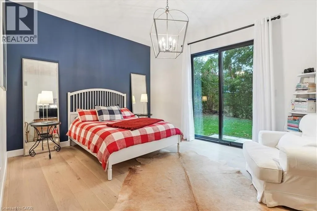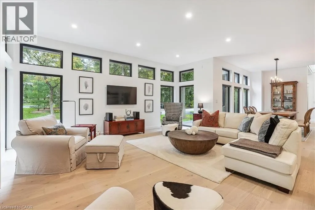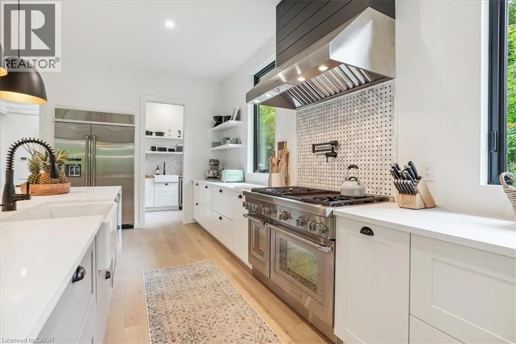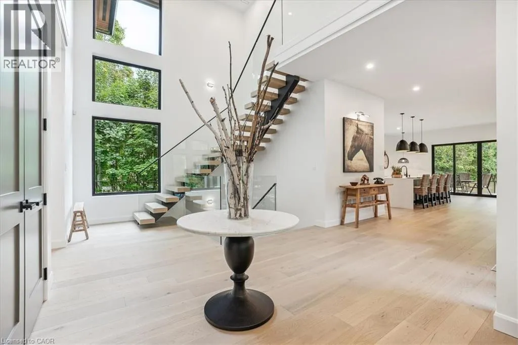 Wilson St E to Sulphur Springs Rd, Left on Mansfield Dr to Reding Rd. Modern prairie-style architecture in the heart of historic Ancaster. This recently completed two-storey custom house, features 5 bedrooms, 5+1 bathrooms with heated floors, a luxurious primary suite with a walk-through closet, and a main floor guest/in-law suite. Perfect for any culinary enthusiast, the gourmet kitchen includes a spacious waterfall quartz island, high-end appliances, two dishwashers, and a butler's pantry. This contemporary property offers two laundry rooms, three gas fireplaces, a cedar sauna, a heated salt water 32'x16' rectangular pool, and professionally designed gardens backing on Mansfield Park. There are integrated ceiling speakers, alarm system, security cameras, and whole house Cat6 wired network. Electrolux wine cooler in butler's pantry is a practical luxury as well as central vacuum and towel warmers and heated floors in all bathrooms. Large expanses of glass and an open floor plan allow for enjoyable circulation and a tranquil connection to nature throughout the house. Walking distance to restaurants, arts centre, scenic Ancaster Mill, Dundas Valley conservation area, and hiking trails, renowned Hamilton Golf and Country Club, all-season tennis courts, library, shopping, schools, and other amenities. Close proximity to McMaster University and major highways. (id:27476)