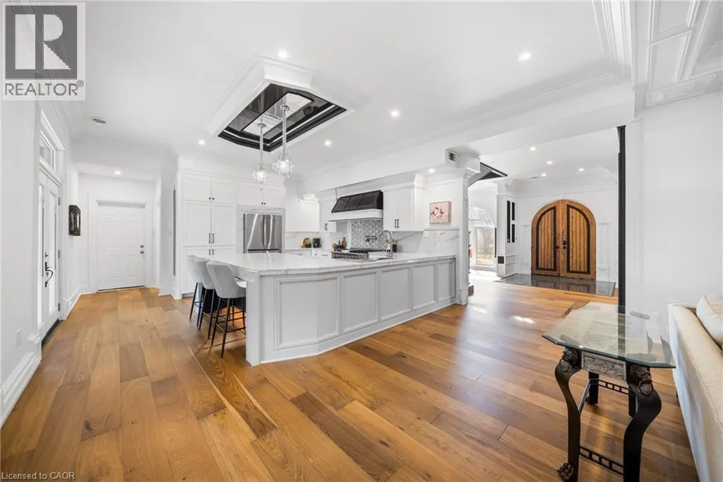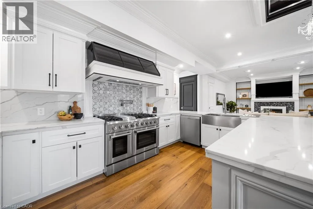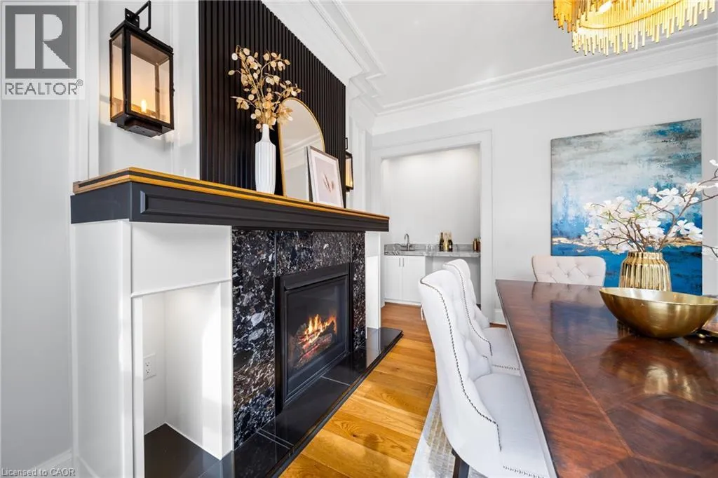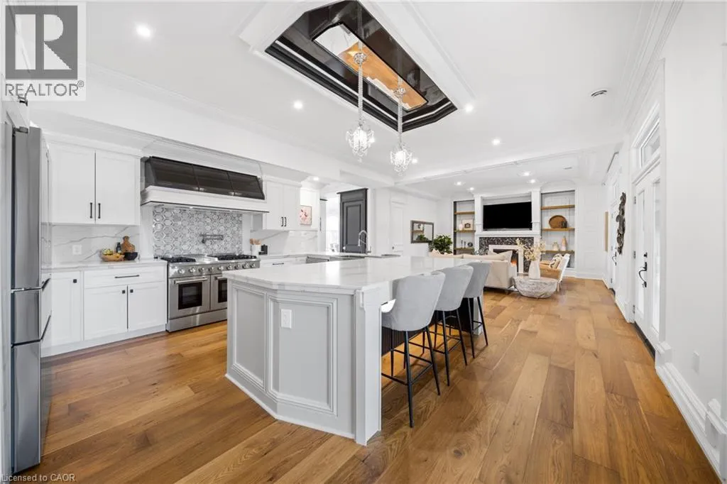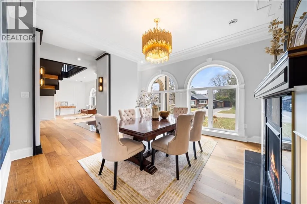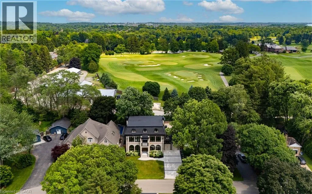 Wilson Street to Cameron Nestled in scenic Ancaster Village, this French Chateau-inspired residence offers over 7,000 sqft of luxury backing onto the iconic Hamilton Golf Club, with sweeping views of one of Canadaâs premier courses. This 3-storey masterpiece features 4 beds, 7 baths, 10.5â soaring ceilings, custom millwork, and refined European design. The main floor is designed for entertaining, showcasing a gourmet kitchen with high-end appliances, quartz counters, custom cabinetry and a large island. Three sets of double doors open to a covered outdoor dining area. A formal dining room with chandelier, fireplace and wet bar adds elegance, while the family room with built-ins and fireplace connects seamlessly to the landscaped yard. Second level is dedicated to ultimate comfort, 3 spacious bedrooms each with private baths & walk-in closets. Primary suite boasts gorgeous stone fireplace, custom walk-in closet & spa-like ensuite with freestanding tub, rainfall shower, glass shower, and private terrace overlooking the golf course. Third level serves as a secluded refuge with spacious living room, large bedroom, full bath & kitchenette. A walk-out portico terrace offers panoramic views of the golf course. Lower level features 9' ceilings, a recroom, fitness room, family room with another fireplace, full bathroom, heated floors & a kitchenette. A wine cellar completes your chateau experience. The property boasts a cedar-ceiling covered deck, outdoor gas fireplace, mature trees for privacy, 5 fireplaces, 3 dishwashers, Terrazzo concrete driveway & large tandem garage with 4-post car lift for the car enthusiast. Crafted with an ICF foundation and whole-home hydronic in-floor heating across all four levels, the residence delivers year-round comfort, remarkably low operating costs, and a reduced carbon footprintâluxury thatâs as smart as it is beautiful. Close to fine dining, shopping, trails, and conservation areas, this property is a rare haven of sophistication, luxury, and timeless elegance. (id:27476)