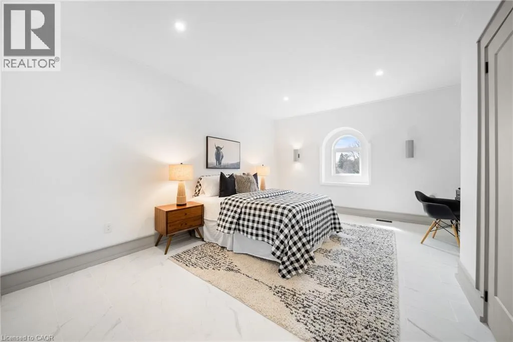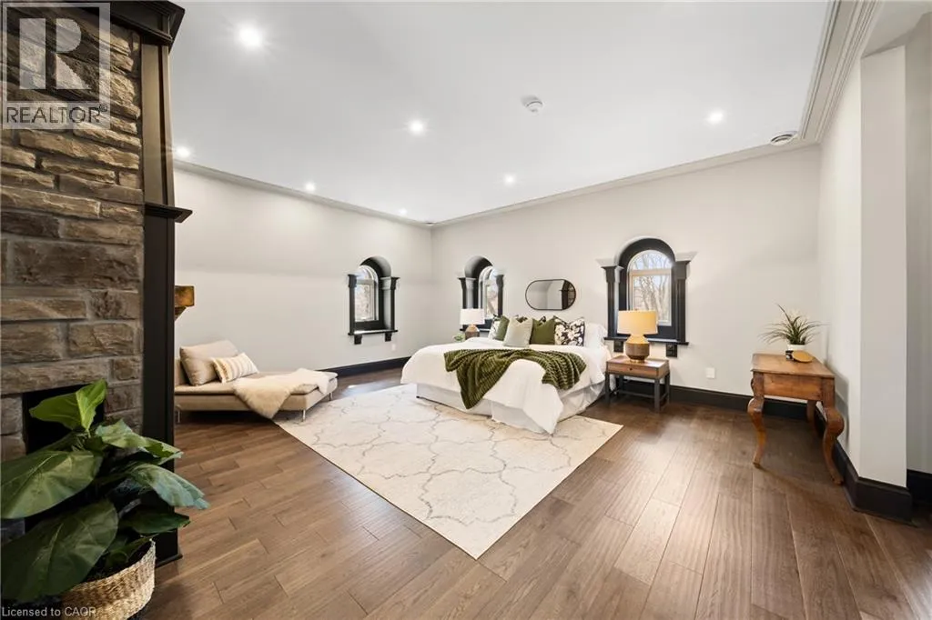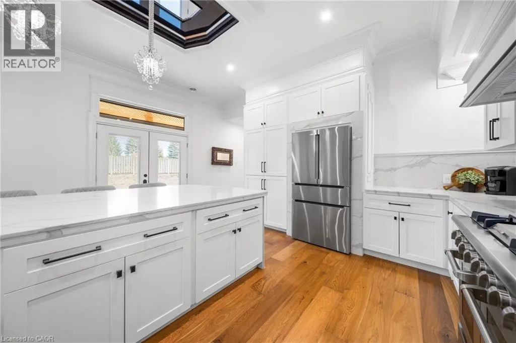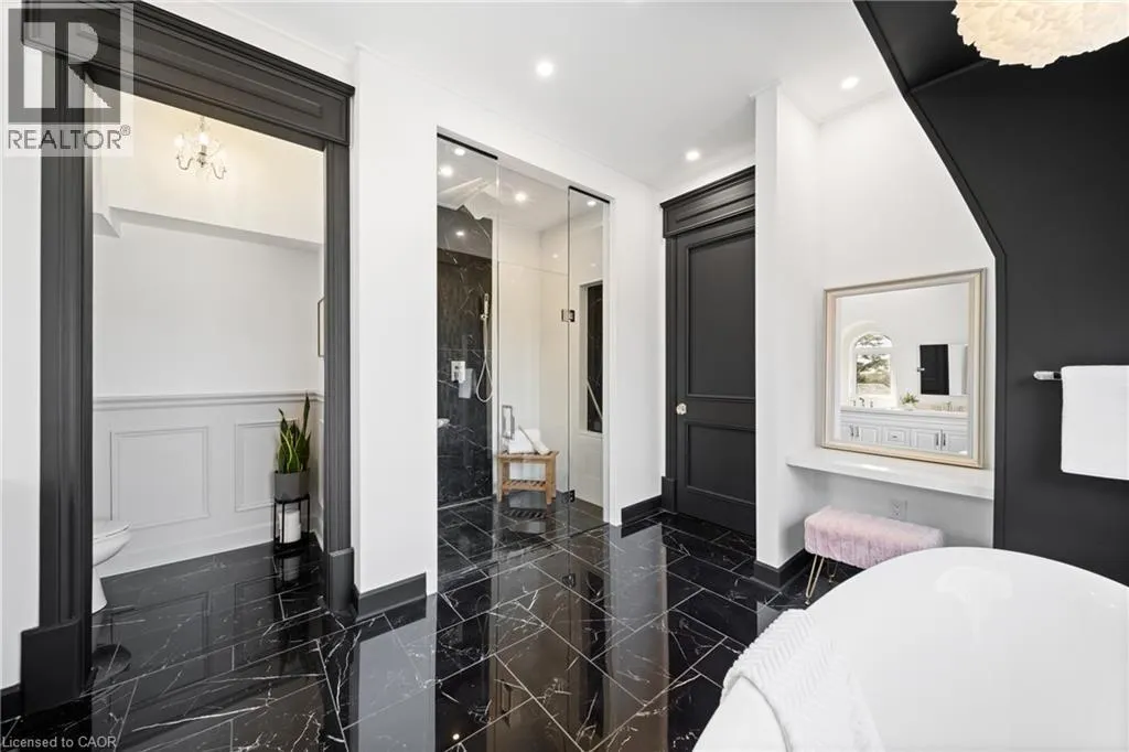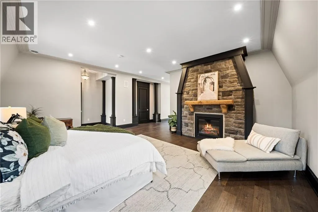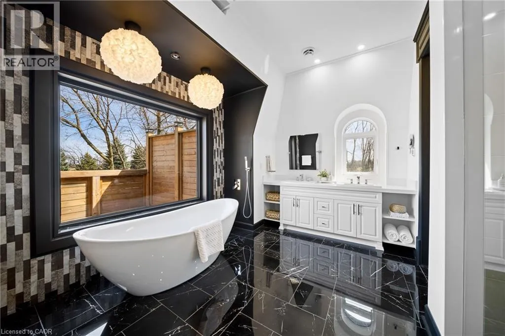 Wilson Street to Cameron Nestled in scenic Ancaster Village, this French Chateau-inspired residence offers over 7,000 sqft of luxury backing onto the iconic Hamilton Golf Club, with sweeping views of one of Canadaâs premier courses. This 3-storey masterpiece features 4 beds, 7 baths, 10.5â soaring ceilings, custom millwork, and refined European design. The main floor is designed for entertaining, showcasing a gourmet kitchen with high-end appliances, quartz counters, custom cabinetry and a large island. Three sets of double doors open to a covered outdoor dining area. A formal dining room with chandelier, fireplace and wet bar adds elegance, while the family room with built-ins and fireplace connects seamlessly to the landscaped yard. Second level is dedicated to ultimate comfort, 3 spacious bedrooms each with private baths & walk-in closets. Primary suite boasts gorgeous stone fireplace, custom walk-in closet & spa-like ensuite with freestanding tub, rainfall shower, glass shower, and private terrace overlooking the golf course. Third level serves as a secluded refuge with spacious living room, large bedroom, full bath & kitchenette. A walk-out portico terrace offers panoramic views of the golf course. Lower level features 9' ceilings, a recroom, fitness room, family room with another fireplace, full bathroom, heated floors & a kitchenette. A wine cellar completes your chateau experience. The property boasts a cedar-ceiling covered deck, outdoor gas fireplace, mature trees for privacy, 5 fireplaces, 3 dishwashers, Terrazzo concrete driveway & large tandem garage with 4-post car lift for the car enthusiast. Crafted with an ICF foundation and whole-home hydronic in-floor heating across all four levels, the residence delivers year-round comfort, remarkably low operating costs, and a reduced carbon footprintâluxury thatâs as smart as it is beautiful. Close to fine dining, shopping, trails, and conservation areas, this property is a rare haven of sophistication, luxury, and timeless elegance. (id:27476)