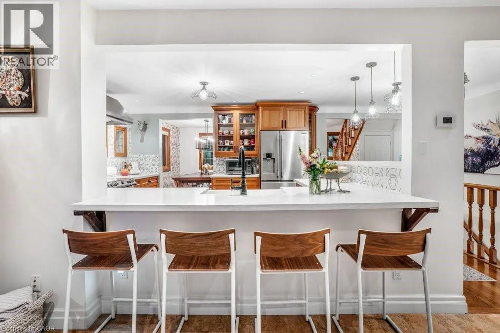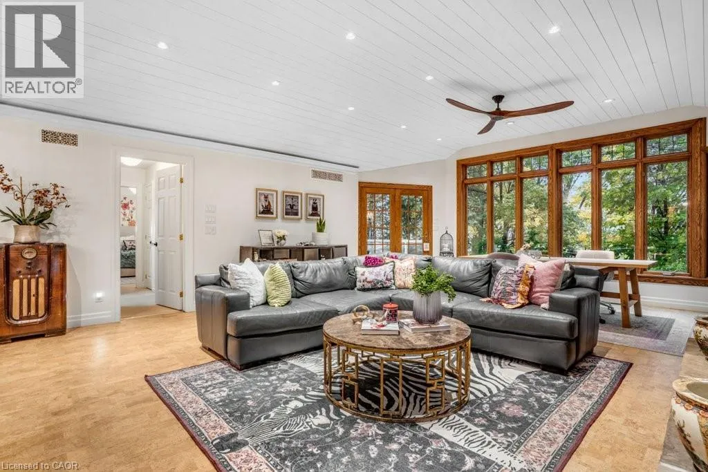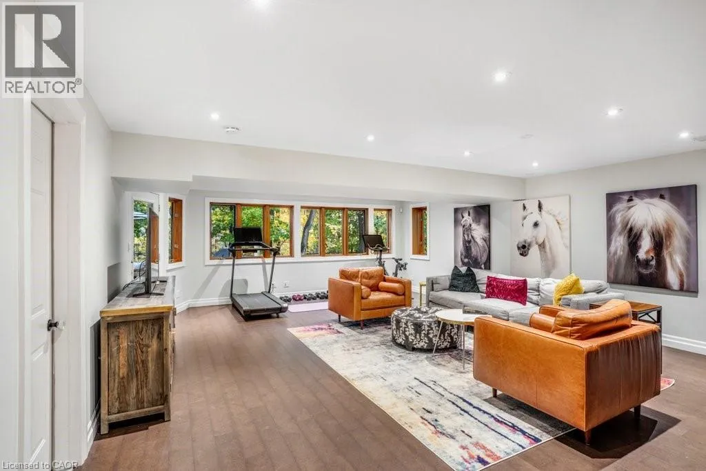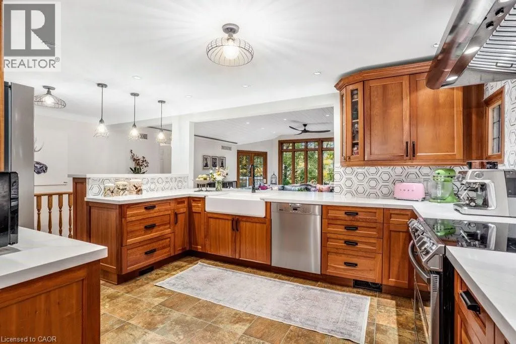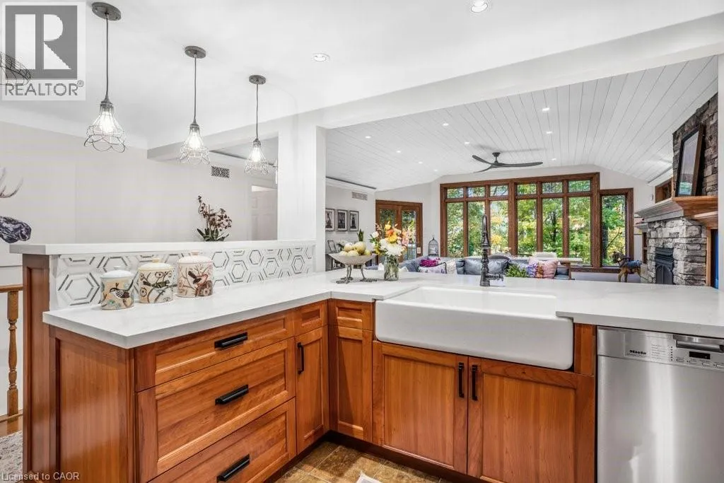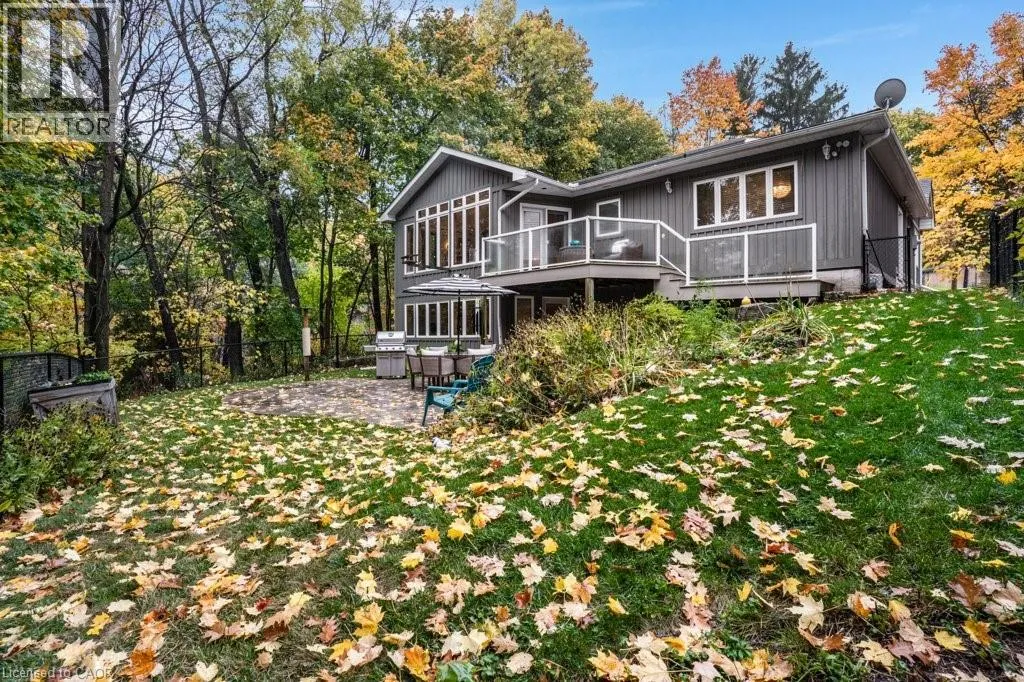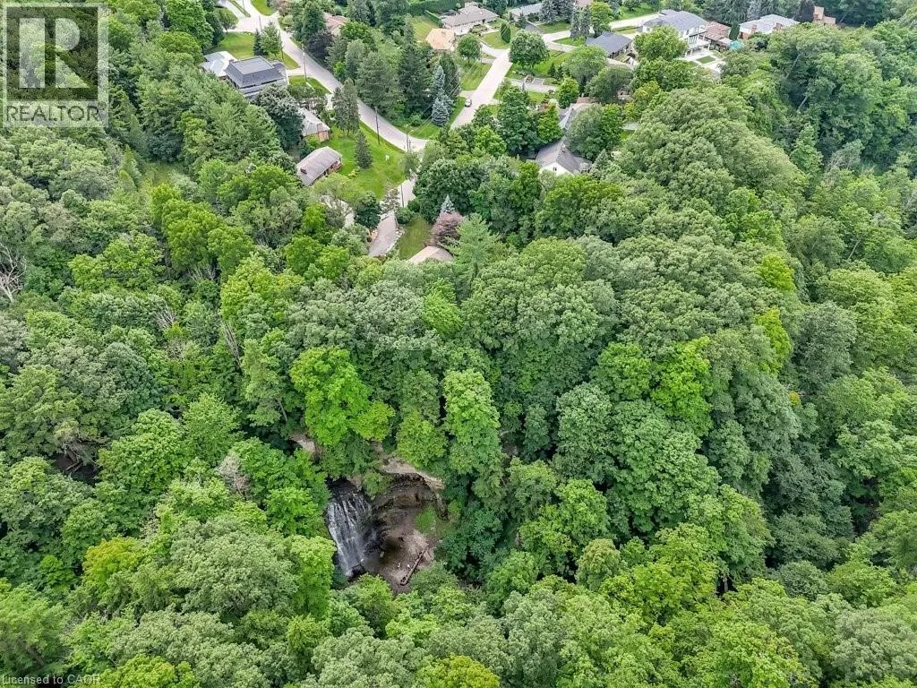 Heading east on Wilson St E, turn right onto Montgomery Dr for several blocks and house will be on the left, almost at the end of the street. Perched on the brow of the sought-after Ancaster Heights neighbourhood, and at the end of a quiet cul-de-sac, this one-of-a-kind home offers breathtaking views of the Niagara Escarpment, where you can hear the rush of Tiffany Falls from your own backyard. Set on a private 60 x 228 ft ravine lot with manicured landscaping and mature trees, and surrounded by custom-built estates, this 2,544 sq ft residence (plus finished walkout basement) blends nature, craftsmanship, and comfort. The heart of this open-concept main level features a custom solid-wood kitchen with quartz counters, breakfast bar, marble backsplash and restaurant-grade range hood, opening to a sunlit, vaulted shiplap ceiling family room with cork floors, dry-stone fireplace, and oak built-ins. Incredible views of the escarpment from the wall of windows, immerse you into nature! Step outside and hear the waterfalls from the Azek deck, which walks down to the fenced yard (property extends beyond the fence). The main floor primary suite offers a walk-in closet and ensuite with double sinks and oversized shower. A bonus space connecting the home to the 1.5 car garage currently has access to the two piece powder room, and laundry, but could be a great second kitchen for overflow during hosting, an incredible mud room, or continue its current use as main floor storage/pantry! Two generous sized additional bedrooms, each with ample closet space, and a 4-pc bath complete the upper level. Plenty of storage in the walkout basement, which offers a wall of windows from the rec room with views of the forest, and a door to a covered patio. A 23 x 16 foot workshop has double doors to the rear yard as well. This home has received $50,000 of updates in the past four years, making an already immaculate home, move-in-ready! (id:27476)