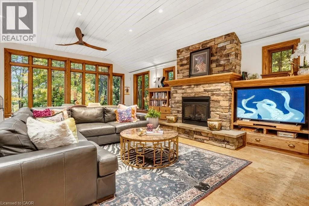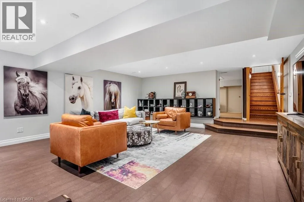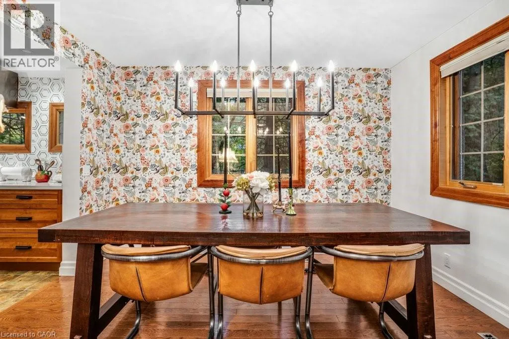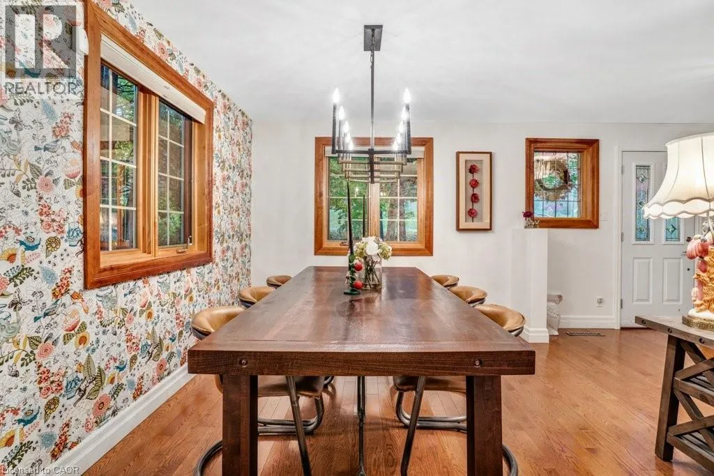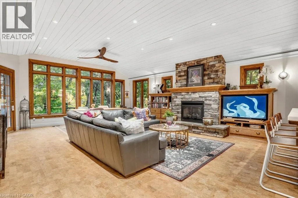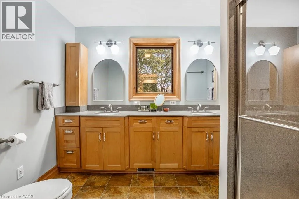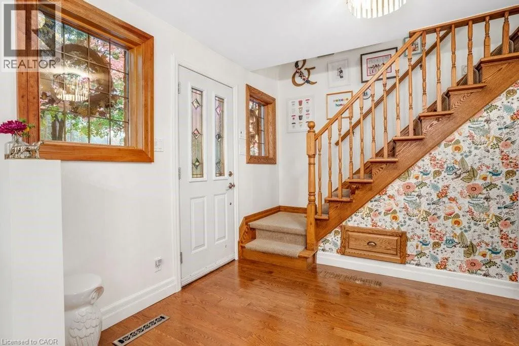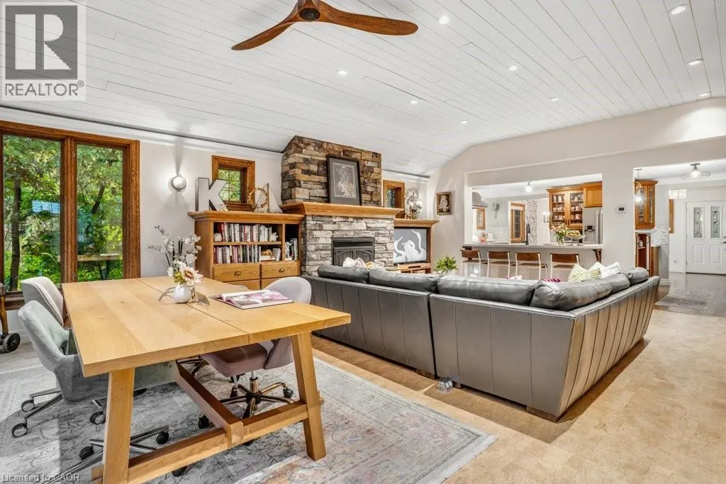 Heading east on Wilson St E, turn right onto Montgomery Dr for several blocks and house will be on the left, almost at the end of the street. Perched on the brow of the sought-after Ancaster Heights neighbourhood, and at the end of a quiet cul-de-sac, this one-of-a-kind home offers breathtaking views of the Niagara Escarpment, where you can hear the rush of Tiffany Falls from your own backyard. Set on a private 60 x 228 ft ravine lot with manicured landscaping and mature trees, and surrounded by custom-built estates, this 2,544 sq ft residence (plus finished walkout basement) blends nature, craftsmanship, and comfort. The heart of this open-concept main level features a custom solid-wood kitchen with quartz counters, breakfast bar, marble backsplash and restaurant-grade range hood, opening to a sunlit, vaulted shiplap ceiling family room with cork floors, dry-stone fireplace, and oak built-ins. Incredible views of the escarpment from the wall of windows, immerse you into nature! Step outside and hear the waterfalls from the Azek deck, which walks down to the fenced yard (property extends beyond the fence). The main floor primary suite offers a walk-in closet and ensuite with double sinks and oversized shower. A bonus space connecting the home to the 1.5 car garage currently has access to the two piece powder room, and laundry, but could be a great second kitchen for overflow during hosting, an incredible mud room, or continue its current use as main floor storage/pantry! Two generous sized additional bedrooms, each with ample closet space, and a 4-pc bath complete the upper level. Plenty of storage in the walkout basement, which offers a wall of windows from the rec room with views of the forest, and a door to a covered patio. A 23 x 16 foot workshop has double doors to the rear yard as well. This home has received $50,000 of updates in the past four years, making an already immaculate home, move-in-ready! (id:27476)