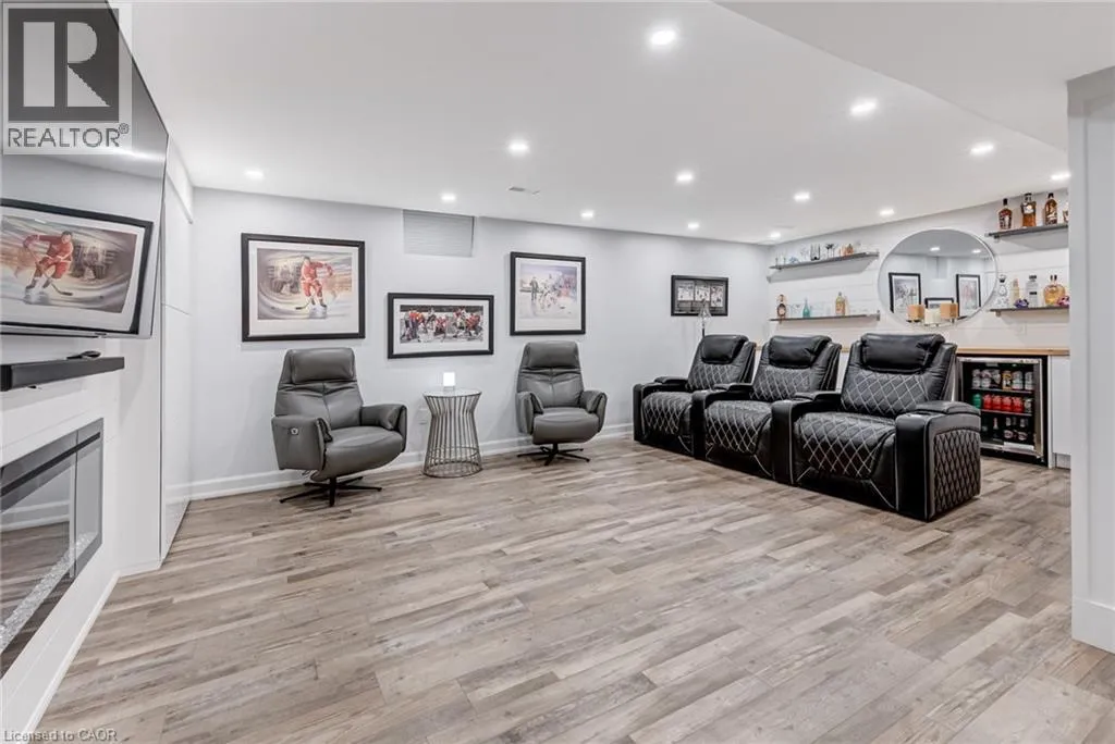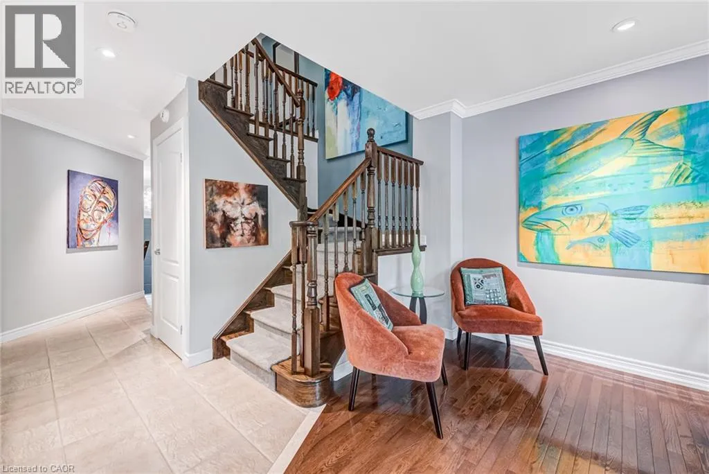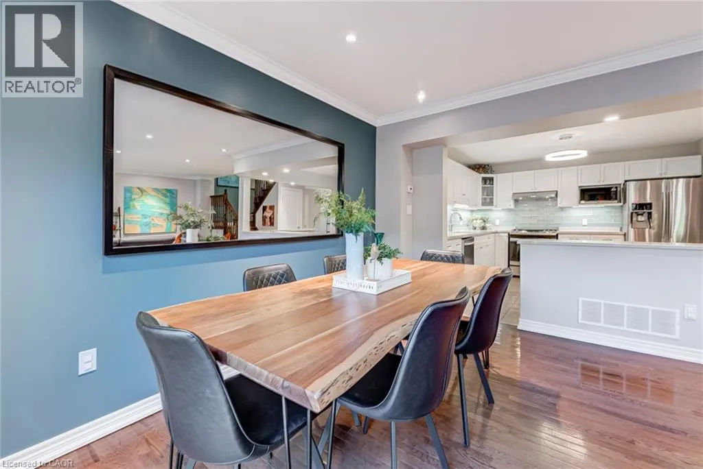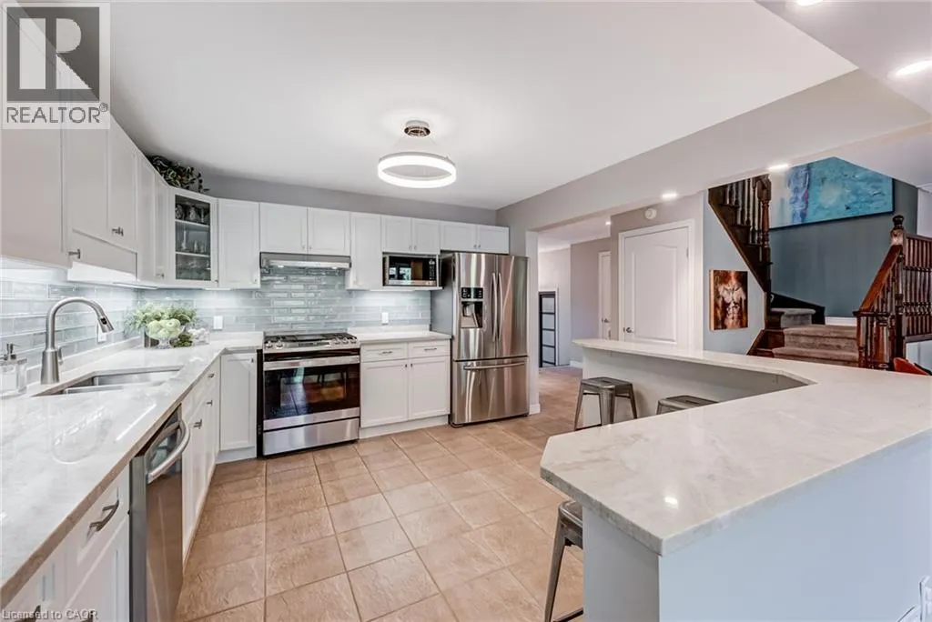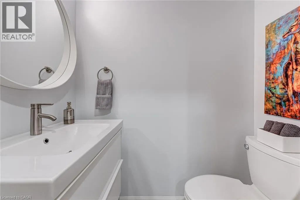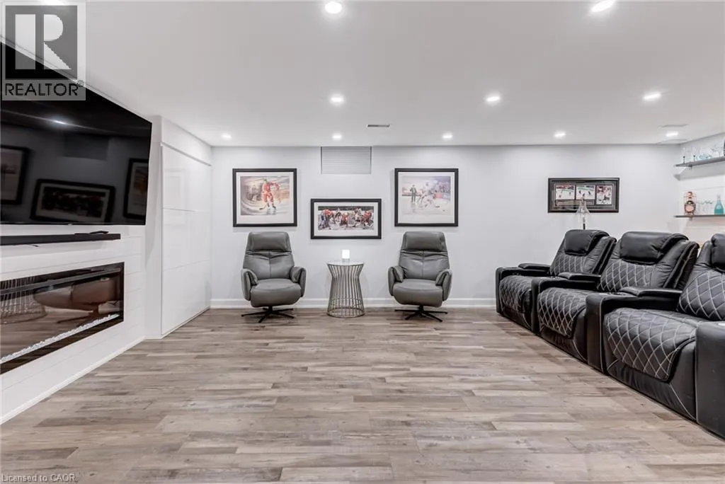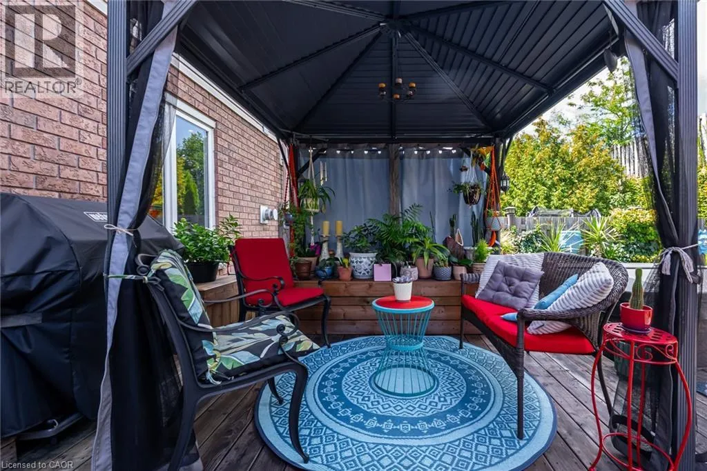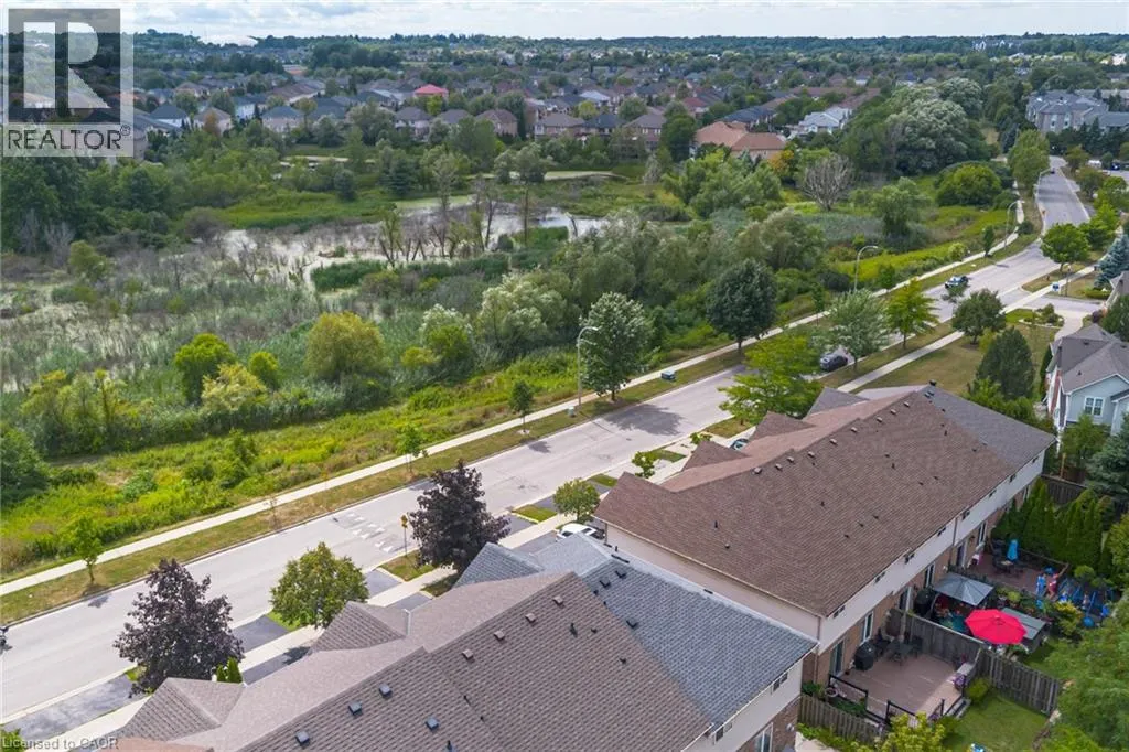 West from Stone Church Rd Gorgeous, professionally updated freehold townhome across from a Conservation Area with a number of paths and ponds for the enjoyment of nature lovers and dog enthusiasts. There is 1890 sq ft on the main and second floors, and almost 2700 sq ft of finished living space total. Inviting backyard with a deck, gazebo, 5-person hot tub, and lovely, mature greenery. Open concept main floor features hardwood flooring in the large living room with a gas fireplace, and in the dining room there are sliding doors to a deck. A stunning kitchen includes a gas stove, granite counter tops, a gorgeous tile backsplash and a breakfast/entertainment bar. The finished basement features luxury vinyl flooring, built-in custom wall-to-wall cupboards and drawers with bar fridge and a wet bar/refreshment area. Cabinetry surrounds an area for a wall mounted TV of up to an 85â with electric fireplace below. The second floor includes feature décor walls, a loft area, engineered hardwood throughout, custom blinds and a convenient laundry room. The spacious primary bedroom has a large 4-piece ensuite and walk-in closet. The main bath has a walk-in shower and a modern, free-standing vanity with 2 under mount sinks. The bedroom that is used as an exercise room has a Murphy bed offering a multi-purpose room including a guest room, exercise room or office. The Murphy bed has a storage cabinet and a pull out side table. Insulated garage is ideal for hobbyists in winter. Updates include AC/Furnace/Roof, 2 bathrooms, kitchen, basement, and pot lights throughout 3 levels including bedroom closets. Walk to amenities, shopping and restaurants. Two-minute drive to a large dog park. Close to highway access. This home is turnkey so just move in and enjoy all that this home and area have to offer! (id:27476)