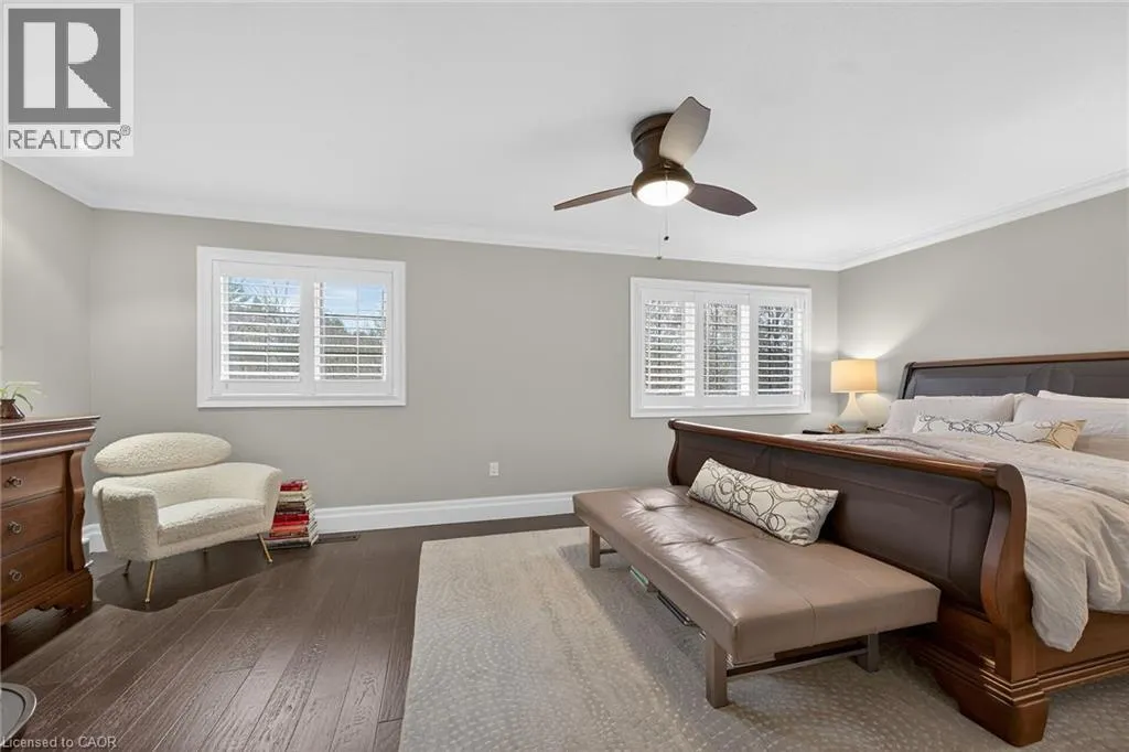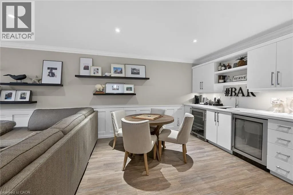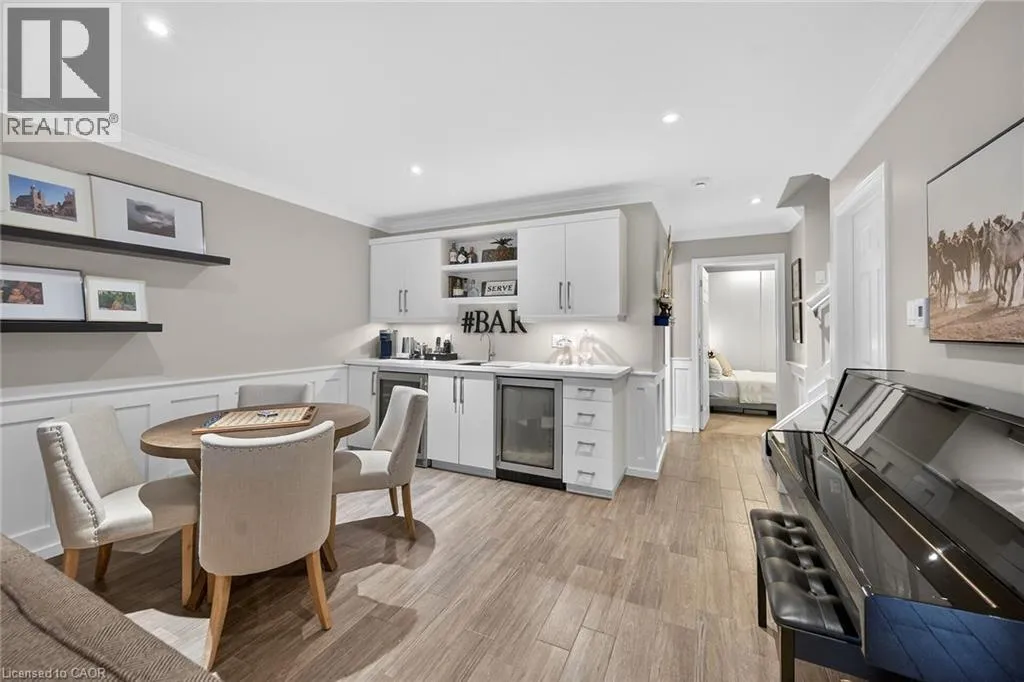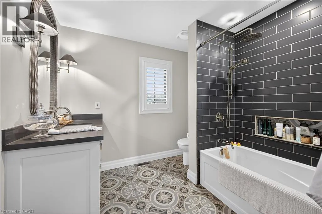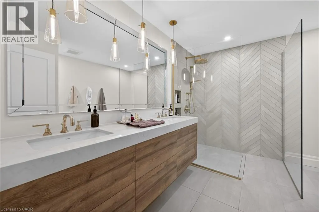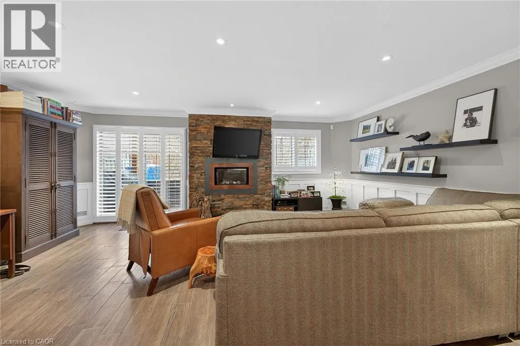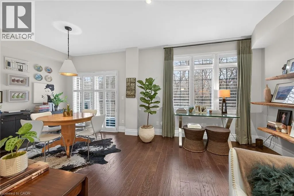 Wilson St to Sulphur Springs Coveted location on Sulphur Springs Road. Stroll to olde town and all amenities, while enjoying the peaceful, serene backdrop of nature. This town manor has been tastefully & professionally renovated & upgraded. From the sleek bright kitchen, the statement gas f/p in the liv room, staircase, engineered hardwood flooring on main & upper levels. All bathrooms have heated floors (3), furnace, a/c, lower level walk out with built-ins and stone gas fp, heated tile flooring, den, & 3pc bathroom, including recent rear patio. Minutes to the Hamilton Golf and Country Club and major road accesses. You'll appreciate the design details & renovations that makes this upscale townhome an easy choice to make it yours. There is approximately 2,600 square feet of luxury living. (id:27476)