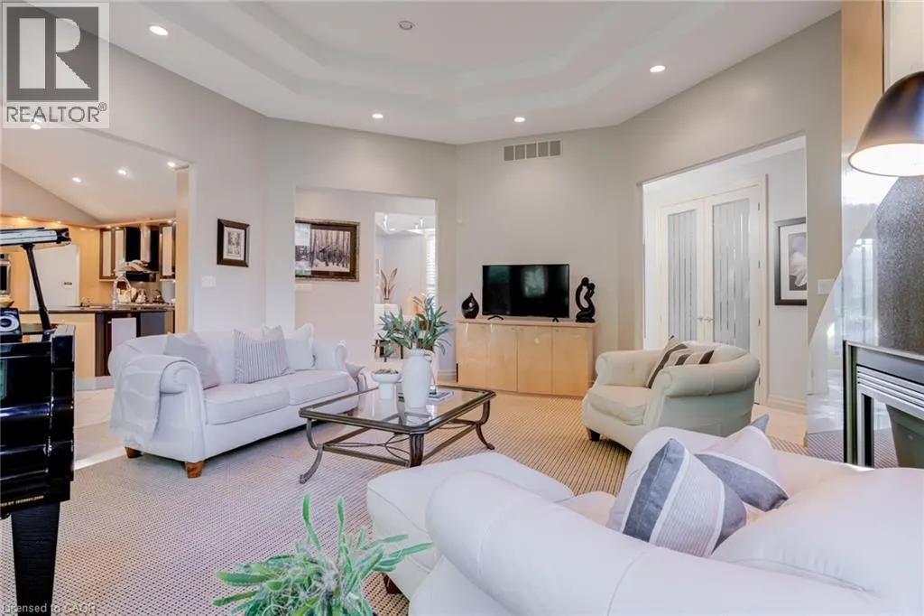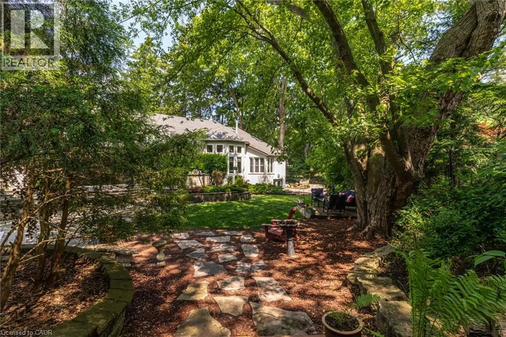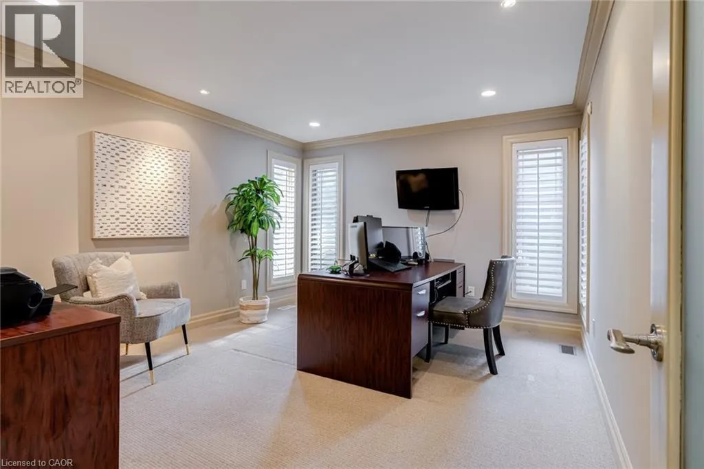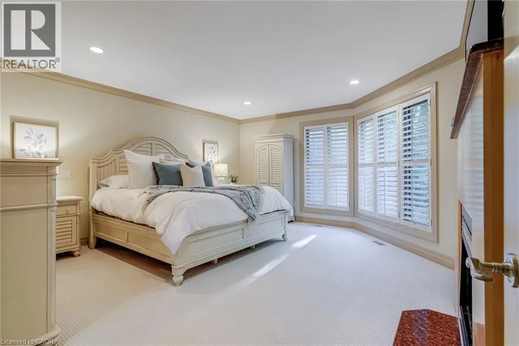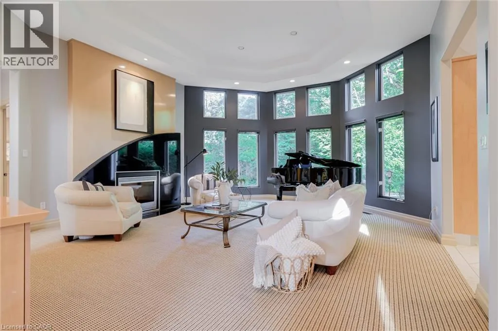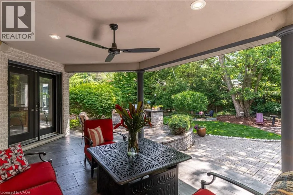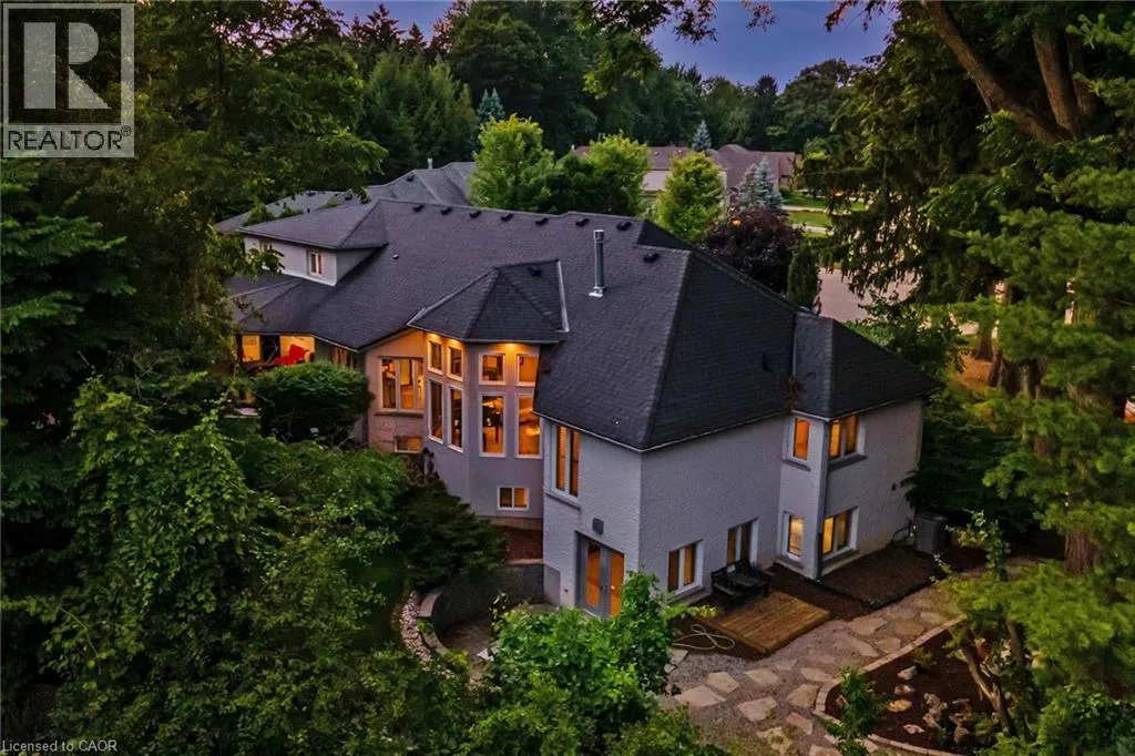Jerseyville Rd or Sulphur Springs to Lovers Lane - to Harrington Place (Court) Located on a quiet court in Ancasterâs prestigious Oakhill neighbourhood, 34 Harrington Place is a one-of-a-kind bungaloft designed for elegant living and unforgettable entertaining. Set on a pie-shaped, nearly half-acre lot with an impressive 217 ft across the rear, this custom-built Atherton home is surrounded by estate properties and award-winning Trillium gardens that elevate the curb appeal and outdoor experience. Boasting almost 5,000 sqft of impeccably finished living space, this home offers 3+1 bedrooms, 4 full baths, and a layout that perfectly blends everyday comfort with timeless sophistication. The main floor features a gourmet eat-in kitchen with custom cabinetry, cathedral ceiling, and access to a covered porch, flowing into a striking 12-ft great room with gas fireplace and floor-to-ceiling windows overlooking the oasis backyard. A formal dining room provides the ideal setting for hosting family gatherings and elegant dinner parties. The luxurious main-floor primary suite includes a cozy gas fireplace, an oversized walk-in dressing room, and a 5-pc spa-inspired ensuite. Also on the main level: a large private office, a full laundry room, and a stylish guest bath with direct outdoor accessâperfect for rinsing off after a dip in the custom-designed hot and cold soaker pool spa or post-garden clean-up. Upstairs, two well-appointed bedrooms, a full bath, and a versatile loft area offer space for teens, guests, or a second home office. The bright walk-out basement features a 3-sided gas fireplace, spacious recreation room, kitchenette/bar, 4th bedroom, full spa bath, gym area, and abundant storageâideal for in-laws or extended family. The backyard is a showstopper: private, lush, and tailored for gatherings large or small. Multiple seating and dining areas, a covered porch, and the signature pool spa create an outdoor sanctuary youâll enjoy in every season. This is more than a homeâitâs a statement of lifestyle in one of Ancasterâs most exclusive enclaves. (id:27476)