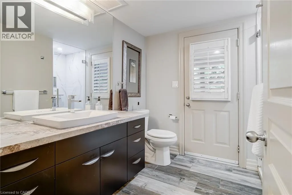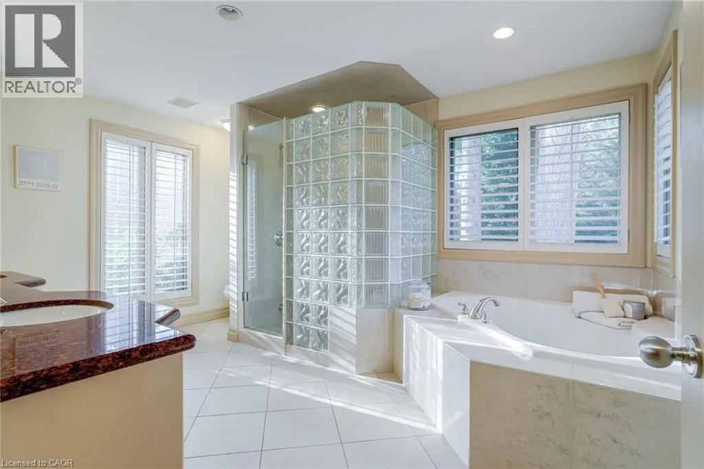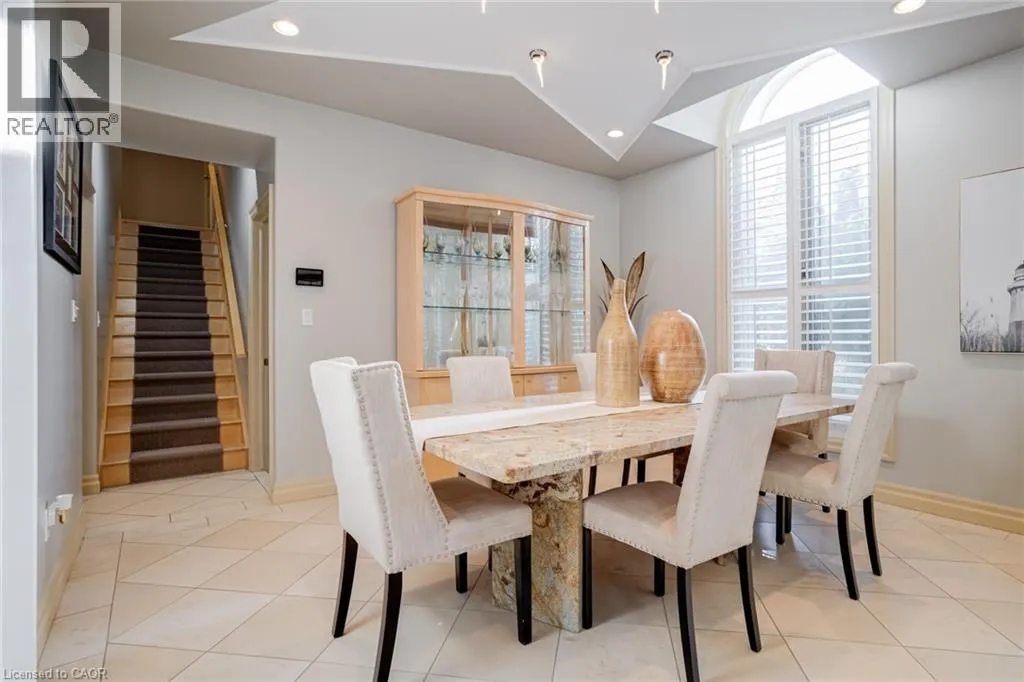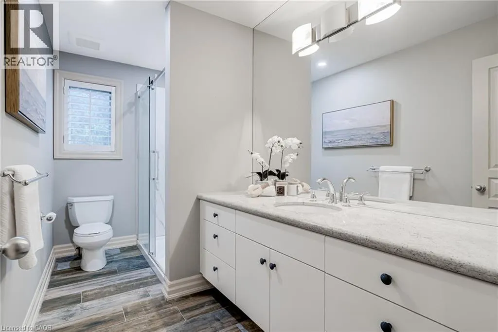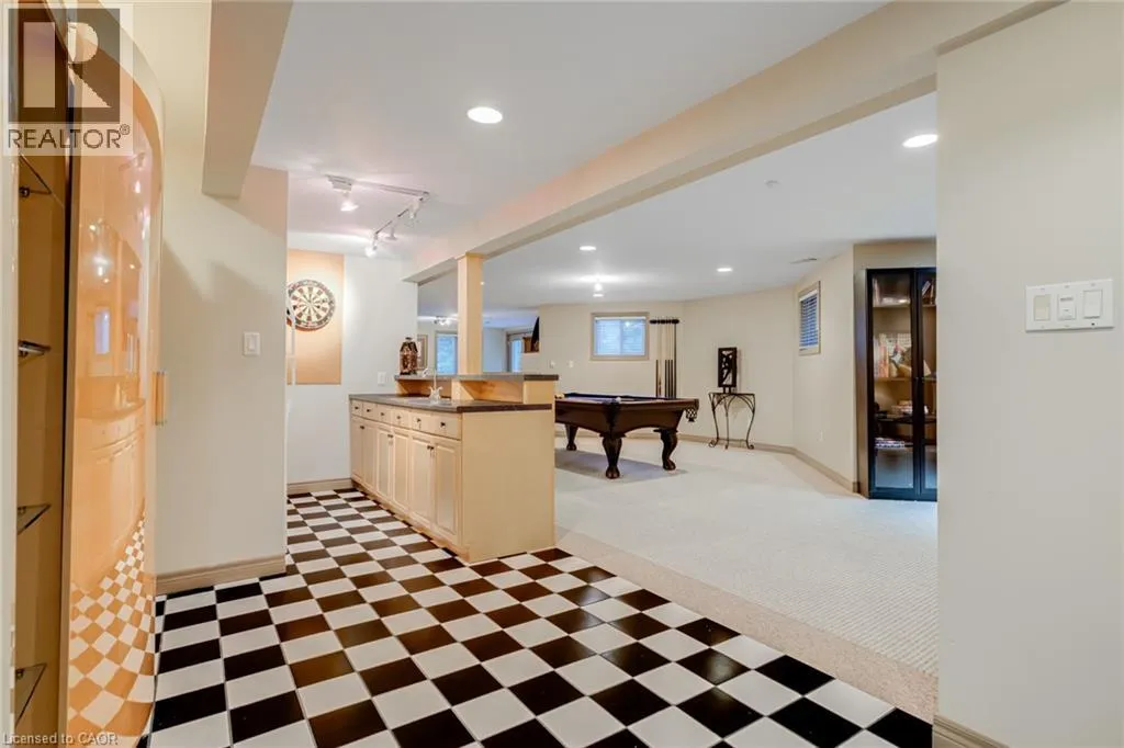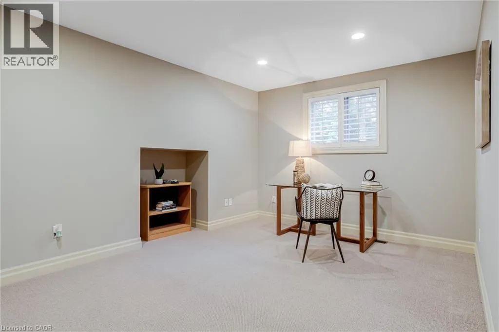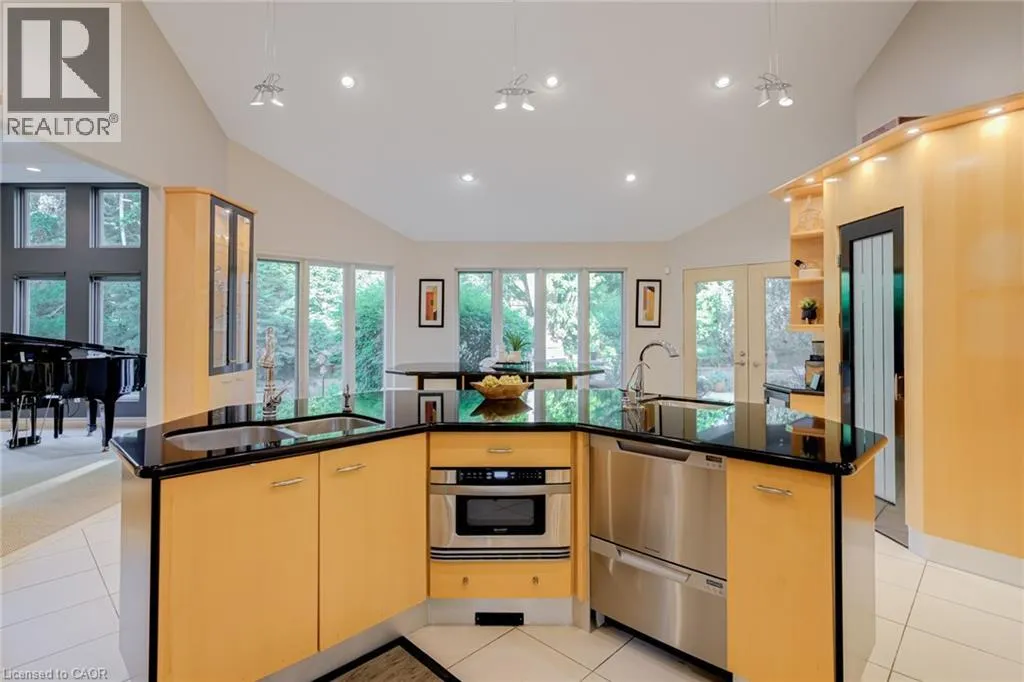 Jerseyville Rd or Sulphur Springs to Lovers Lane - to Harrington Place (Court) Located on a quiet court in Ancasterâs prestigious Oakhill neighbourhood, 34 Harrington Place is a one-of-a-kind bungaloft designed for elegant living and unforgettable entertaining. Set on a pie-shaped, nearly half-acre lot with an impressive 217 ft across the rear, this custom-built Atherton home is surrounded by estate properties and award-winning Trillium gardens that elevate the curb appeal and outdoor experience. Boasting almost 5,000 sqft of impeccably finished living space, this home offers 3+1 bedrooms, 4 full baths, and a layout that perfectly blends everyday comfort with timeless sophistication. The main floor features a gourmet eat-in kitchen with custom cabinetry, cathedral ceiling, and access to a covered porch, flowing into a striking 12-ft great room with gas fireplace and floor-to-ceiling windows overlooking the oasis backyard. A formal dining room provides the ideal setting for hosting family gatherings and elegant dinner parties. The luxurious main-floor primary suite includes a cozy gas fireplace, an oversized walk-in dressing room, and a 5-pc spa-inspired ensuite. Also on the main level: a large private office, a full laundry room, and a stylish guest bath with direct outdoor accessâperfect for rinsing off after a dip in the custom-designed hot and cold soaker pool spa or post-garden clean-up. Upstairs, two well-appointed bedrooms, a full bath, and a versatile loft area offer space for teens, guests, or a second home office. The bright walk-out basement features a 3-sided gas fireplace, spacious recreation room, kitchenette/bar, 4th bedroom, full spa bath, gym area, and abundant storageâideal for in-laws or extended family. The backyard is a showstopper: private, lush, and tailored for gatherings large or small. Multiple seating and dining areas, a covered porch, and the signature pool spa create an outdoor sanctuary youâll enjoy in every season. This is more than a homeâitâs a statement of lifestyle in one of Ancasterâs most exclusive enclaves. (id:27476)