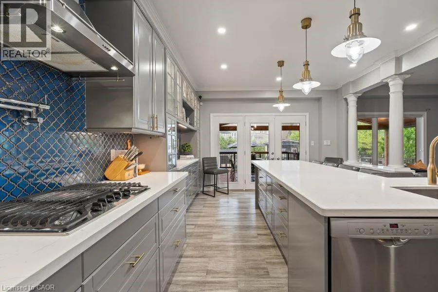 Stonehenge to Raymond Road, right on Fair Street Set on one of Meadowlandsâ deepest lots (169 ft deep), this home delivers resort-style living year-round â with a heated saltwater pool, oversized covered porch, and backyard built for relaxing or entertaining. Extensively updated with over $250,000 in improvements, the property combines thoughtful design with timeless comfort. The outdoor space checks every box: arched wood patio with pot lights, cabana with change room, pull-down privacy blinds, and plenty of room to host or unwind. Inside, the layout is both generous and functional. Four spacious bedrooms upstairs plus a main-floor office (or optional fifth bedroom) â perfect for working from home. Two additional bedrooms in the finished basement (2023) and a bright, open-concept main floor designed for everyday living. The kitchen features quartz countertops, a custom backsplash, six-burner gas cooktop, deep chef-style sink, and a large island with seating for six â flowing effortlessly into a family room with wall-to-wall windows, gas fireplace, built-ins, concealed TV wiring, and a window-seat bench for added comfort and storage. Recent upgrades include the covered outdoor porch (2023), new roof (2021), furnace and tankless water heater (2022), concrete side stairs (2023), EV-ready garage, and Ecobee Smart Thermostat. Located on a quiet, family-friendly street in Ancasterâs Meadowlands, this property offers rare lot depth, extensive updates, and a layout that truly grows with you. (id:27476)