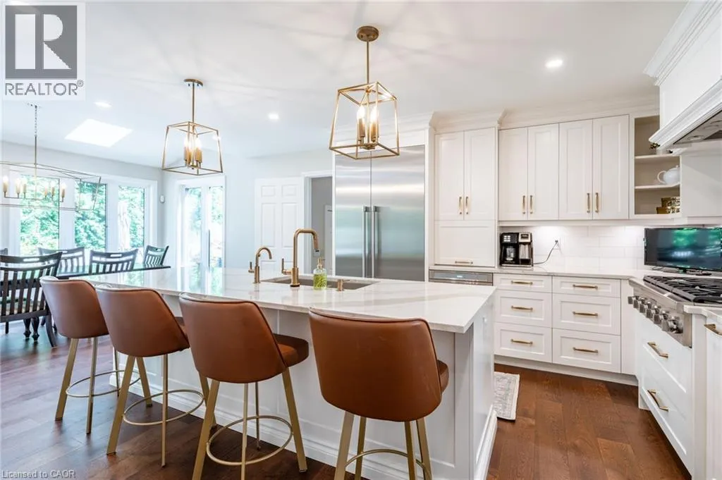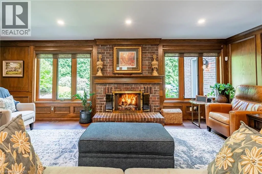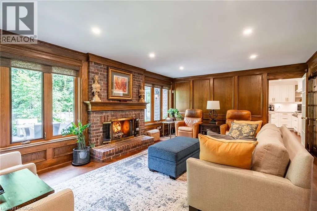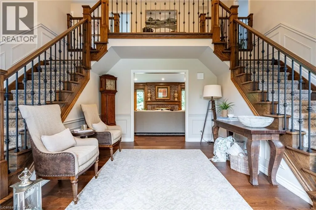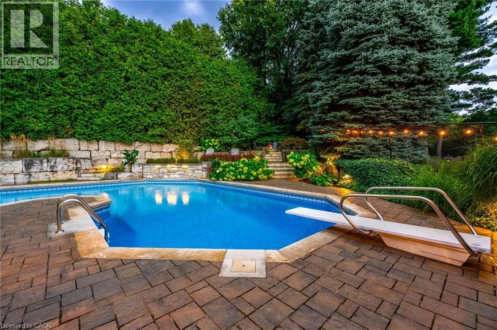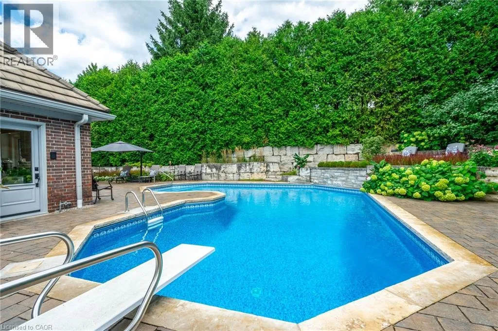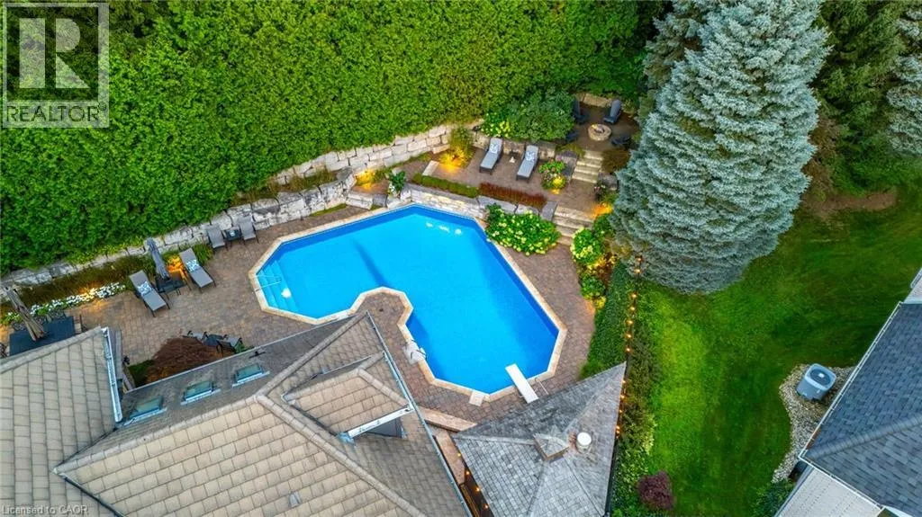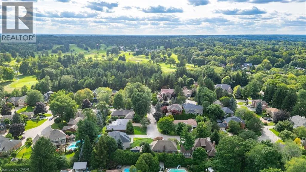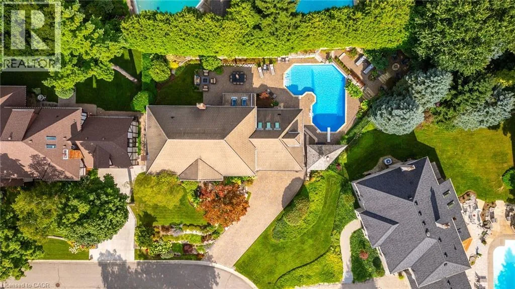 Golf Links Rd to Chancery Dr to Peppertree Cres Exceptional Estate in One of Ancasterâs most sought-after Neighbourhoods! Just steps from the prestigious Hamilton Golf & Country Club, this remarkable estate offers over 4000sqft above grade of living space on a generous pie-shaped lot w/ lush landscaping, inground pool & a resort-like bckyrd! The approach alone is unforgettable- youâre greeted by a picturesque streetscape, grand windows & exterior drs (replaced â11ââ15), extensive stonework & landscaping (â14) & an incredible architectural presence. Inside, a stunning dbl staircase (renoâd Spring â21) makes an immediate statement. Beneath the staircase, the elegant great rm feat rich oak wainscoting & a gas fp, creating a warm yet sophisticated gathering space. Main flr hdwd â21. The kitchen, fully renoâd in â21, boasts Cambria quartz countertops & premium Thermador appl. Step outside from the kitch to an extraordinary, bckyrd oasis designed for entertaining! Highlights include two gas fp, multiple outdoor entertaining areas, an impressive L-shaped pool & ample green space for children and pets. Landscaping by Cedar Springs in â11. The main lvl also offers a gracious living rm w/ a wood-burning fp, a formal dining rm, a regal office w/ oak detailing and wainscoting, a 2-pc bthrm and a convenient main-flr lndry rm off the grg w/ heated floors. Upstairs, youâll find 4 generously sized bdrms and 3 full bthrms. The childrenâs rms share a Jack & Jill bthrm reno'd in 15', while the luxurious primary suite feat his-and-hers w/i closets, a spa-like ensuite reno'd in 15' w/ Cambria Quartz countertops, heated flrs, and an addâl gym or private office. The lower lvl offers exceptional versatility, w/ a spacious bdrm, full kitch w/ granite countertops (â15), and a renoâd bthrm w/ heated flrs (â15). With a sep entrance, this lvl is ideal for summer entertaining, pool access, or extended family living. A truly rare offeringâprivate, elegant, and perfectly locatedâthis home delivers timeless design & an unmatched lifestyle. (id:27476)