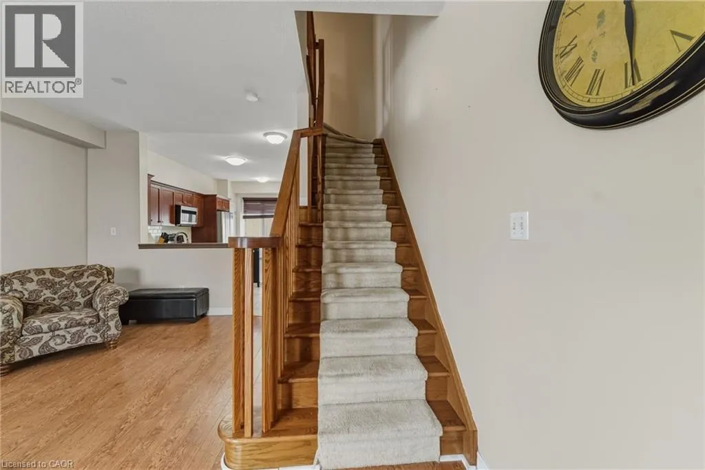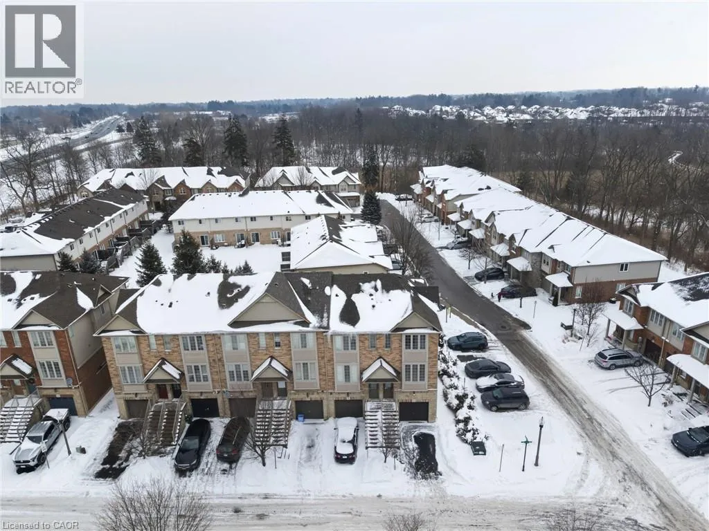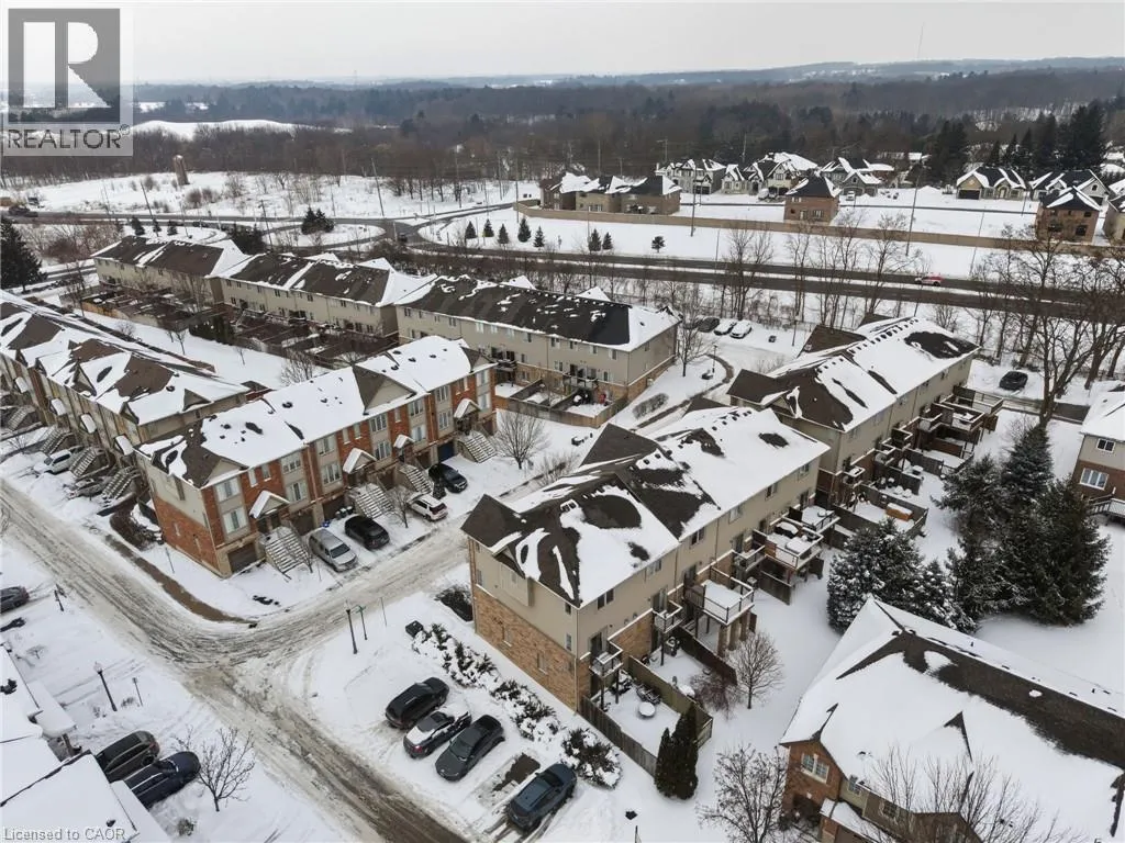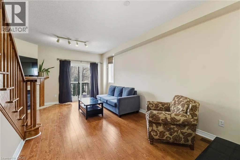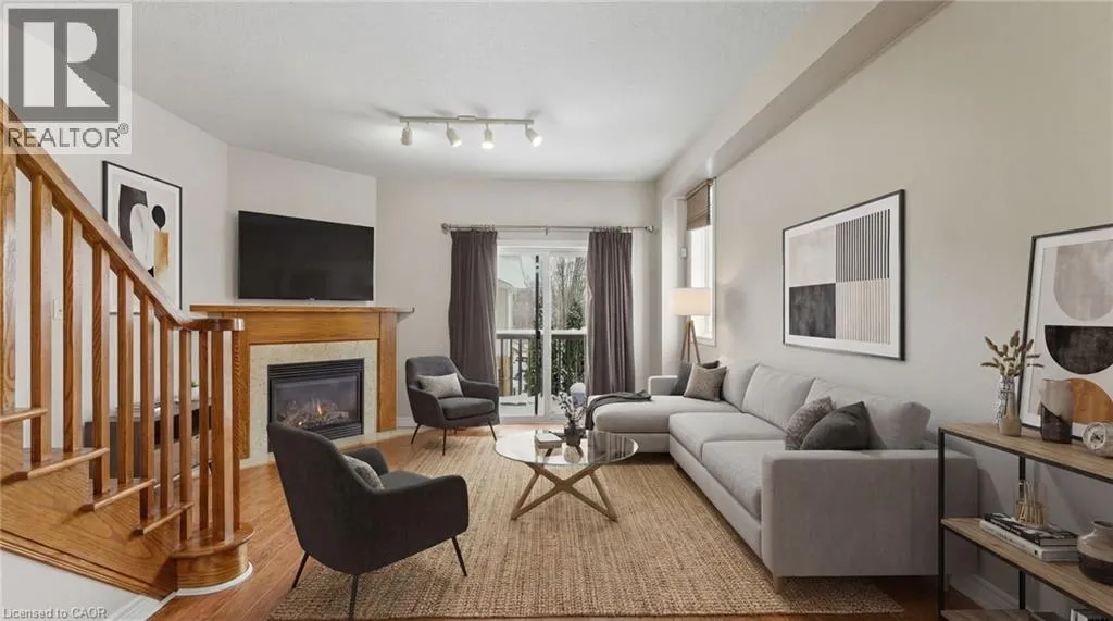 Rymal or Wilson to Shaver to Myers Situated in a quiet Ancaster neighbourhood, this well maintained corner unit townhouse offers bright, comfortable living across three finished levels. The open concept main floor includes a gas fireplace and access to a private balcony. The eat in kitchen is finished with granite countertops, maple cabinetry, stainless steel appliances, a pantry, and breakfast bar. Upstairs are two spacious bedrooms, a full 4 piece bath, and convenient second floor laundry. The finished lower level provides a walkout to a private backyard and a flexible space ideal for a rec room, home office, or additional bedroom. An attached garage, nearby visitor parking, low road fees, and easy access to the 403 complete the home. (id:27476)