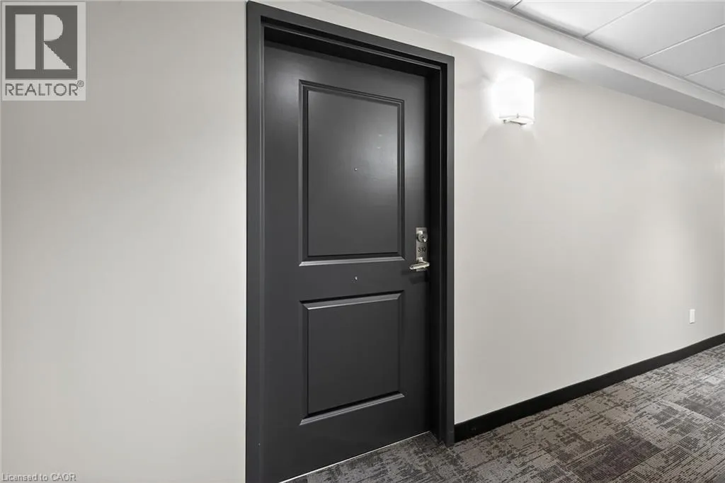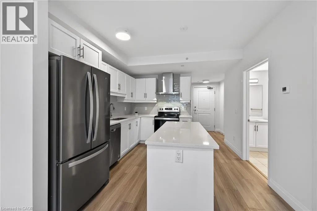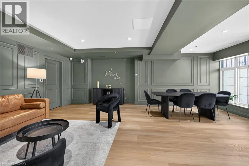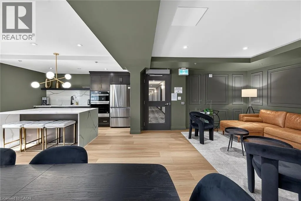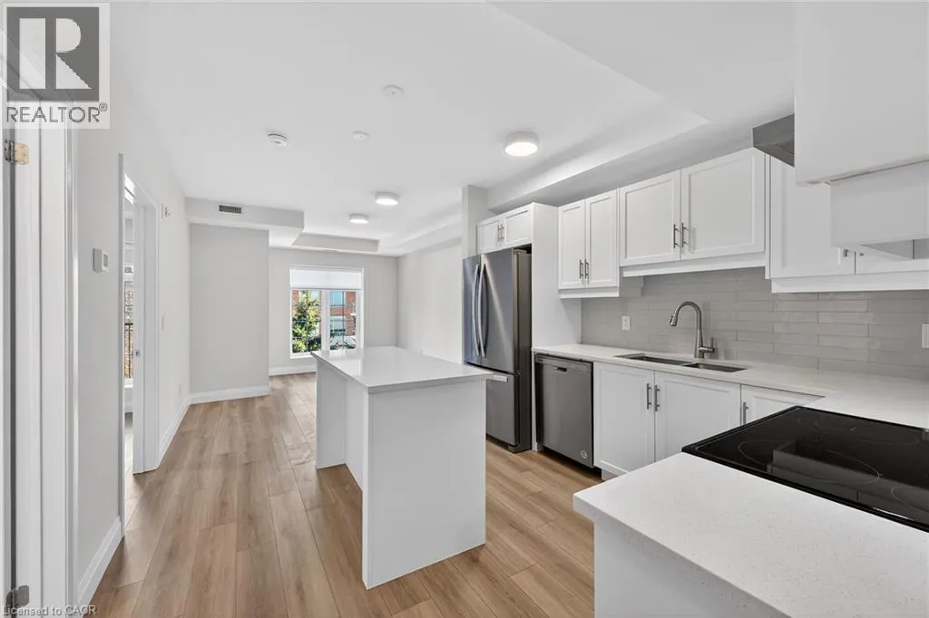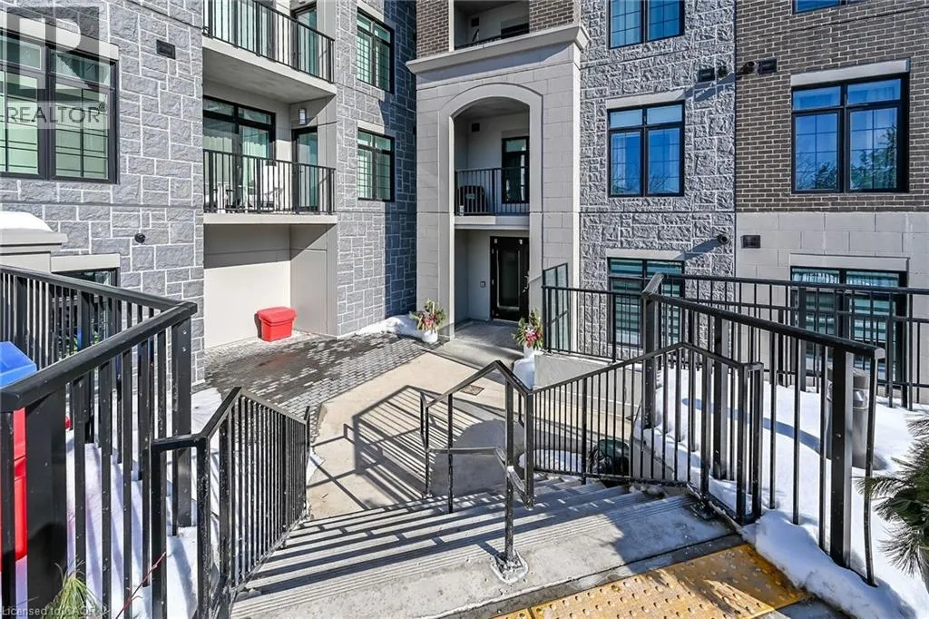Fiddlers Green Rd to Wilson St W Immaculate 1 bedroom PLUS den condo located in a luxury low rise building in desirable Ancaster Village. Modern lobby, fitness studio, stylish party room, media room, rooftop outdoor entertaining space with putting green & BBQ area just to name a few of the excellent amenities. This open concept freshly painted unit is perfectly designed for comfort & style. The bright kitchen features a large island, breakfast bar, quartz countertops, backsplash & stainless steel appliances. The spacious bedroom offers ensuite privileges. The den provides a perfect space for a home office or a cozy reading nook. The condo is complete with a 4 piece bathroom & convenient in-suite laundry. Enjoy your morning coffee on the large balcony. Includes 1 underground parking space & a storage locker located just down the hall. Just minutes to Hwy 403, public transit, shopping, restaurants, parks & golfing! This condo offers a perfect blend of style, function & location! (id:27476)