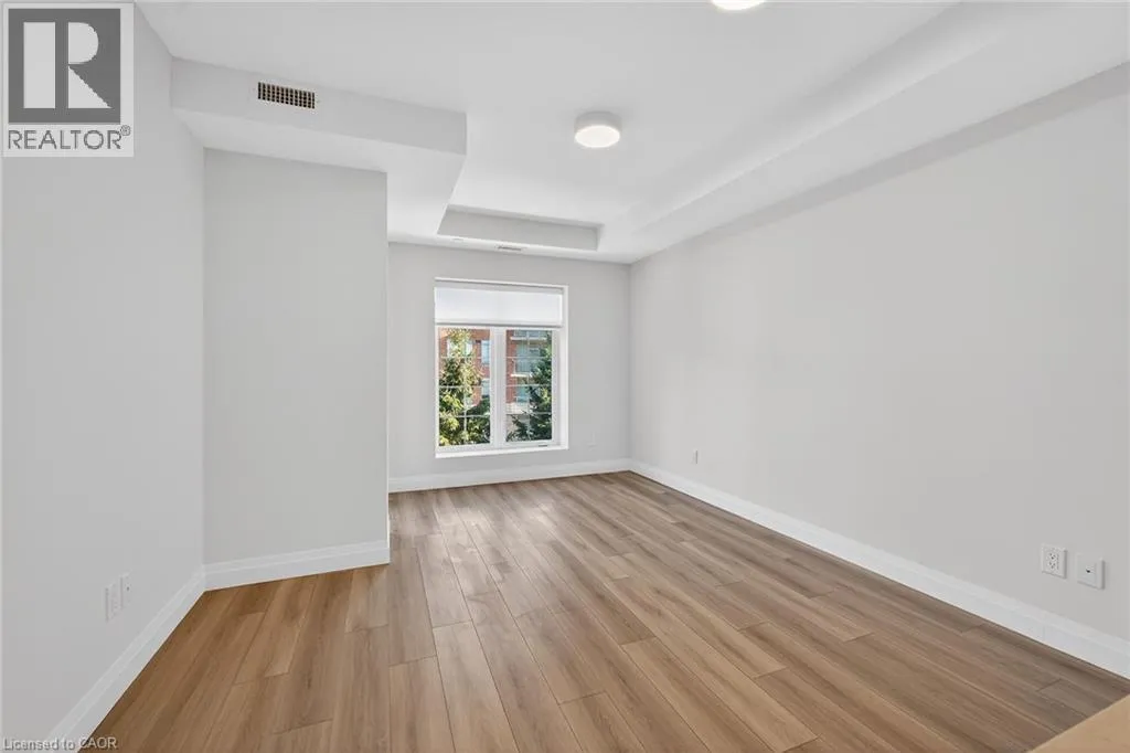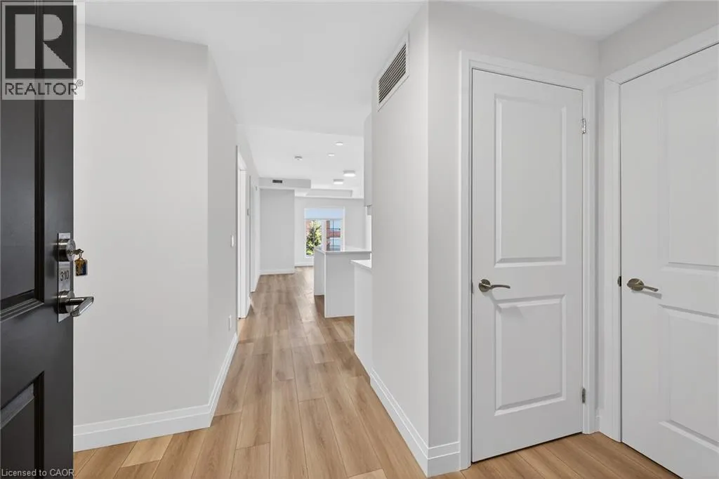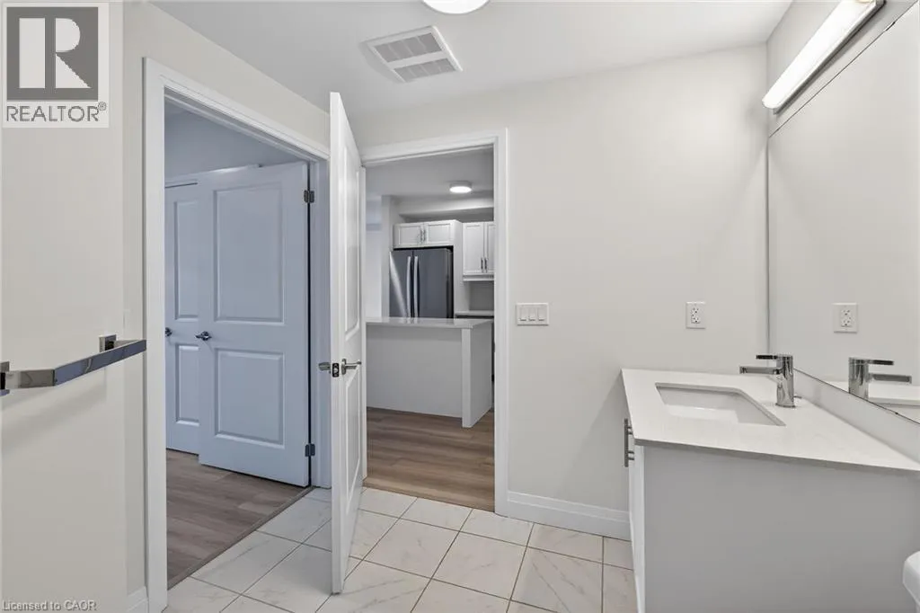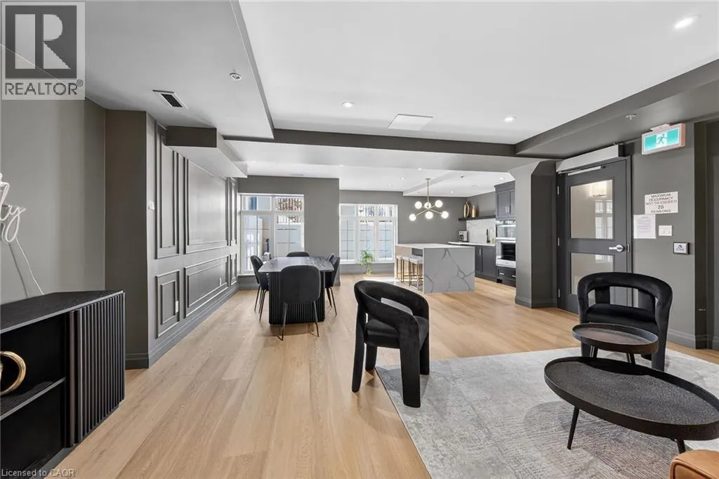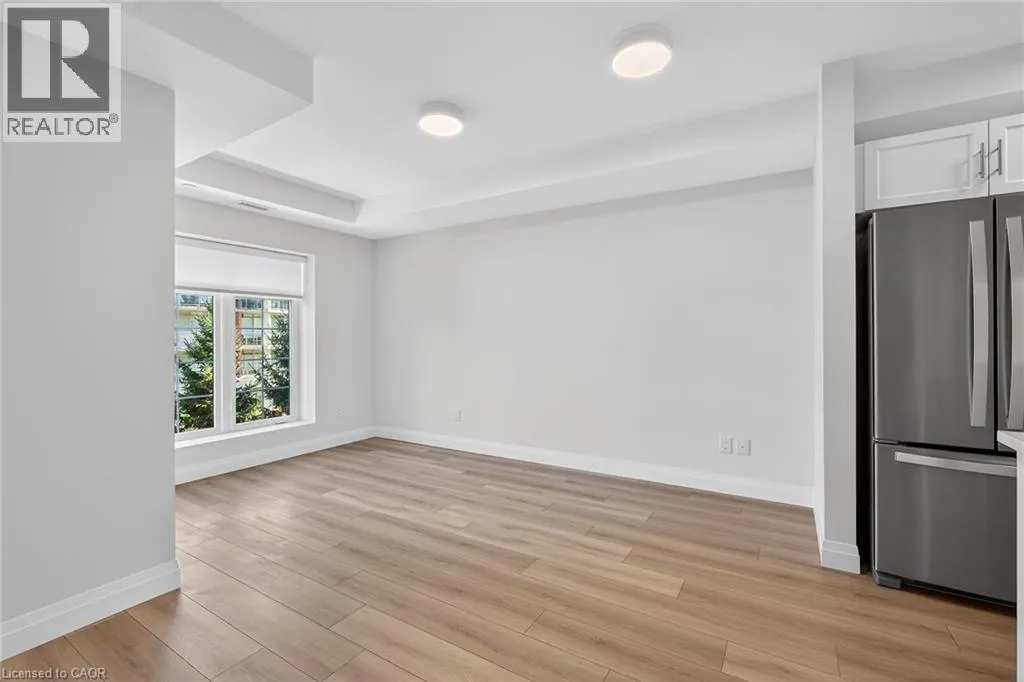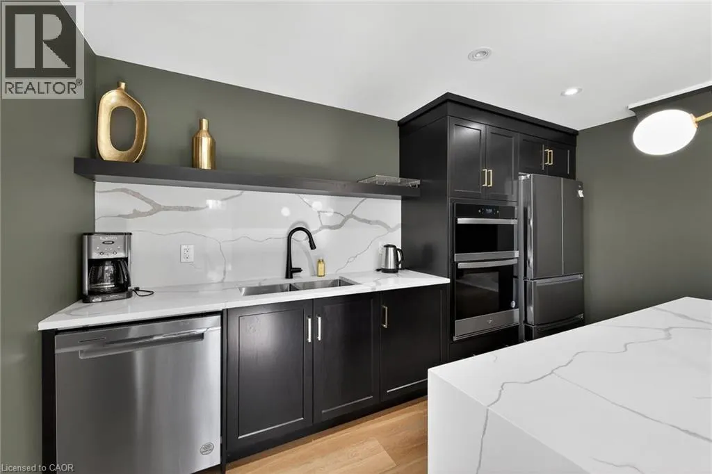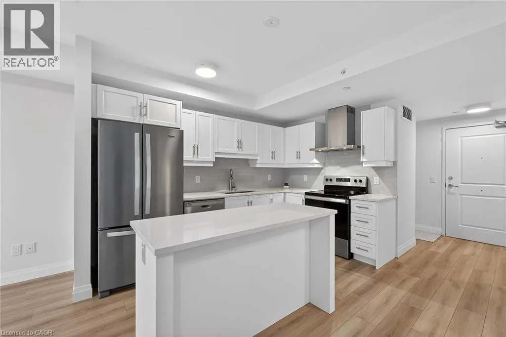 Fiddlers Green Rd to Wilson St W Immaculate 1 bedroom PLUS den condo located in a luxury low rise building in desirable Ancaster Village. Modern lobby, fitness studio, stylish party room, media room, rooftop outdoor entertaining space with putting green & BBQ area just to name a few of the excellent amenities. This open concept freshly painted unit is perfectly designed for comfort & style. The bright kitchen features a large island, breakfast bar, quartz countertops, backsplash & stainless steel appliances. The spacious bedroom offers ensuite privileges. The den provides a perfect space for a home office or a cozy reading nook. The condo is complete with a 4 piece bathroom & convenient in-suite laundry. Enjoy your morning coffee on the large balcony. Includes 1 underground parking space & a storage locker located just down the hall. Just minutes to Hwy 403, public transit, shopping, restaurants, parks & golfing! This condo offers a perfect blend of style, function & location! (id:27476)