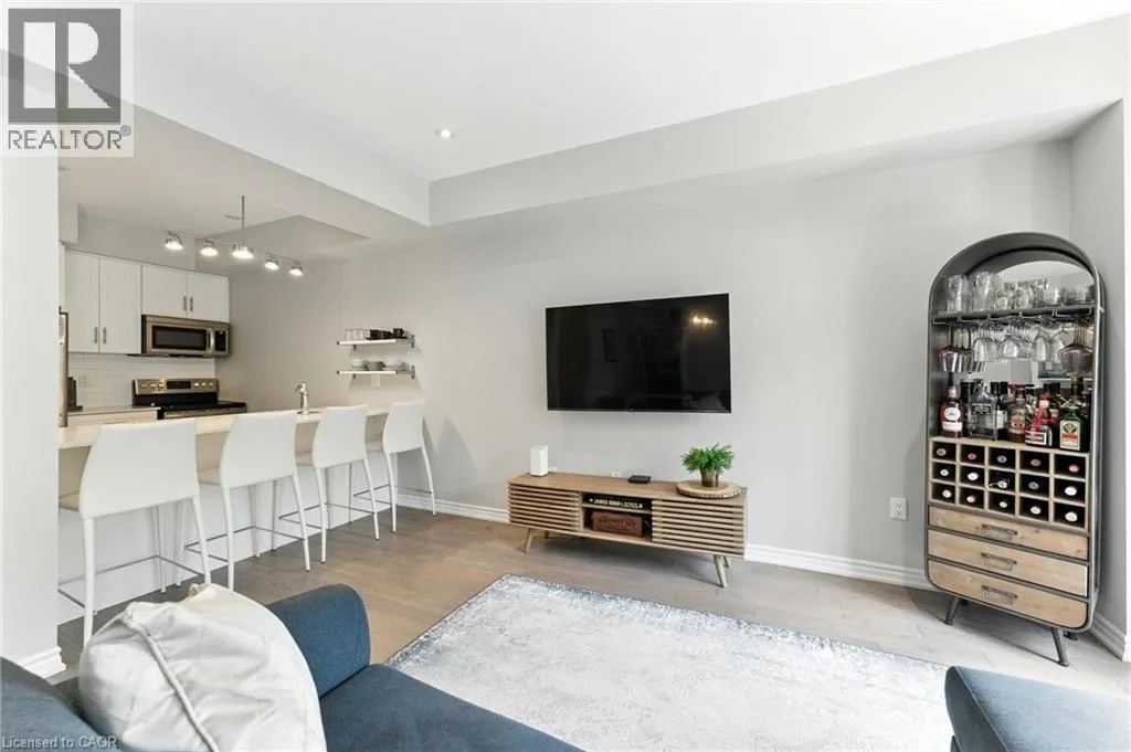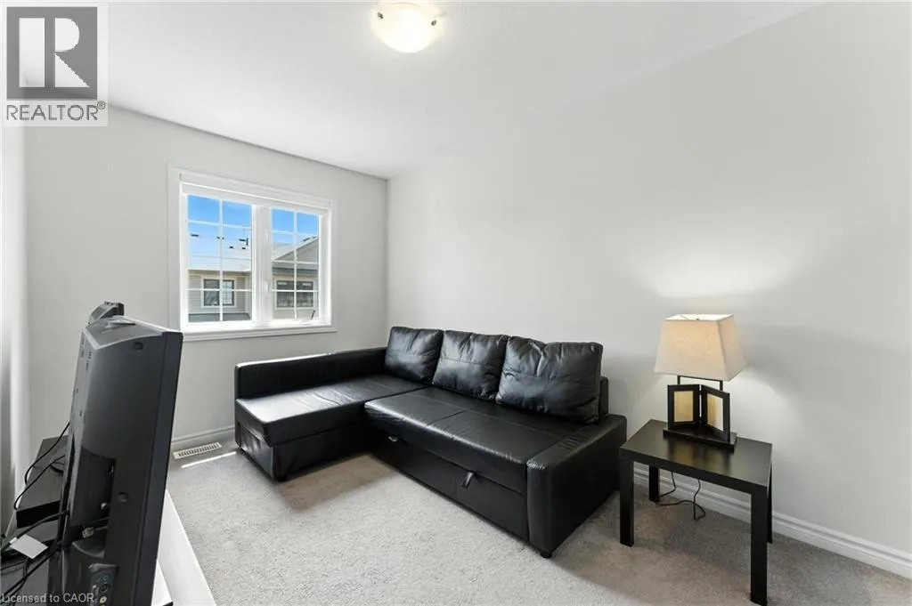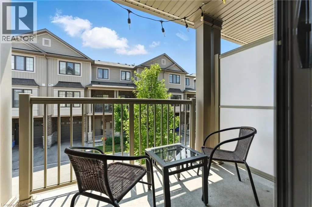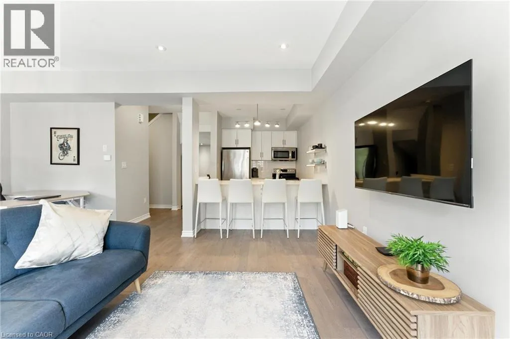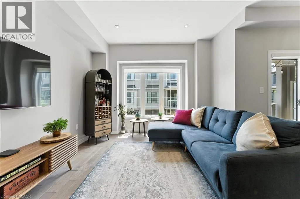Welcome to this bright and spacious 2-bedroom, 2-bathroom townhome nestled in a quiet and desirable Ancaster neighbourhood. Designed with both comfort and functionality in mind, this home wonât disappoint! The main floor features a versatile multi purpose den, perfect for a home office, workout area, or cozy retreat, along with a large closet for ample storage. Upstairs, discover a stunning open-concept living space bathed in natural light from expansive windows and patio doors leading to a Juliet balcony. Entertain with ease in the upgraded kitchen, complete with stainless steel appliances, quartz countertops, pot lights, a breakfast bar that comfortably seats four, and a seamless flow into the dining area. The living room is equally inviting, featuring wide-plank hardwood floors and brilliant natural light by day, transitioning to warm, ambient lighting at night. The third floor offers an upgraded primary bedroom with a generous walk-in closet and a large window that fills the space with light. A spacious second bedroom also features a walk-in closet, offering plenty of room for guests, family, or additional office space. Convenient bedroom-level laundry adds modern practicality, while the main bathroom impresses with a double vanity and a sleek glass-enclosed shower. Ideally located just minutes from the vibrant Meadowlands shopping and dining district, highway access, and scenic nature trails, ensuring the perfect balance of urban convenience and peaceful surroundings. (id:27476)