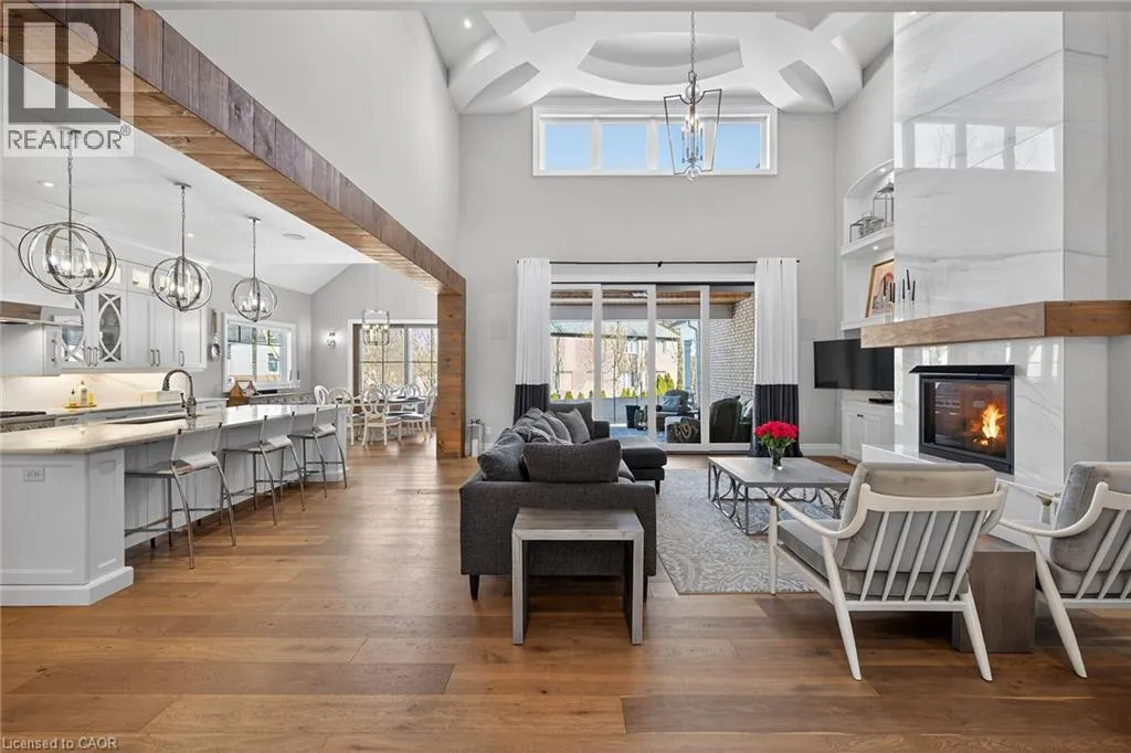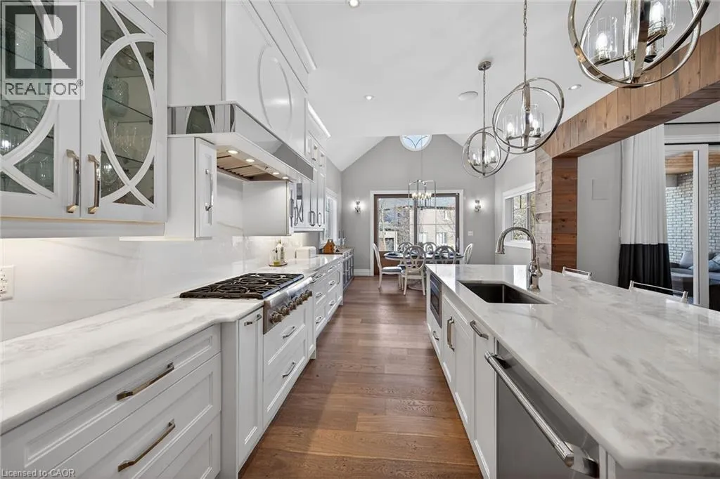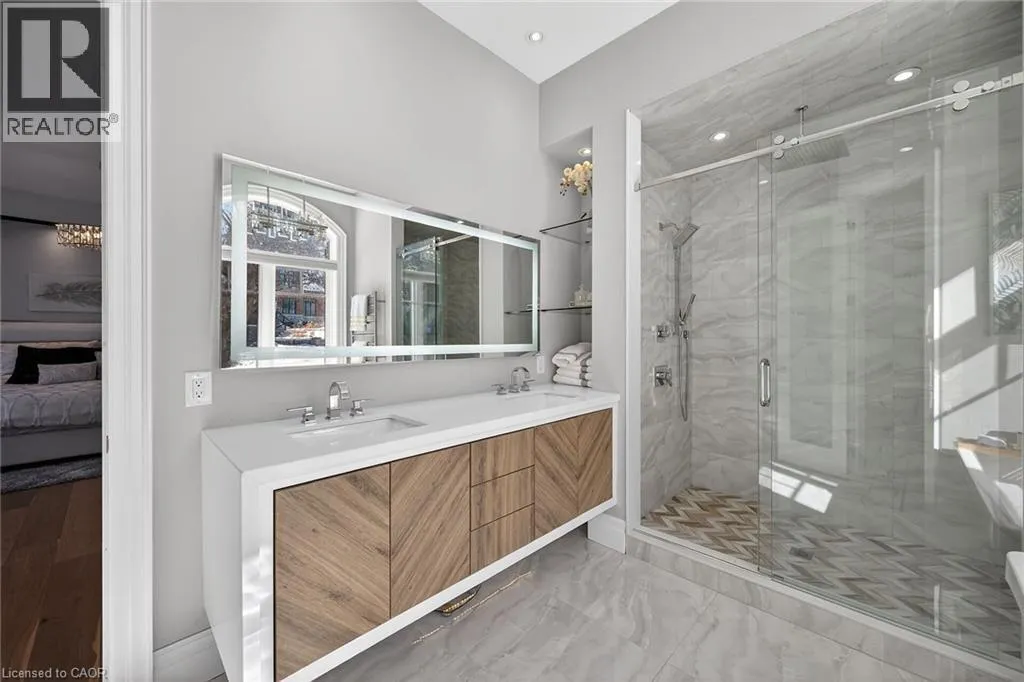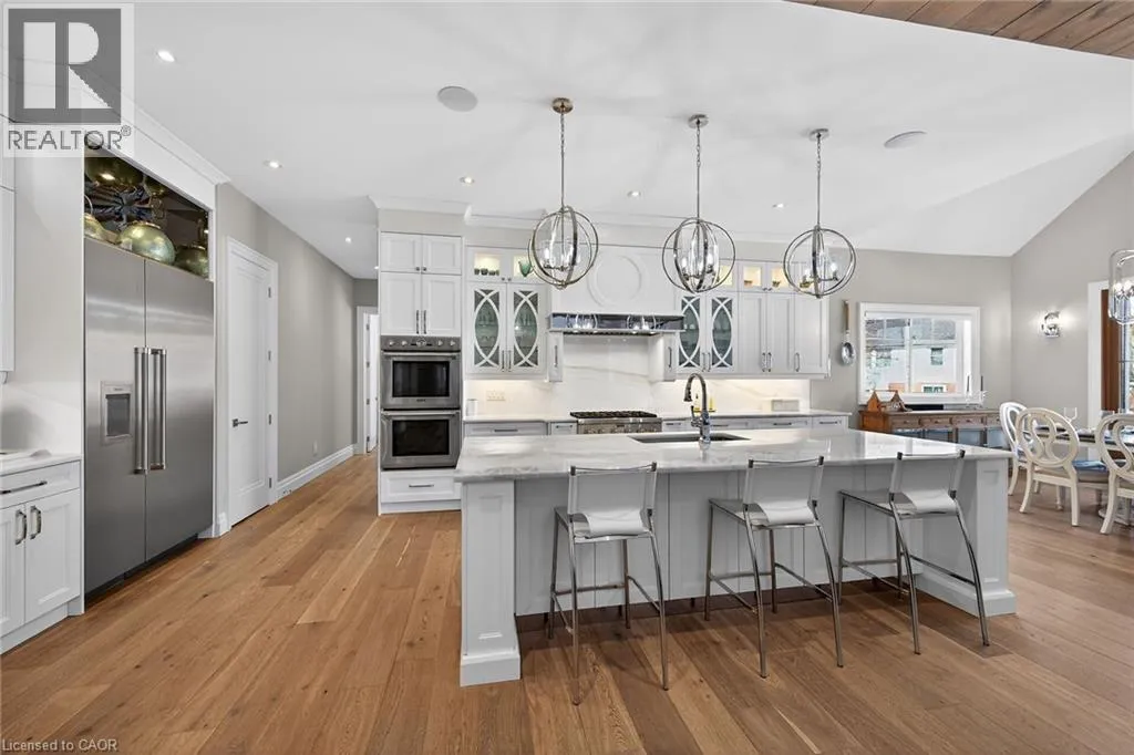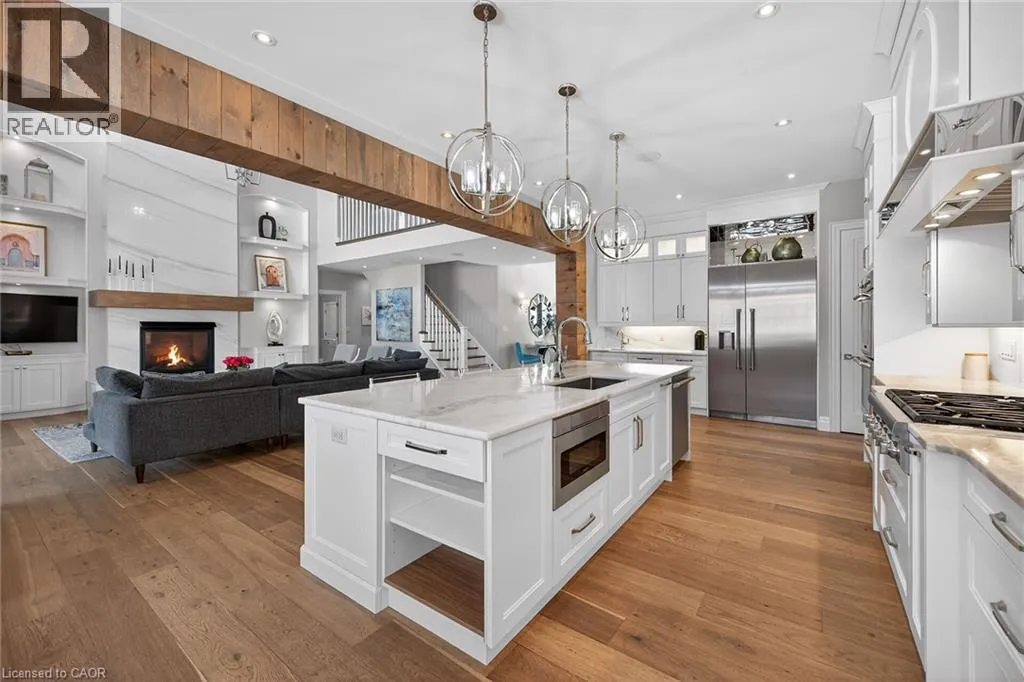 Wilson St, right on Montgomery. Right on Vernon Court A rare Luxury Home with attached Private Suite in a highly sought after location. This exceptional custom-built residence offers approx. 4,960 sq. ft. of thoughtfully designed living space, including a fully integrated 900 sq. ft. private suite â perfect for multi-generational living, a nanny or caregiver, or potential income opportunities. A rare find that combines elegance, flexibility, and everyday functionality for todayâs modern family. The 3,800 sq. ft. main home showcases outstanding craftsmanship & premium finishes throughout. The sun-filled main-floor Master retreat provides comfort & convenience, complete with dual walk-in closets & a spa-inspired 5pc ensuite featuring a soaker tub, heated floors, heated towel rack, & custom glass shower. A private den with custom built-ins creates the ideal work-from-home space or quiet retreat. Designed for gathering & entertaining, the oversized eat-in kitchen features striking quartzite countertops, a large island, walk-in pantry, separate prep kitchen & built-in Thermador appliances. The impressive two-storey family room with custom tile-surround gas fireplace & built-in cabinetry flows seamlessly to the covered rear patio through an oversized triple-pane accordion door system, creating beautiful indoor-outdoor living. A well-appointed mudroom & main-floor laundry complete with custom dog wash add everyday practicality. Venture upstairs to a spacious media room with its own 3-piece ensuite offering flexible living space for teens or guests, along with three additional bedrooms and another full bathroom. The attached 1-bedroom private suite is connected through the mudroom yet fully self-contained, offering a separate side entrance and dedicated garage parking. Featuring vaulted ceilings, a custom fireplace, full kitchen, private laundry, covered patio, & a large bedroom with ensuite bath allowing both independence and comfort while remaining connected to the main home (id:27476)