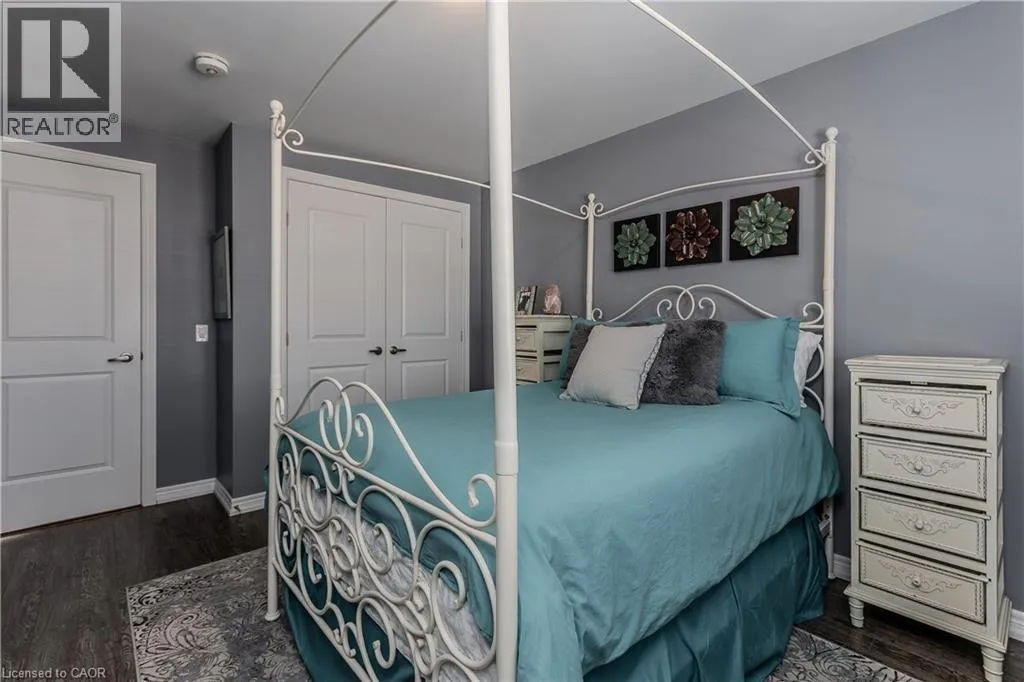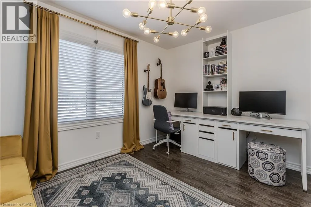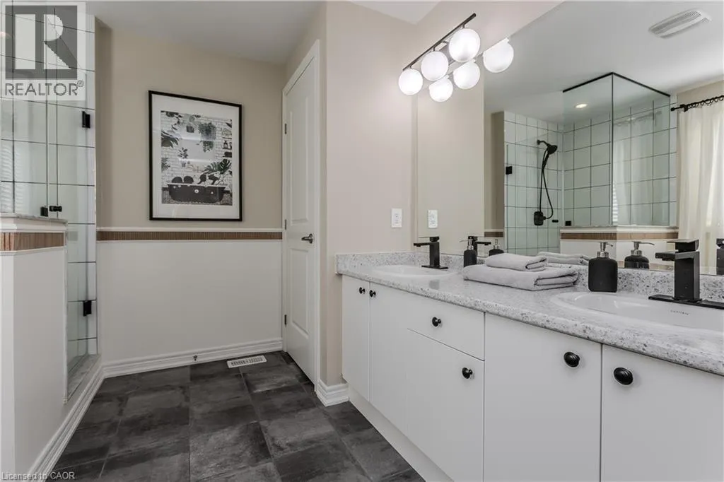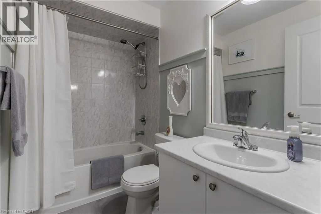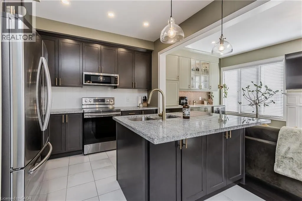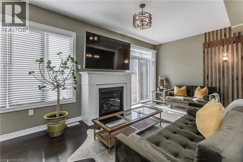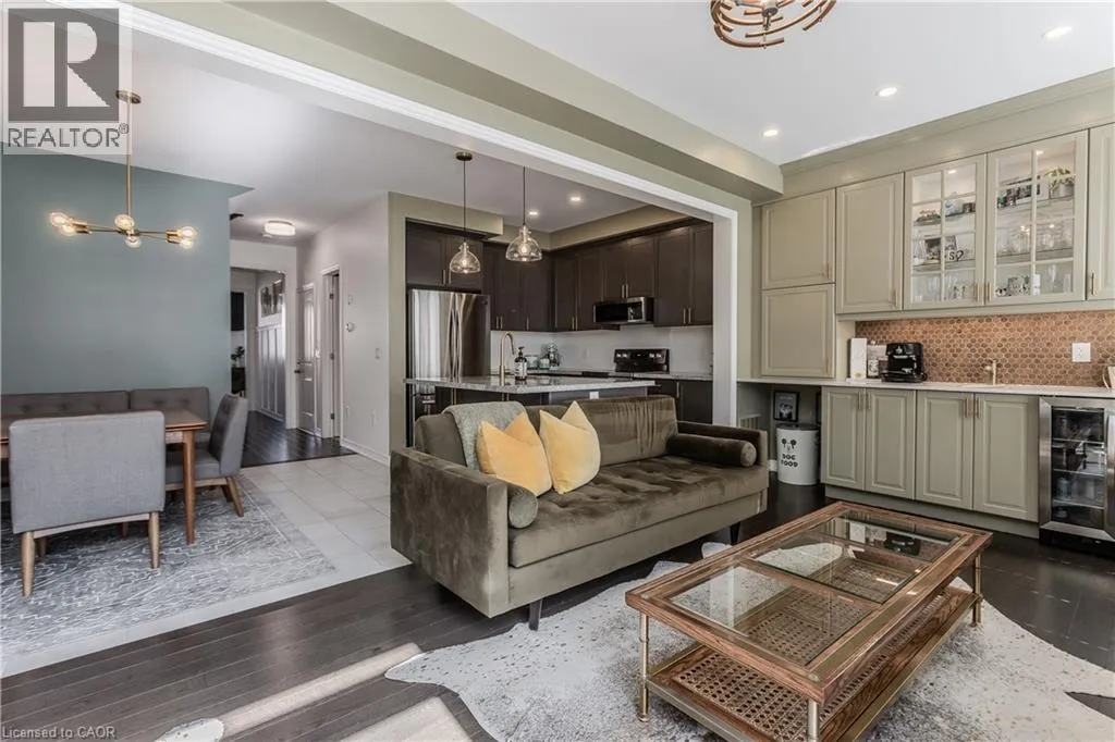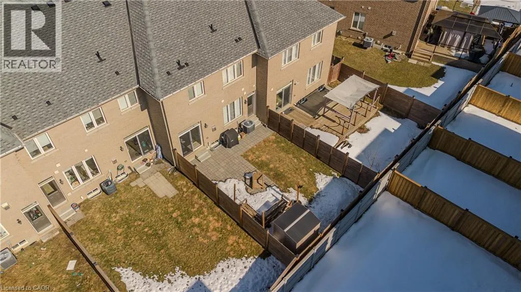 Garner Road to Raymond Road to Heming Trail Welcome to this beautifully updated freehold townhome with 1933sf of living space in the heart of the Meadowlands communityâan ideal place for families looking for comfort, style, and convenience. Located near a vibrant shopping centre with dining, retail, and a movie theatre, this home also offers easy access to schools, everyday amenities and hwys. Freshly painted throughout, the home feels modern, and move-in ready. The exterior offers welcoming curb appeal with a stone façade, aggregate porch, and an extra wide single driveway. Step inside to an inviting entryway featuring shaker-style board and batten and a stylish feature wall. Hardwood flooring flows throughout the main level, where design and functionality shine. The kitchen features granite countertops, tile backsplash, SS appliances, designer lighting, and elegant gold hardware. Soft-close cabinetry, and an island with built-in storage add convenience, while the breakfast nook with booth seating creates the perfect spot for casual family meals. The living room offers a warm and welcoming gathering space with a gas fireplace, large window, and walkout to the backyard. A built-in coffee bar with tile backsplash and beverage fridge adds a stylish and functional touch for entertaining. Upstairs, laminate flooring runs throughout the bedrooms. The expansive primary suite is a peaceful retreat, highlighted by a picture moulding feature wall, spacious walk-in closet, and spa-inspired 5-piece ensuite with dual sink vanity, freestanding tub, glass shower, and custom trim details. Two additional bedrooms, a 4-piece main bathroom, and convenient bedroom-level laundry complete the upper floor. The fully fenced backyard offers a private outdoor space with an interlock patio, green space for kids and pets to play, a shed for storage, and a BBQ gas line ready for future summer entertaining. A wonderful opportunity to enjoy stylish, low-maintenance living in one of Ancasterâs most desirable family-friendly communities. (id:27476)