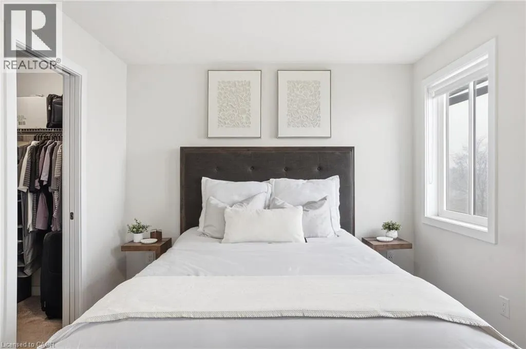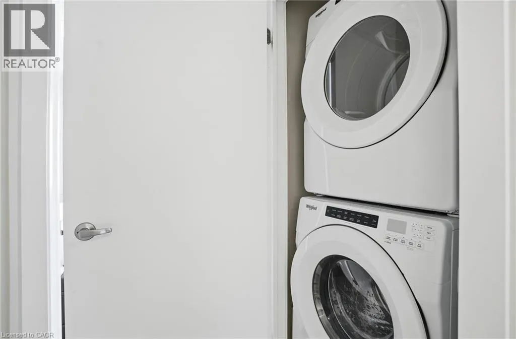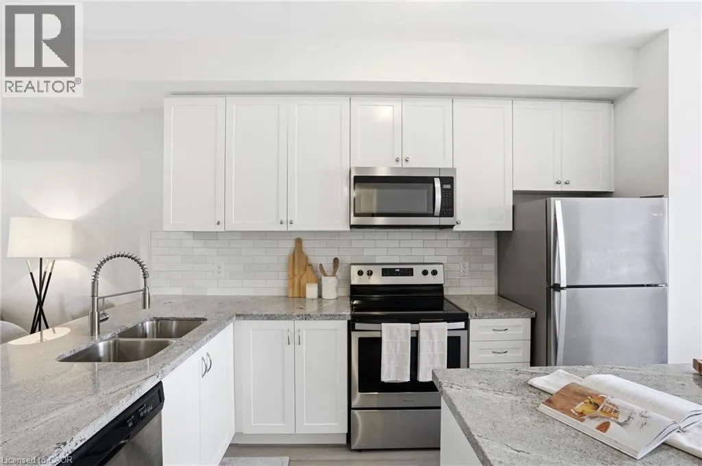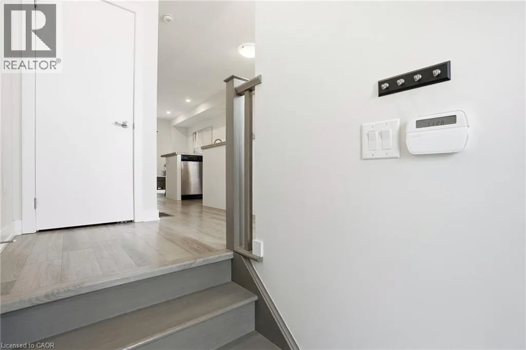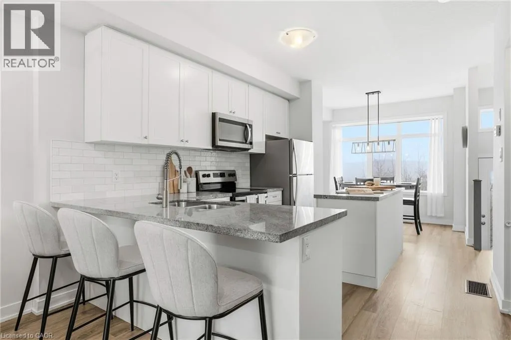 Welcome to this bright and thoughtfully designed 2-bedroom, 1.5-bathroom home in sought-after Ancaster. With 9-foot ceilings, the second floor features an open-concept living room, kitchen, and dining area. The spacious living room with pot lights opens onto a deck, while the kitchen includes granite countertops, shaker cabinetry, an island, and a peninsula with seating that provides additional storage and counter space. Upstairs, you will find two generously sized bedrooms, a full bathroom, convenient third-floor laundry, and a primary bedroom with a walk-in closet. The ground level offers inside access to the garage, a powder room, and a family room with a walkout to the backyard. Low condo fees of $115/month cover building insurance, common elements, and parking. A standout opportunity in a highly desirable Ancaster location. (id:27476)