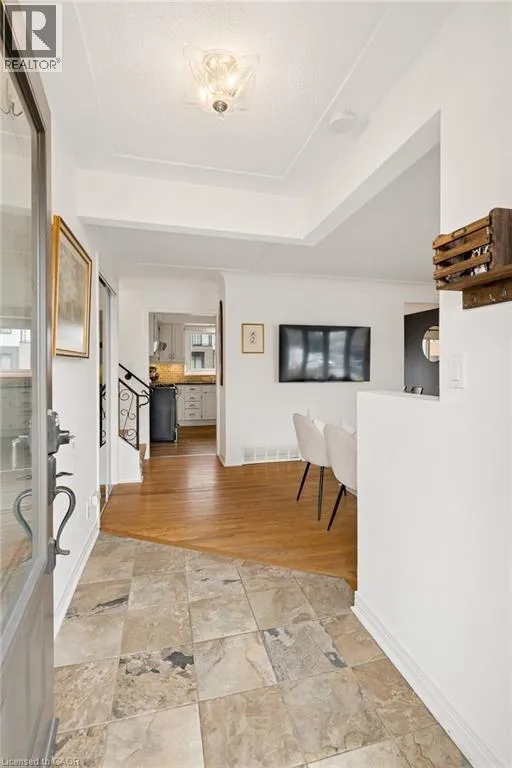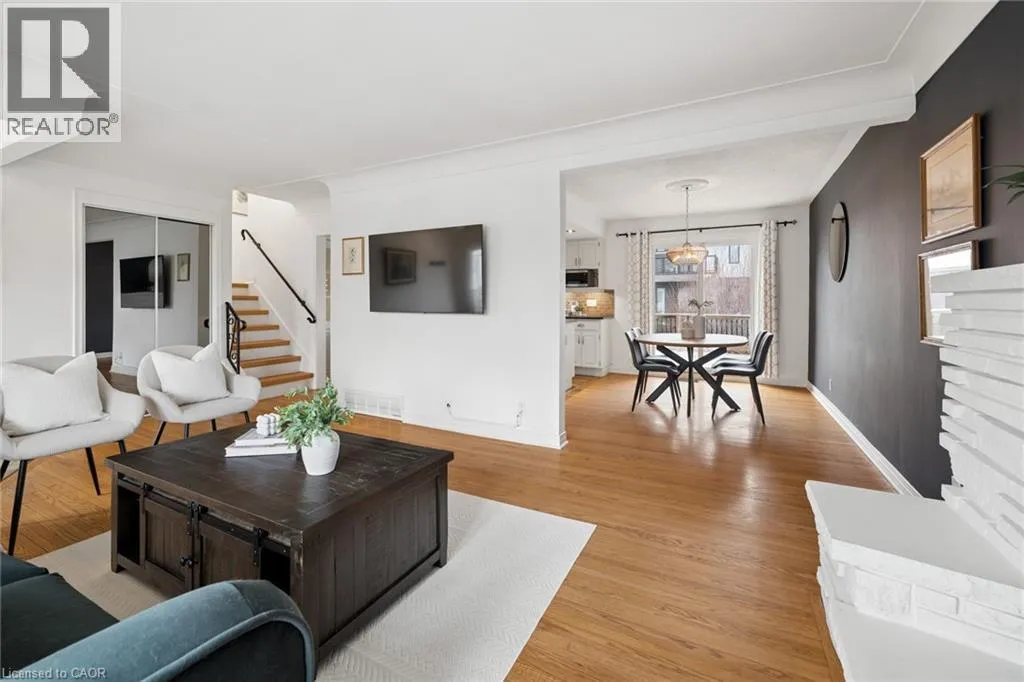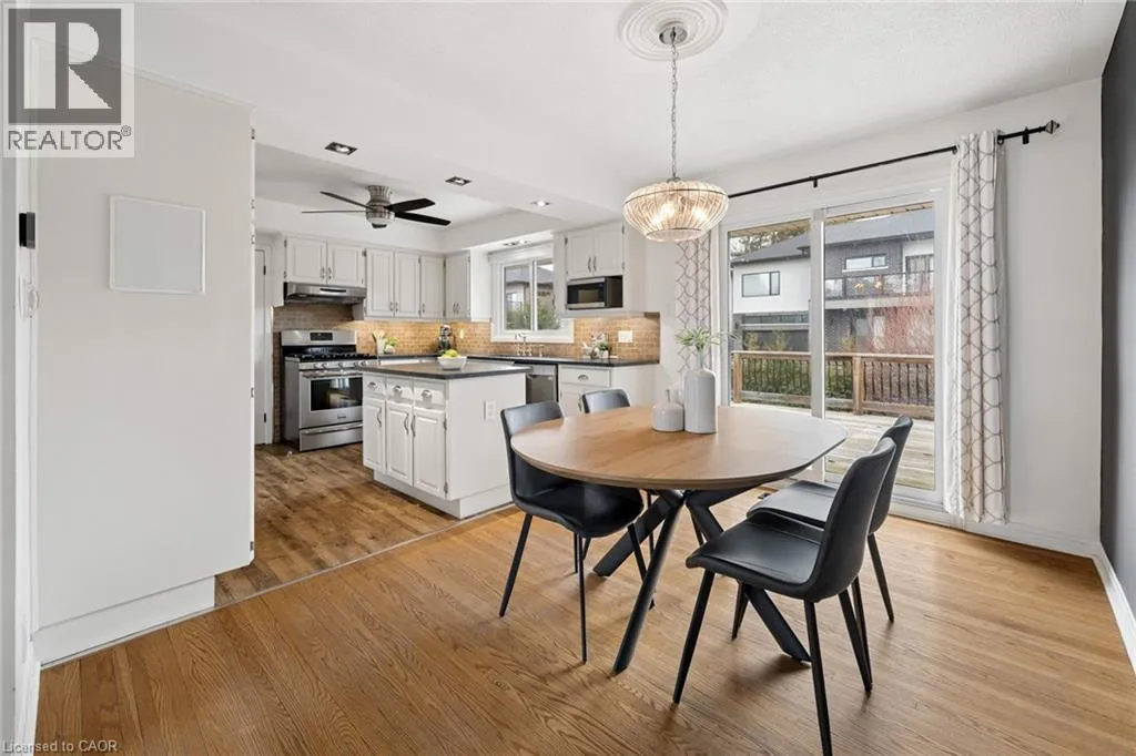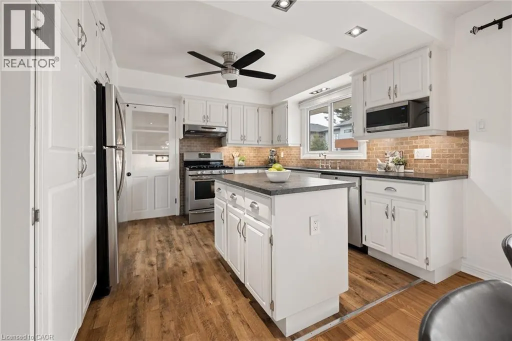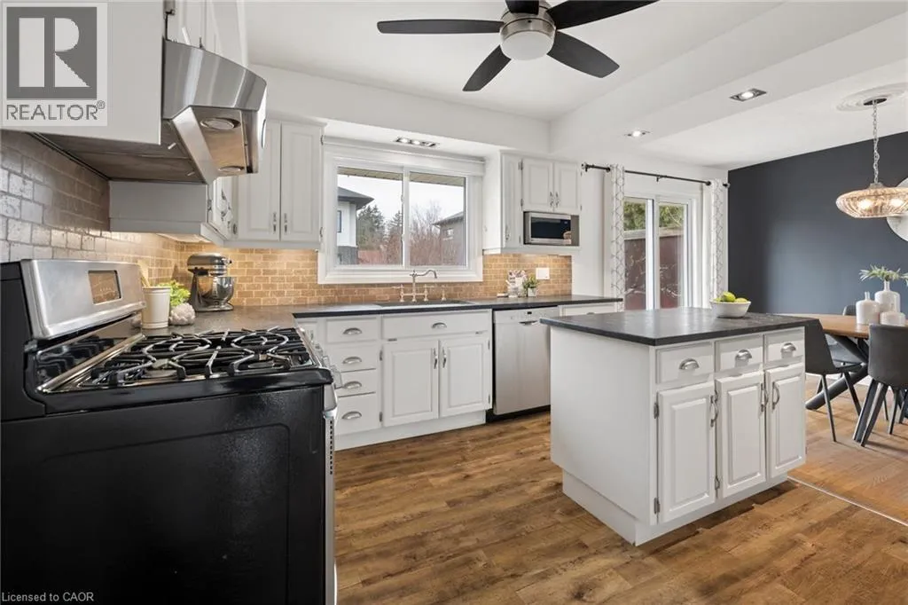 Fiddlers Green Rd to Douglas Rd Set on a wide 75 by 98 foot lot in one of Ancasterâs more established pockets. The curb appeal is apparent when you walk up the wide and long stone entry surrounded by mature trees, clean landscaping and lighting. Inside, the multi-level layout is well designed while keeping the principal rooms large with great sightlines. A bright front living space for everyday use, and a comfortable family room anchored by a fireplace that naturally becomes a place to gather. The kitchen has been updated with leathered stone counters, an island, and a dining area, and it connects directly out to the deck, which makes hosting or weeknight dinners outside feel effortless. The lower main level adds a lot of flexibility with a mudroom, garage access, a two piece bath, and a fourth bedroom or office depending on what you need. Upstairs, three well sized bedrooms and a clean, updated four piece bath. Downstairs, a finished rec room, laundry with an additional shower, and plenty of storage space. The backyard is set up for low maintenance enjoyment. A large deck, patio area, and a custom shed, all private and easy to use whether itâs a quiet morning or a full house on the weekend. Key updates have been taken care of over the years, including the roof, windows, furnace and AC, deck, and more, a true turn-key home. The location, itâs hard to beat. Walkable to parks and schools, Hamilton Golf and Country Club, Fortinos and quick access to the 403 when you need it. A solid home in a great neighborhood, with a layout and feel that works for all of life's stages (id:27476)