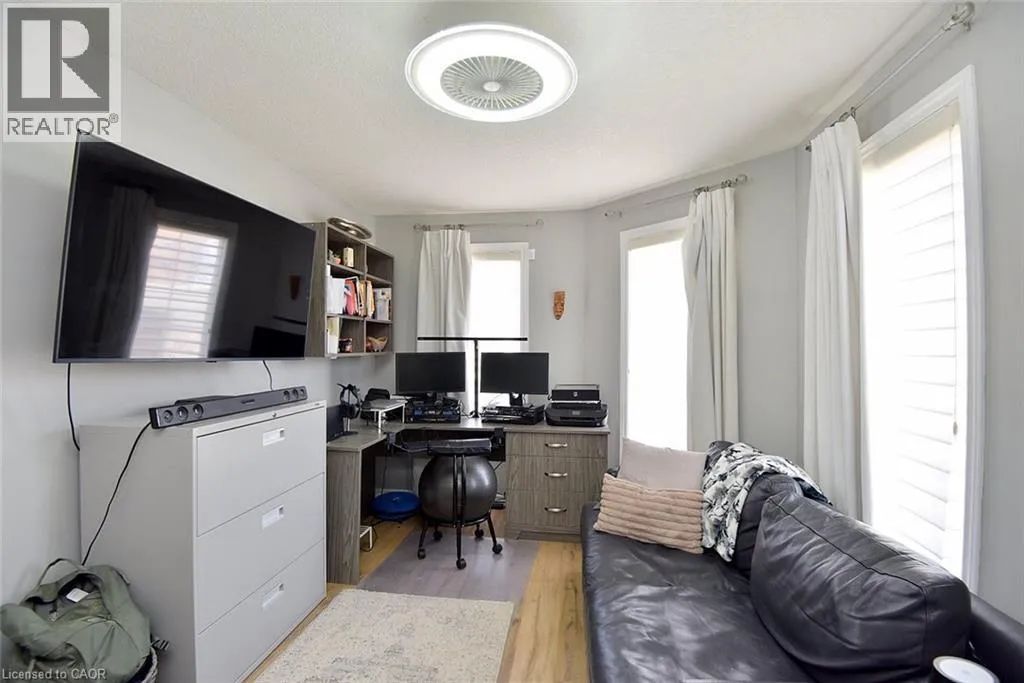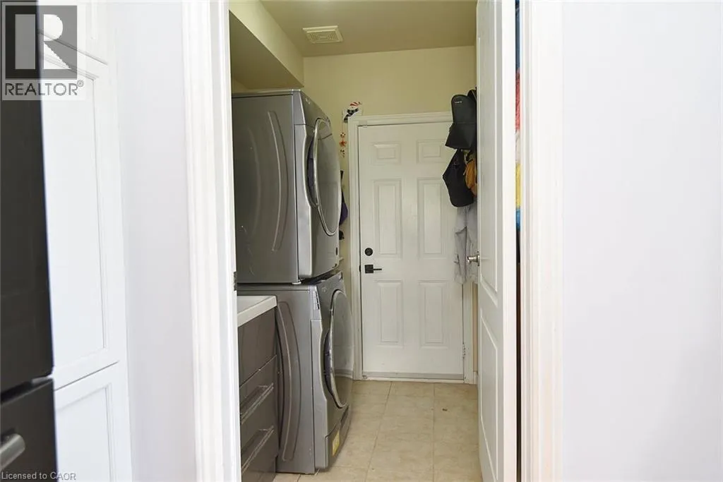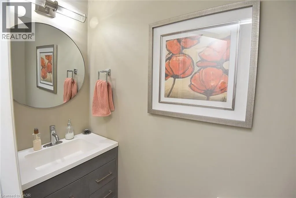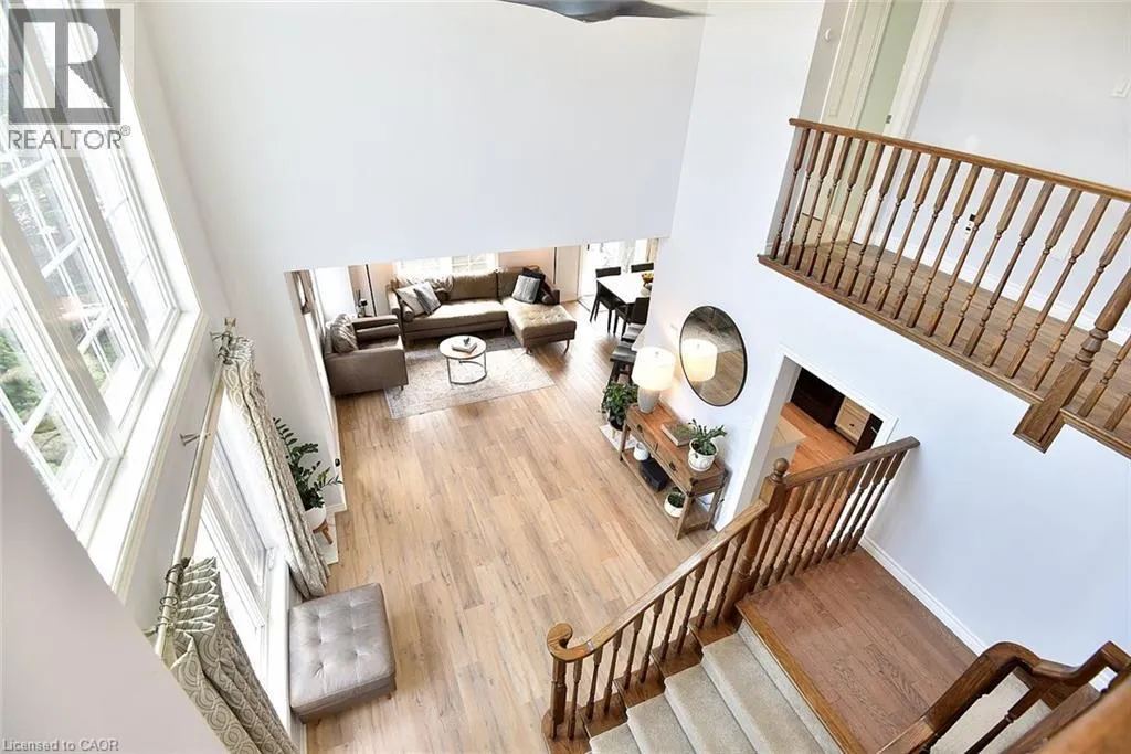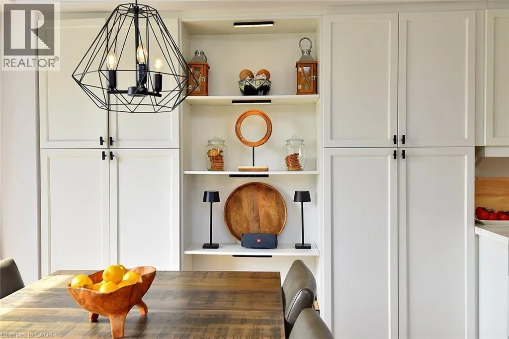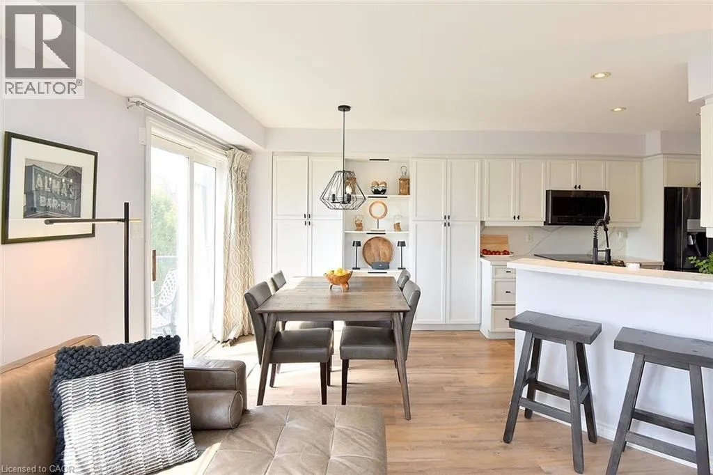 Garner Rd. to Panabaker. Welcome to this beautifully maintained end-unit townhome in the heart of Ancaster, offering exceptional curb appeal and an impressive amount of living space. With approximately 2,452 sq ft of finished living space (1860 sqft above grade + 592 sqft below), this home is ideal for families seeking both comfort and functionality. The main level features a grand double-door entry, elegant Palladian-style windows in the dining area, a main floor office/den, and spacious principal rooms. The updated kitchen offers granite countertops, a breakfast bar, built-in pantry cabinetry, and a bright dinette area, with convenient access to the backyard. A main floor laundry room, updated 2-piece powder room, and custom window treatments complete this level. Upstairs, the generous primary suite includes a beautifully updated ensuite, complemented by two additional bedrooms and a recently renovated 4-piece family bathroom with quality finishes. Newer broadloom adds warmth throughout the second level. The finished lower level provides additional living space with a family room featuring built-in shelving/entertainment unit, a home office area, gym space, and a 2-piece bathroom. Enjoy a fully landscaped, fenced backyard with a composite deck, stone patio, and gated accessâperfect for outdoor living and entertaining. Ideally located close to downtown Ancaster, parks, schools including Bishop Tonnos, highway access, and everyday amenities. (id:27476)