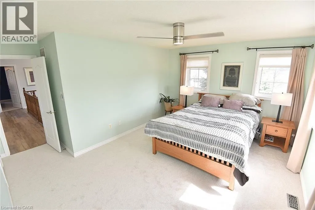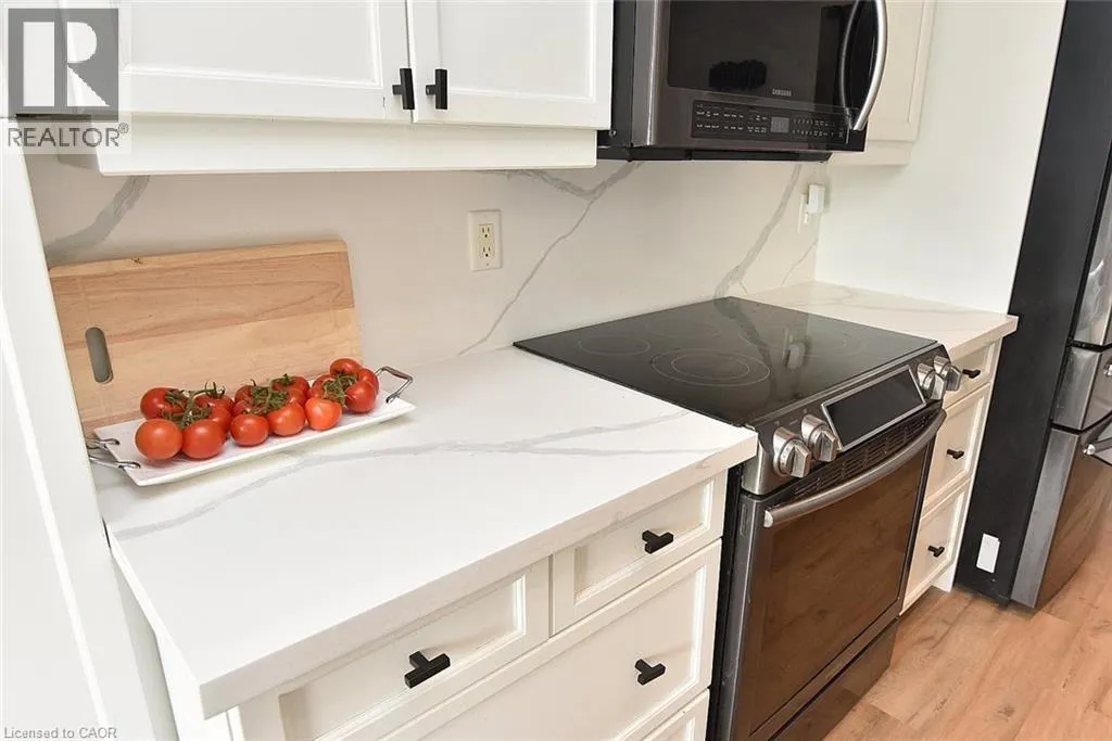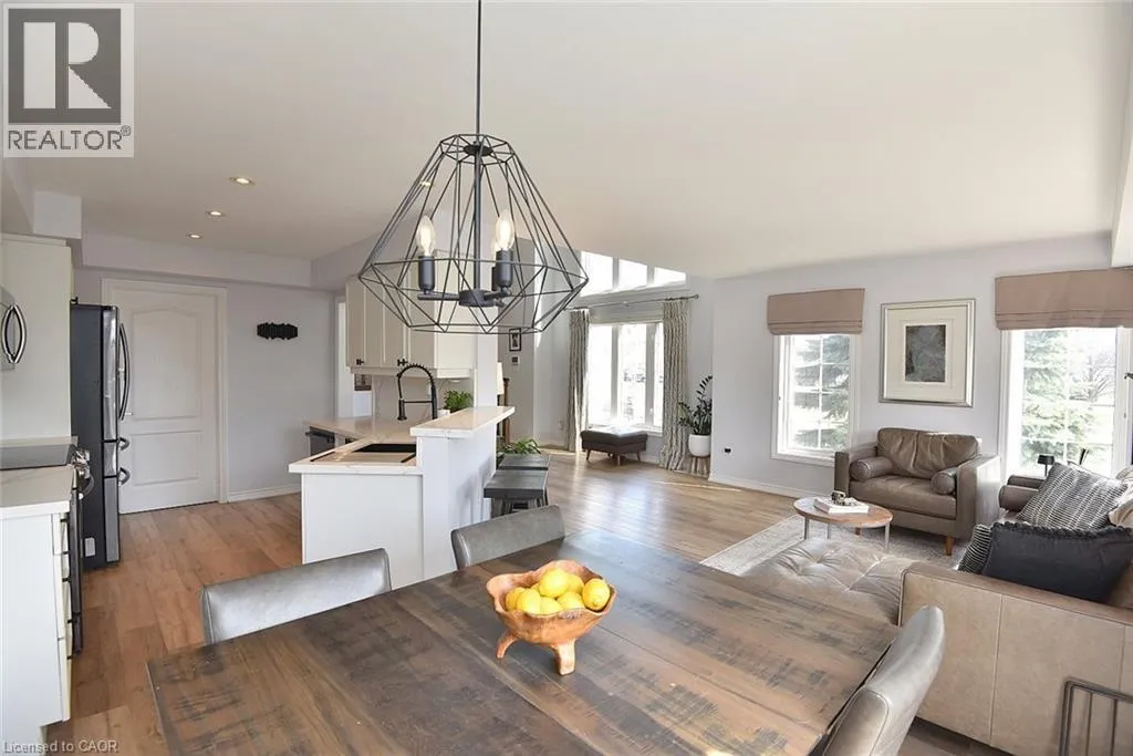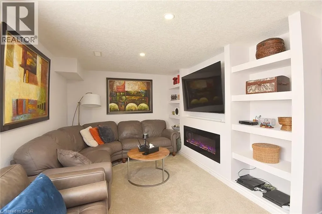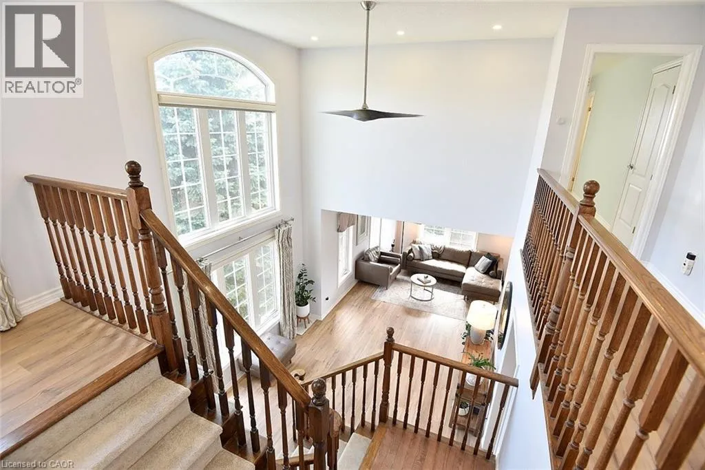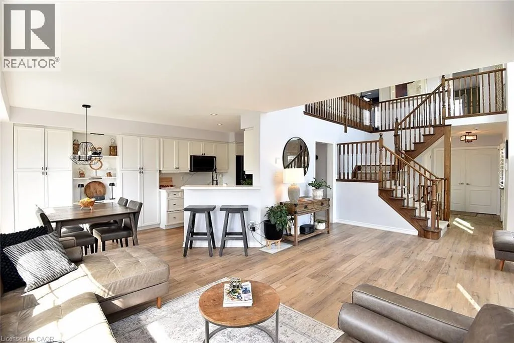Garner Rd. to Panabaker. Welcome to this beautifully maintained end-unit townhome in the heart of Ancaster, offering exceptional curb appeal and an impressive amount of living space. With approximately 2,452 sq ft of finished living space (1860 sqft above grade + 592 sqft below), this home is ideal for families seeking both comfort and functionality. The main level features a grand double-door entry, elegant Palladian-style windows in the dining area, a main floor office/den, and spacious principal rooms. The updated kitchen offers granite countertops, a breakfast bar, built-in pantry cabinetry, and a bright dinette area, with convenient access to the backyard. A main floor laundry room, updated 2-piece powder room, and custom window treatments complete this level. Upstairs, the generous primary suite includes a beautifully updated ensuite, complemented by two additional bedrooms and a recently renovated 4-piece family bathroom with quality finishes. Newer broadloom adds warmth throughout the second level. The finished lower level provides additional living space with a family room featuring built-in shelving/entertainment unit, a home office area, gym space, and a 2-piece bathroom. Enjoy a fully landscaped, fenced backyard with a composite deck, stone patio, and gated accessâperfect for outdoor living and entertaining. Ideally located close to downtown Ancaster, parks, schools including Bishop Tonnos, highway access, and everyday amenities. (id:27476)
