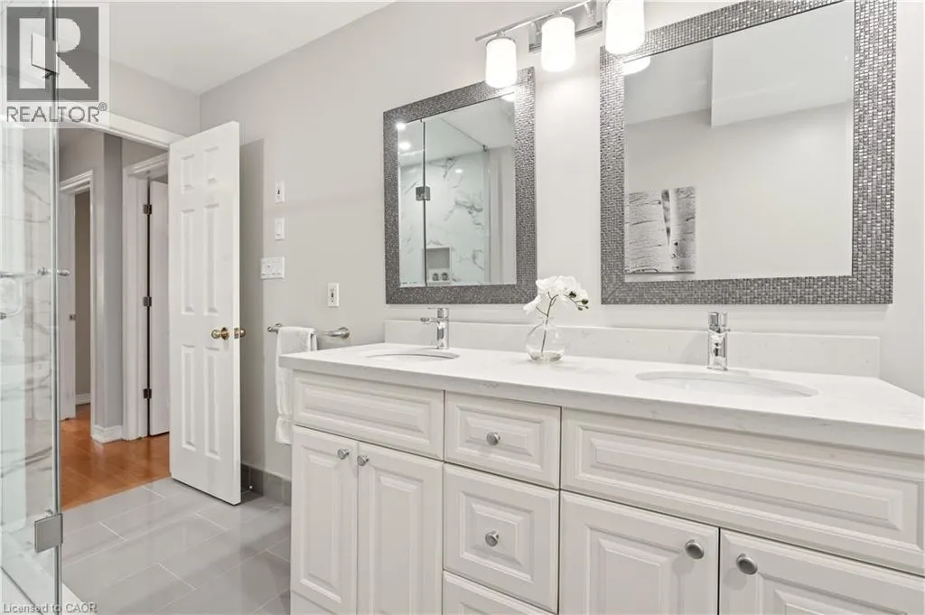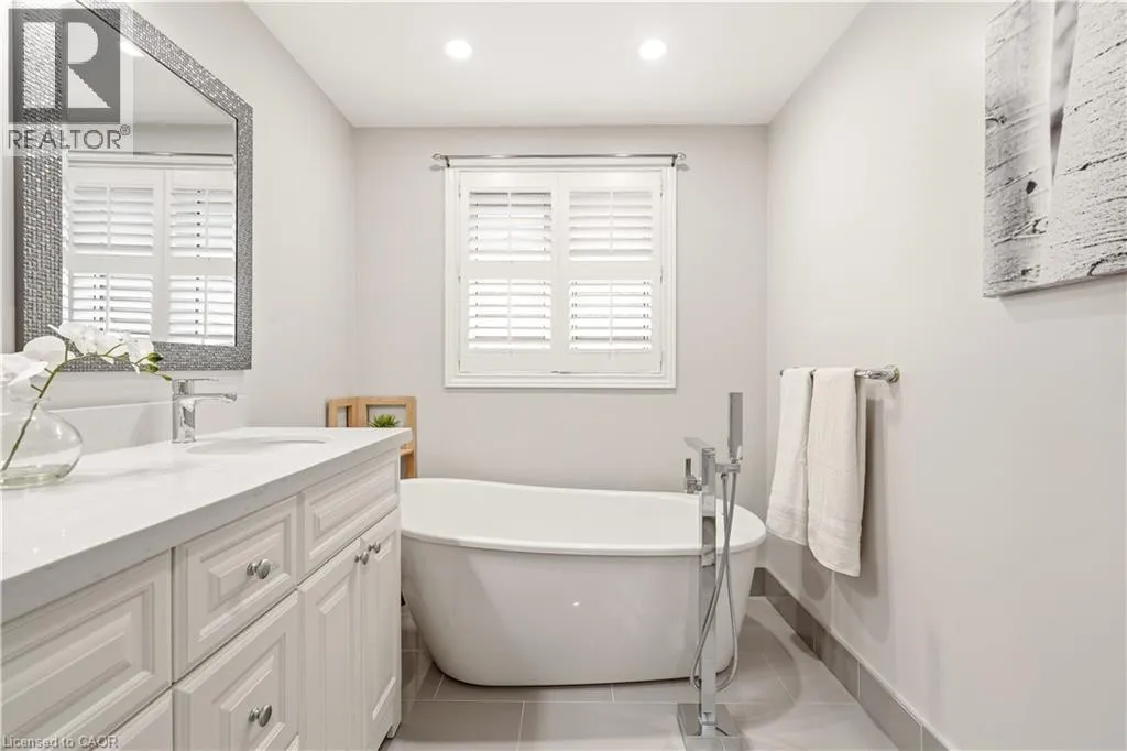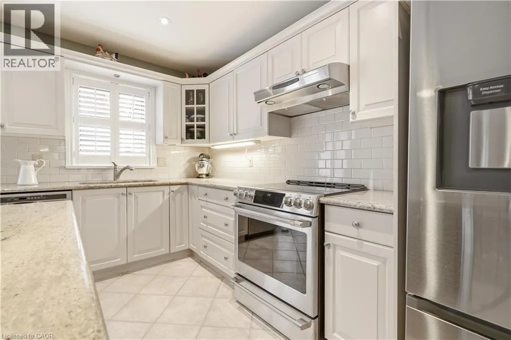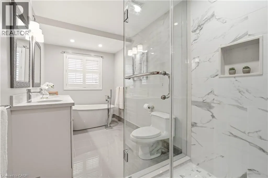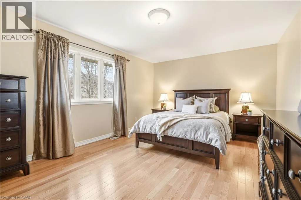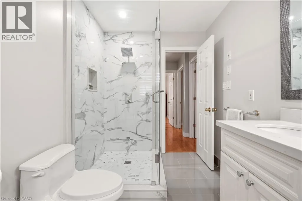 From Wilson St, take Jerseyville Rd W This beautifully maintained detached backsplit in Ancaster, built in 2001, offers the perfect blend of space, comfort, and low-maintenance living. With almost 3,000 square feet of finished living space, this move-in ready home features 4 bedrooms, 2 full bathrooms, and a convenient powder room on the main level. The bright, open-concept main floor seamlessly connects the living room, dining area, and kitchenâideal for both everyday living and entertaining. The kitchen is thoughtfully designed with an eat-at island, stone countertops, and sleek stainless steel appliances, all complemented by neutral finishes throughout. Upstairs, youâll find three generously sized bedrooms and a stunning, recently renovated spa-like bathroom complete with a soaker tub, double sink vanity, and a walk-in glass shower. Carpet-free throughout, the home showcases rich hardwood flooring that adds warmth and continuity. The lower level features a spacious family room with a cozy gas fireplace and walkout access to a private backyard retreatâyour own secret garden filled with low-maintenance perennials and lush greenery. This level also includes a separate fourth bedroom and full bathroom, making it ideal for guests or extended family. The basement offers additional flexibility with a mostly finished space perfect for a home office, in-law suite, or additional bedroom, along with ample storage throughout. The exterior impresses with exceptional curb appeal, a large double driveway, and a double car garage with parking for 6+ vehicles. Set in a quiet, tranquil neighbourhood surrounded by picturesque farmland, yet just minutes to shopping, everyday amenities, and quick access to the 403 and the Linc, this home truly offers the best of both worlds. (id:27476)