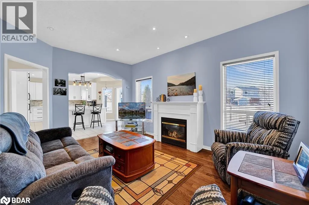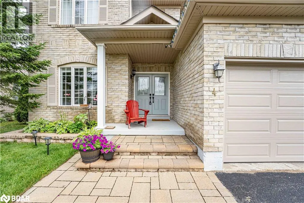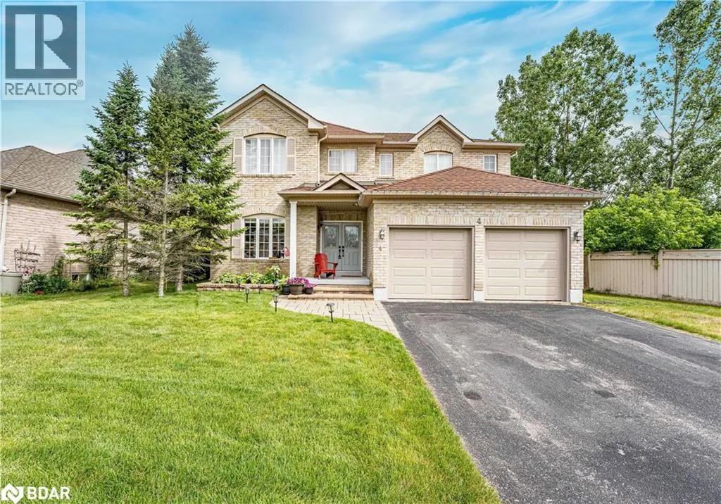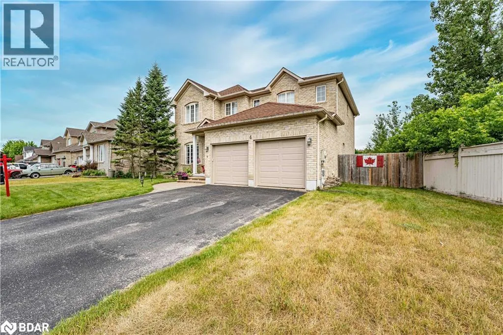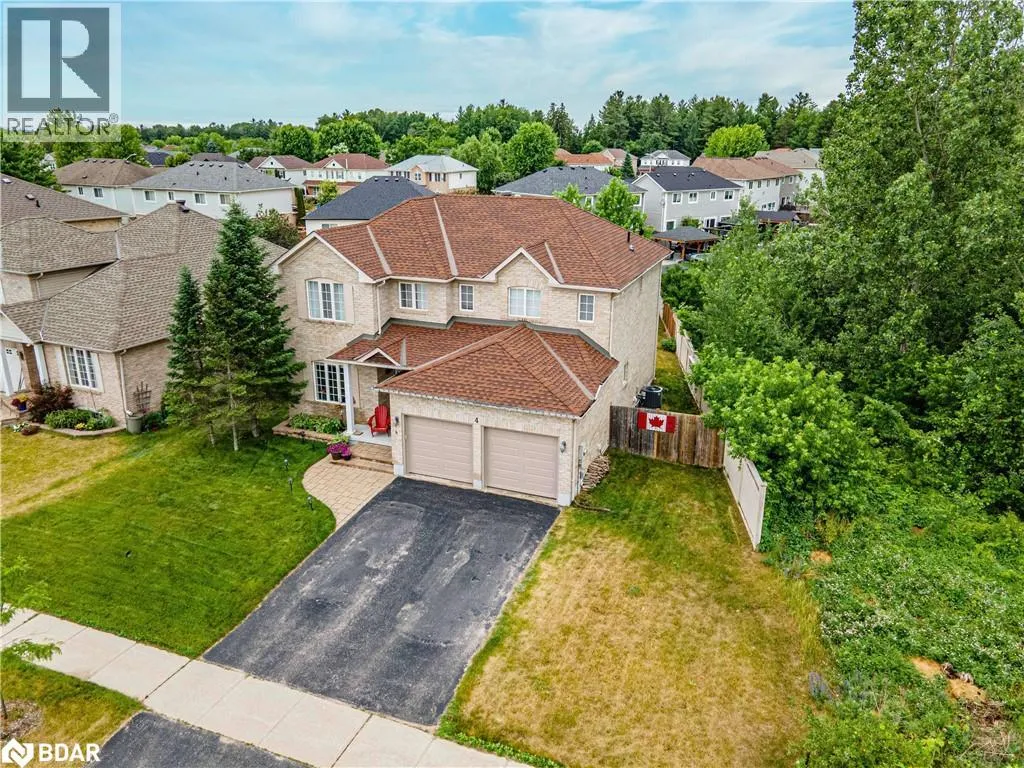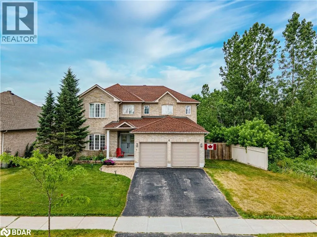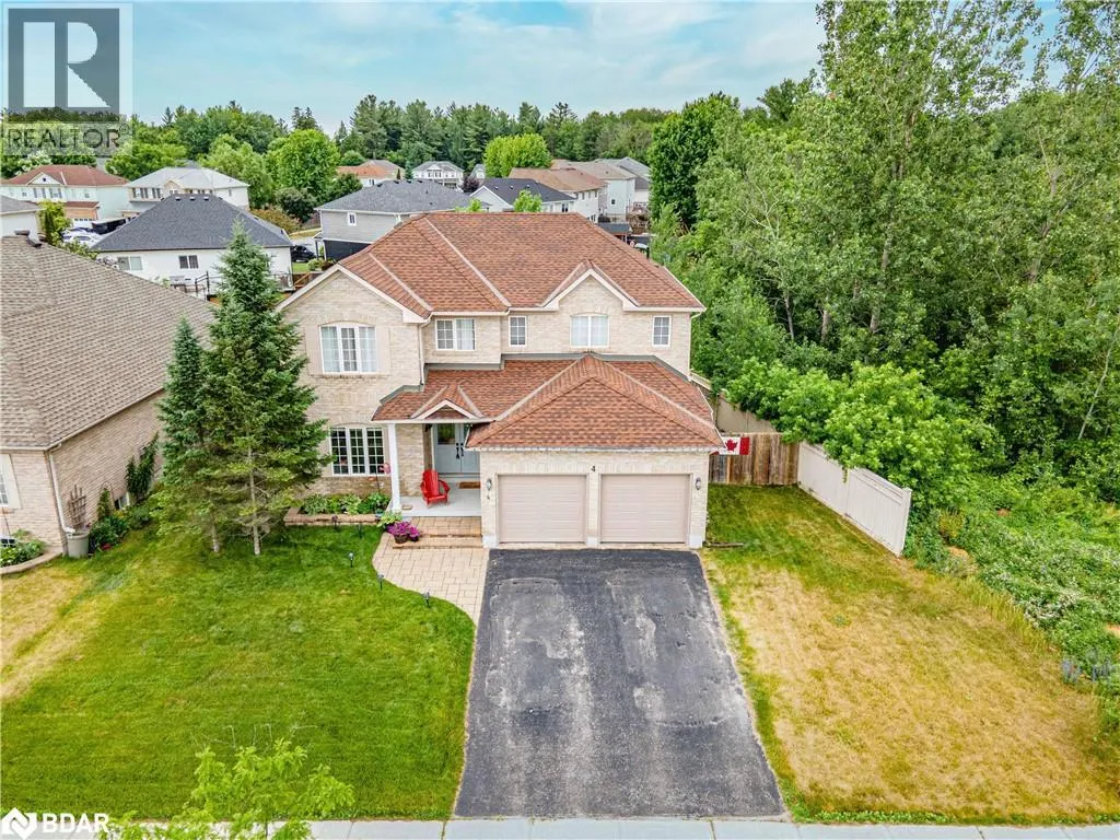 5TH LINE TO GOLD PARK GATE Discover this exceptionally well-maintained, all-brick family home at 4 Gold Park Gate in Angus. Boasting over 2800 sq. ft. of fully finished living space on great lot. This spacious and bright home features a double-door entry, 9-ft ceilings, and a formal living and dining room with hardwood floors and pot lighting. The beautifully renovated eat-in kitchen (2022) showcases quartz counters, a stylish backsplash, new appliances, pot lighting, a breakfast bar, and a walkout to a stone patio and fenced yard with a garden shed. The cozy family room offers a gas fireplace and hardwood flooring. A main floor laundry with garage access and a powder room add convenience. Upstairs, the refinished primary suite includes a walk-in closet, an ensuite with a new vanity and shower, and a relaxing corner jet tub. Three additional generously sized bedrooms complete the second floor. The finished basement features a large rec room, a 2-pc bath, and ample storage. Upgrades include new garage doors (2021), central air (2024), and a water softener. (id:27476)