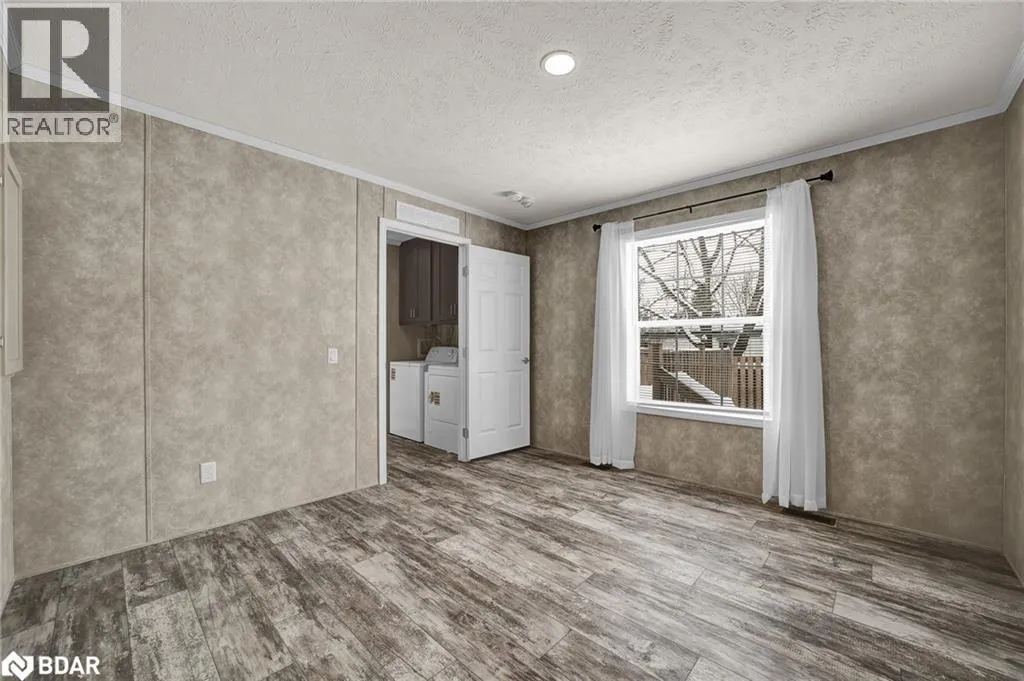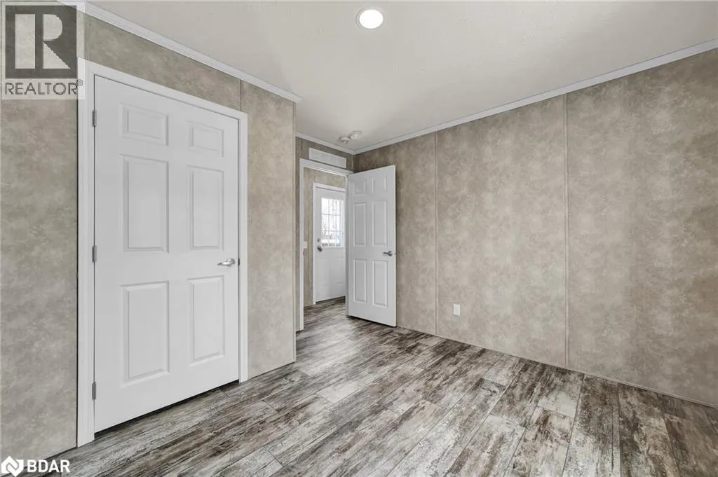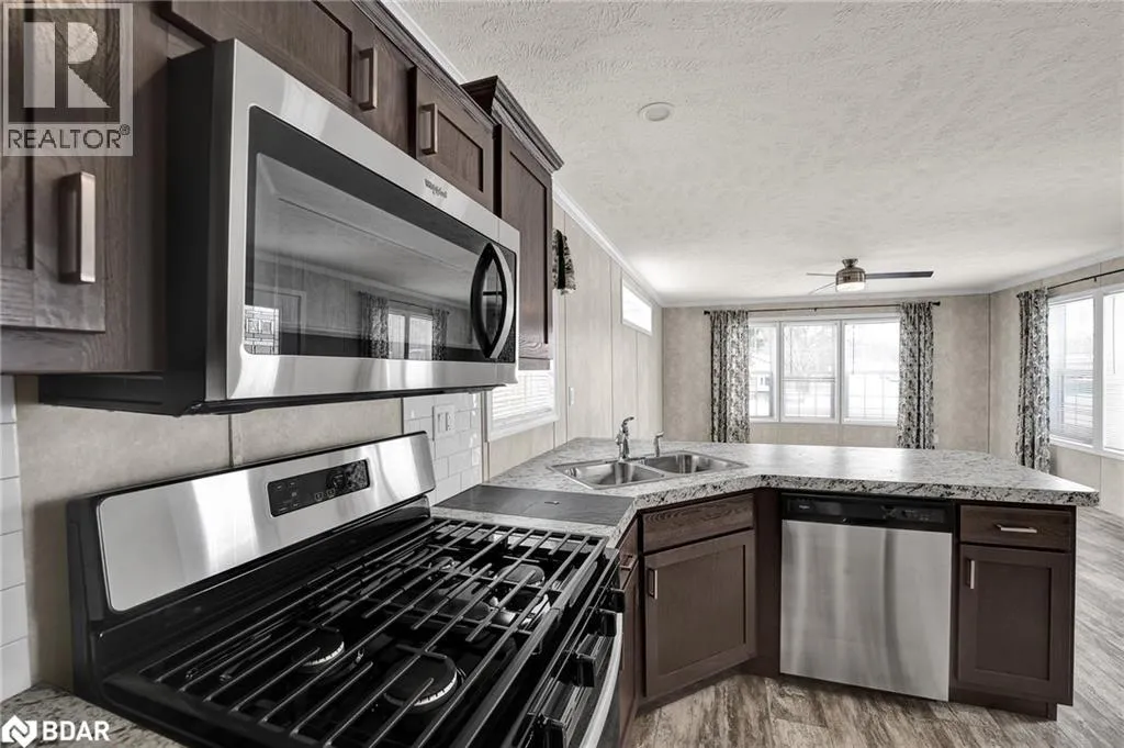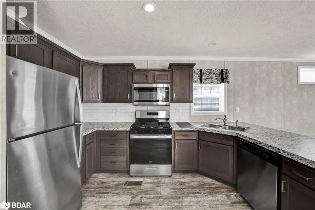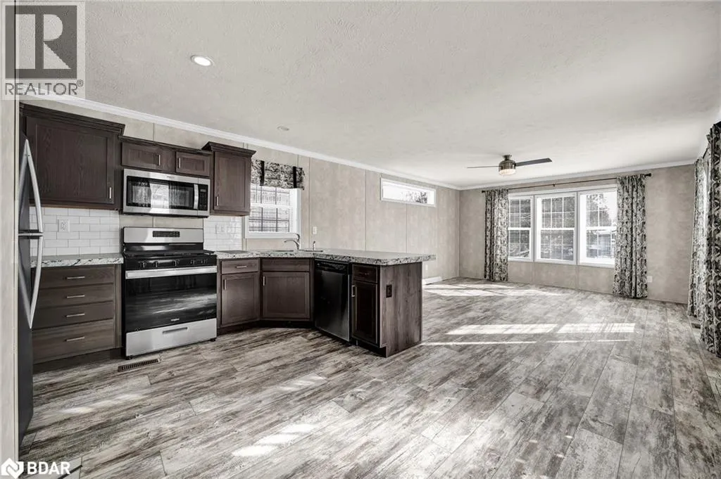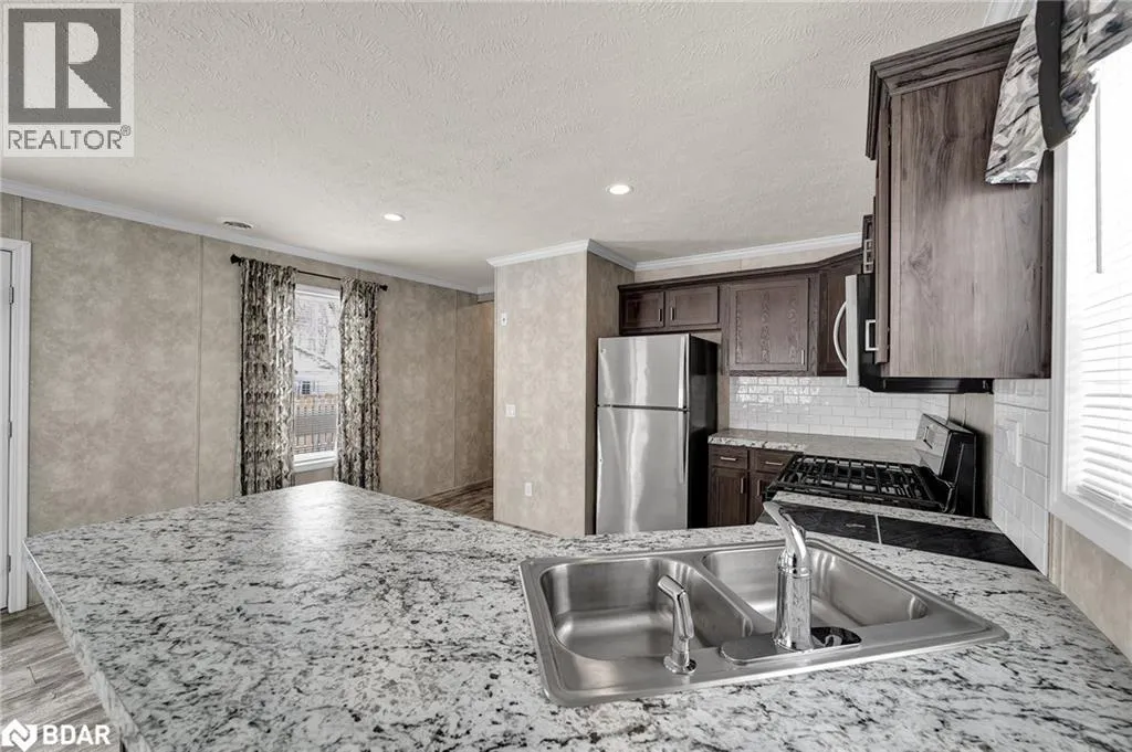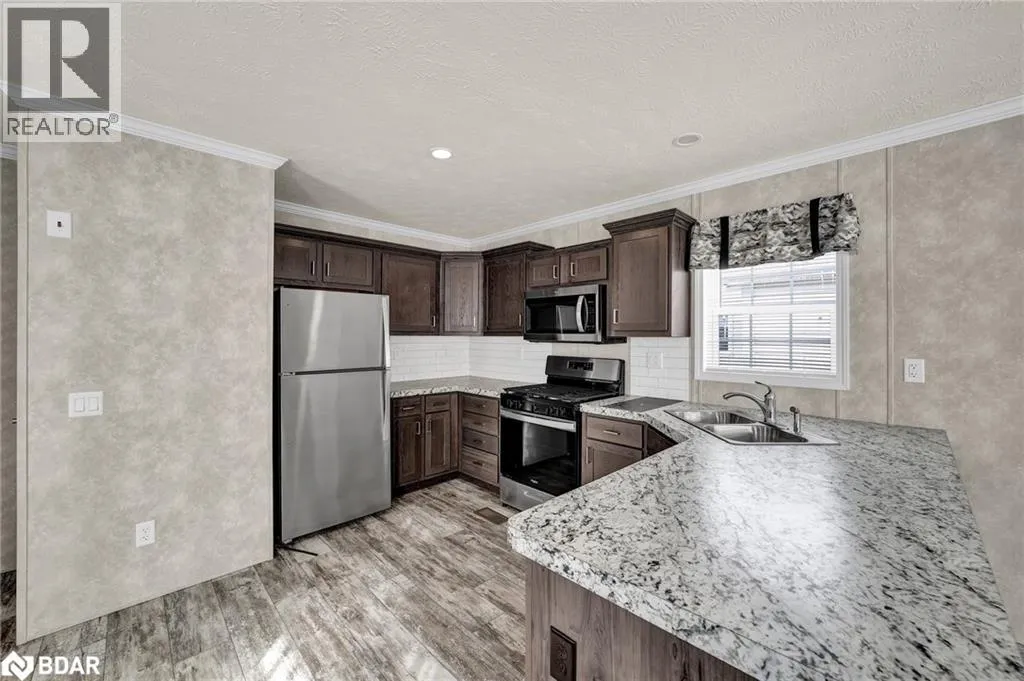 Cty Rd 10 to 25th Side Road to Shamrock Cres This brand-new mobile home is situated in a quiet, well-maintained Angus park, offering a peaceful and convenient lifestyle. Built on a solid concrete pad with hurricane straps, this home is designed for durability and comfort. Step inside to discover a spacious, open-concept layout featuring a modern eat-in kitchen with sleek stainless steel appliances and stylish laminate flooring throughout - completely carpet-free! The home offers two generously sized bedrooms, a full bathroom with ample storage, and a walkout to 2 brand-new decks - front and back, overlooking a fully fenced yard on a generous lot. A new garden shed provides additional storage space, while the double driveway adds extra convenience. All appliances are brand new, including a gas dryer. Located just minutes from all amenities, with quick access to Angus, Base Borden, and Alliston, this home is perfect for those seeking comfort, style, and easy living. Fees $511.52/Month include taxes, water, and road maintenence. Don't miss this fantastic opportunity - schedule your viewing today! (id:27476)