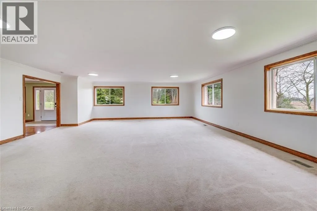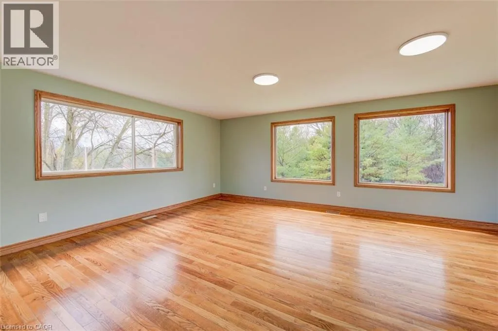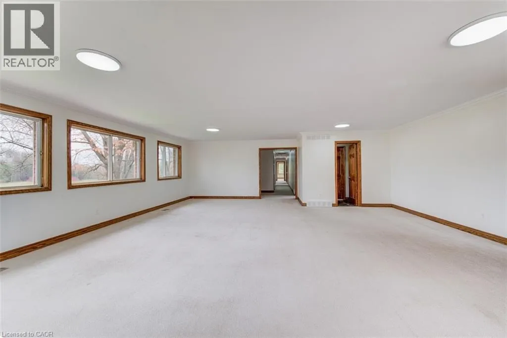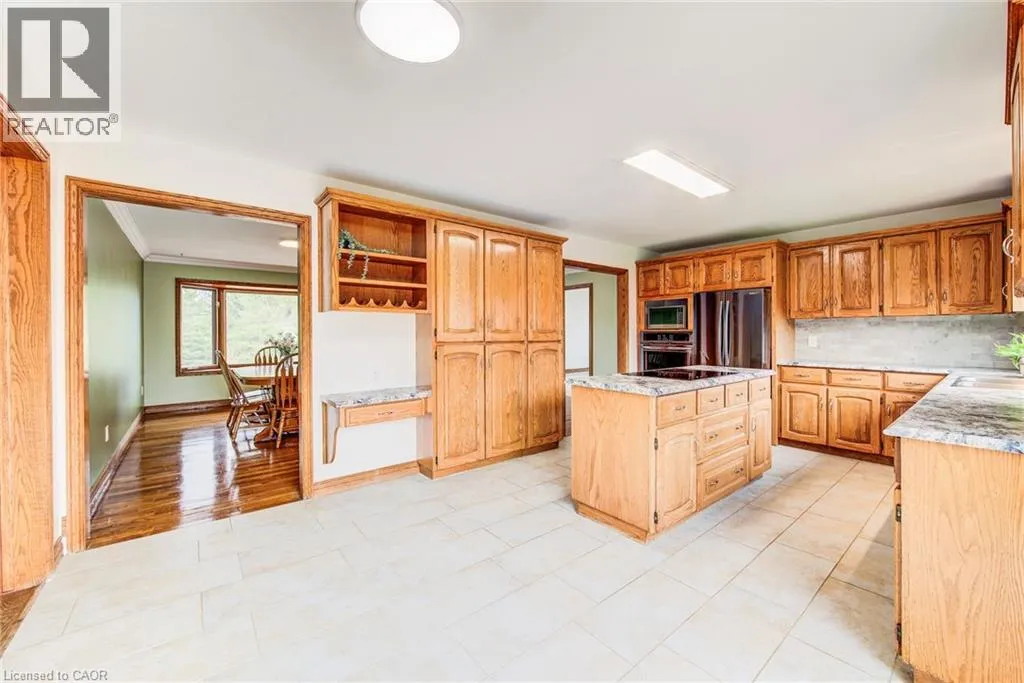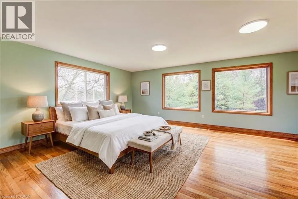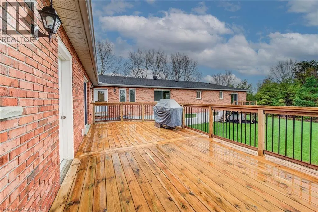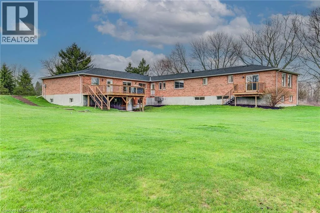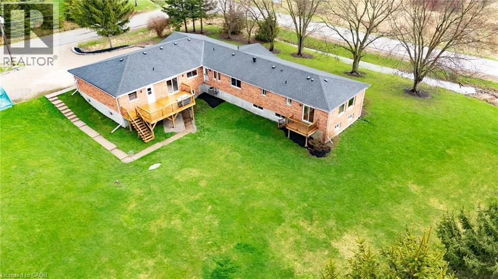 Set on just over 1 acre just outside the Village of Ariss, this spacious bungalow offers the perfect mix of country space and everyday convenience, with easy access to Guelph, Waterloo, Kitchener, Elmira and surrounding areas. Offering over 5,900 sq ft of finished living space, the main floor is a standout with 5 bedrooms, a bright oversized living room, and a separate bedroom wing that keeps family living both functional and private. Hardwood flooring, rich oak trim, and large windows add warmth throughout. The kitchen walks out to a generous deck overlooking the property, and the primary bedroom features a private ensuite and its own deck. The lower level adds incredible flexibility with a massive rec room, a 1 bedroom in-law suite, and a fully self-contained 2 bedroom accessory apartment with a separate entrance, ideal for multi-generational living or potential income opportunities. The wide driveway and double car garage offer ample parking for multiple vehicles. The property itself provides a private, open setting surrounded by mature trees. Recent updates include furnace (2024), A/C (2025), new front and side doors, and armour stone landscaping. A rare opportunity to own a home with this much space, inside and out, in a peaceful setting just minutes from the city. Photos are virtually staged. (id:27476)