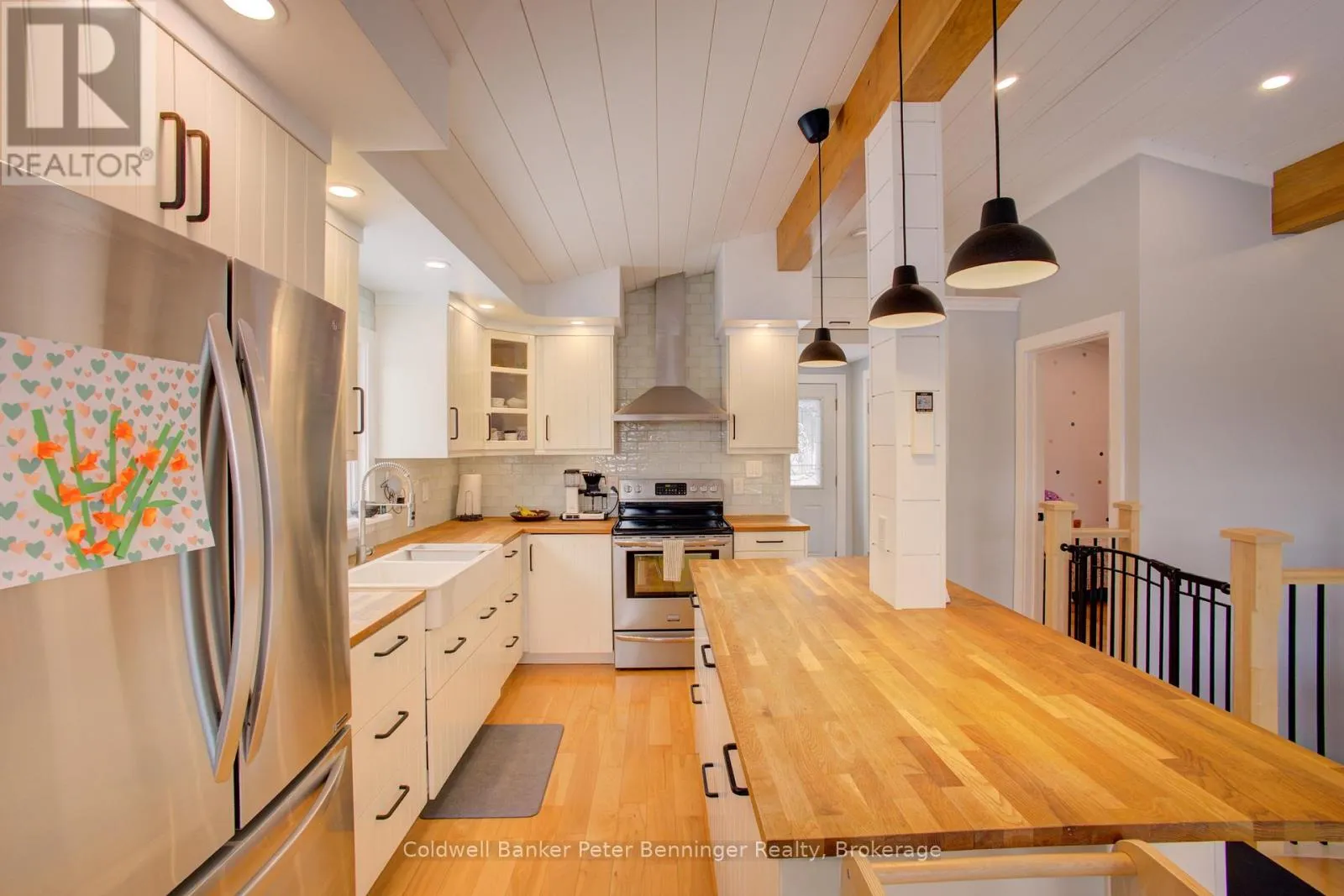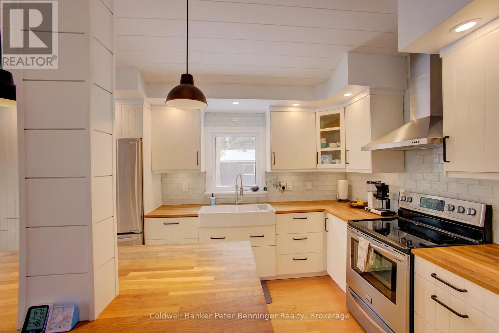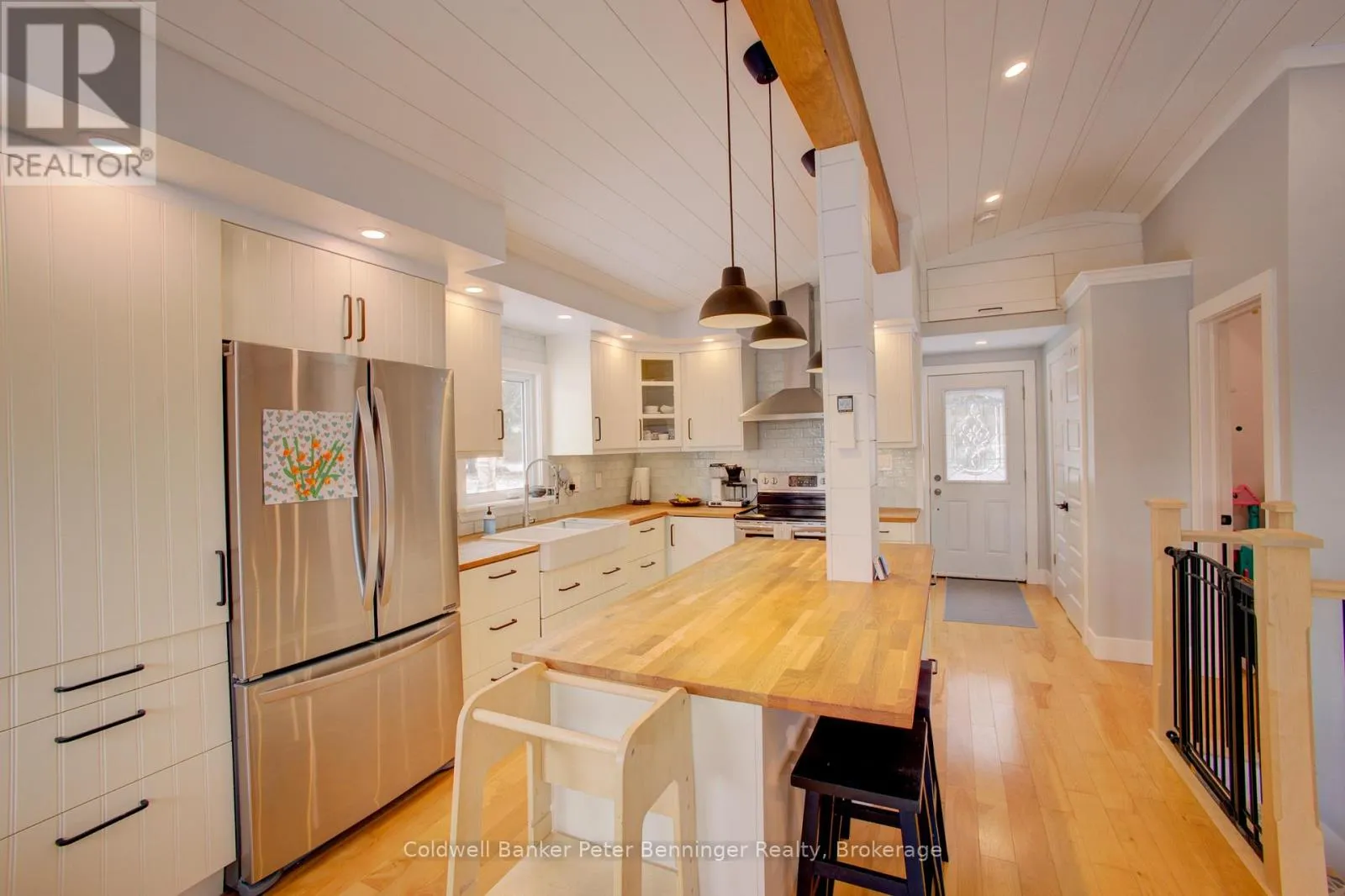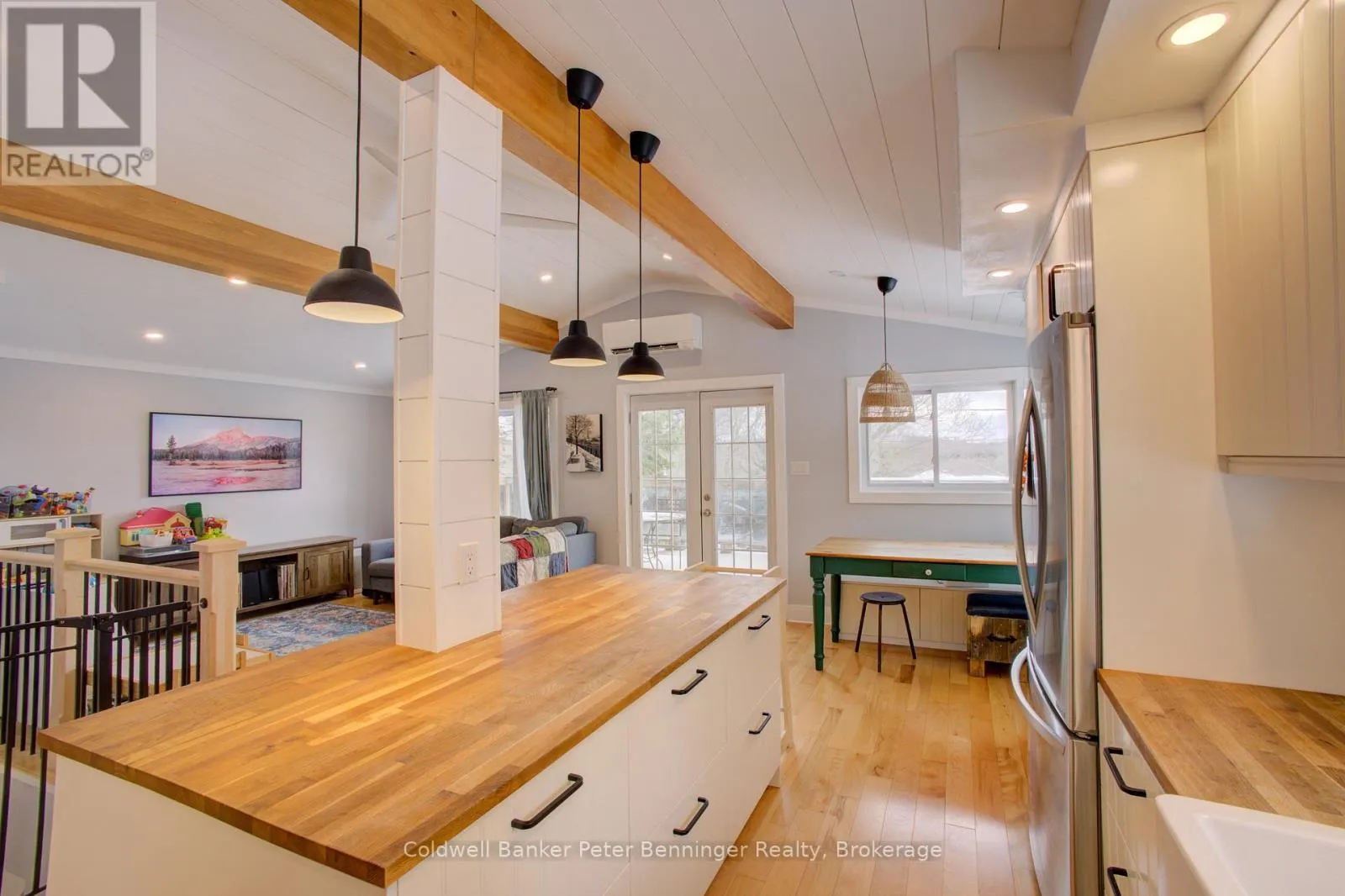 Cross Streets: Balaklava. ** Directions: South through Paisley on Bruce Road 3/Queen St., turn left on Inkerman St., turn right at first stop sign onto James St. Sign on right. Beautifully Updated Home in the Heart of Paisley. Become a homeowner with this charming gem situated on a spacious double lot (132 x 165). This inviting property features a modern kitchen with warm wood countertops and sleek stainless steel appliances, perfect for both everyday living and entertaining. French doors leading from the main living space to a large raised deck is a beautiful feature both visually and functionally. Inside, you'll find rich wood floors, a cozy gas fireplace, shiplap ceilings that create a clean, lined look as seen in modern farmhouses or coastal interiors, upgraded insulation and new drywall. Comfort is ensured year-round with a metal roof and efficient heat pump system. Step outside to enjoy a private yard complete with a deck and patio-ideal for relaxing or hosting gatherings. A standout feature is the detached 16 x 34 workshop/garage with electricity, offering excellent space for hobbies, storage, or projects. Located just steps from the Saugeen River and close to shopping, restaurants, parks, a splash pad, the arena, and much more. This property combines small-town charm with modern convenience - all in the beautiful community of Paisley. Don't miss the opportunity to call this "Home Sweet Home"! Double driveway that holds up to 6 vehicles (2025), flooring, drywall, washer, dryer, dishwasher, water softener, on demand hot water tank and gas stove (2023), heat pump (2022), metal rood (2021). Buyers are responsible for conducting their own due diligence regarding the potential for severance. (id:27476)