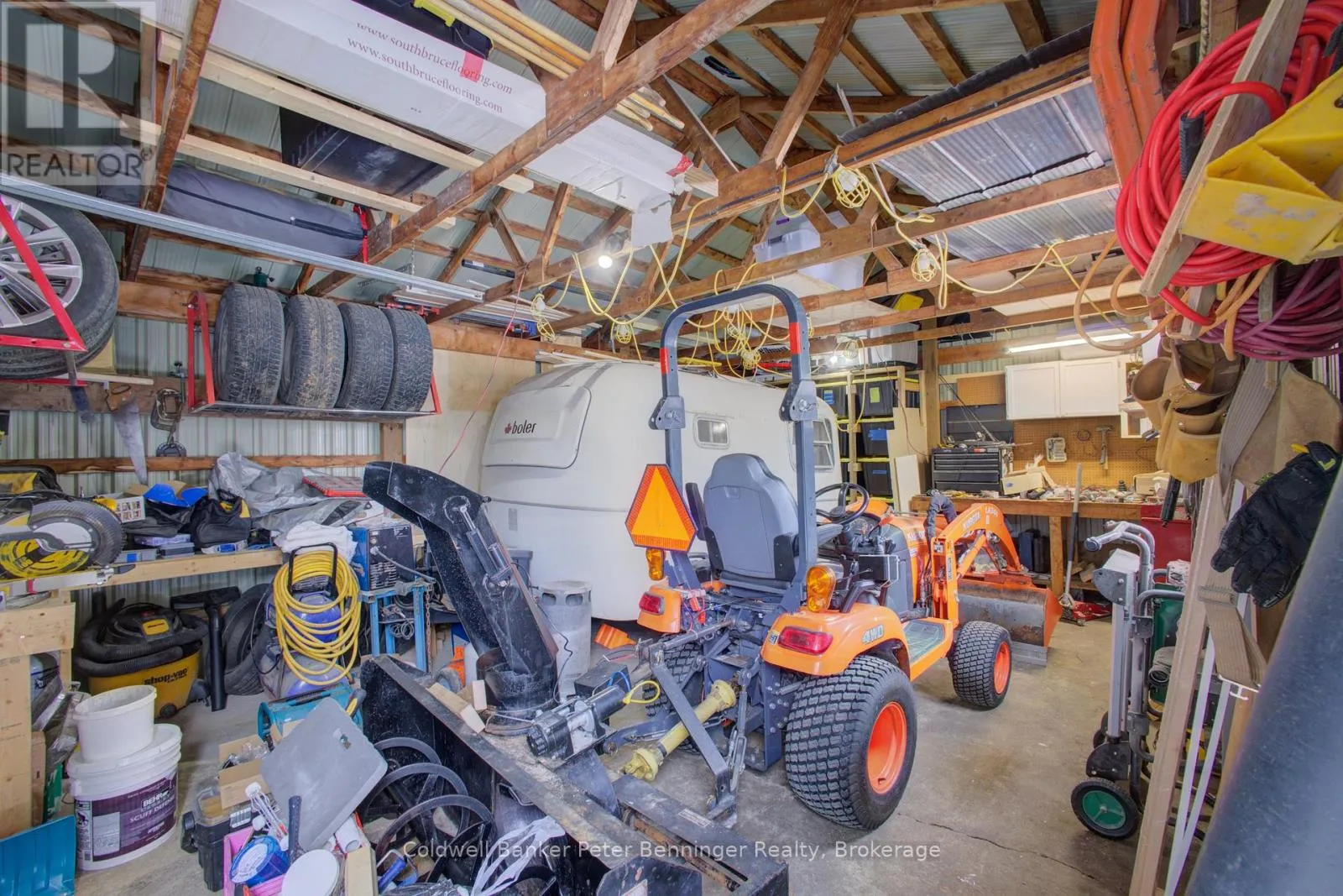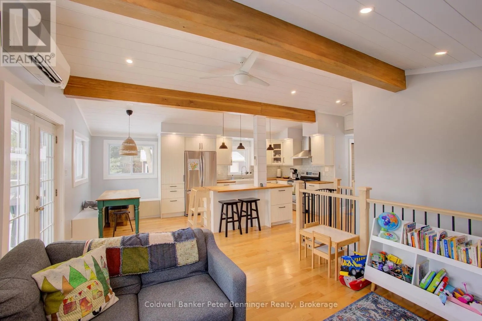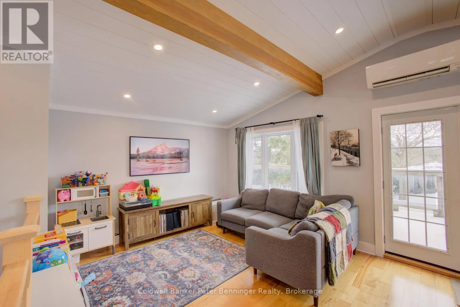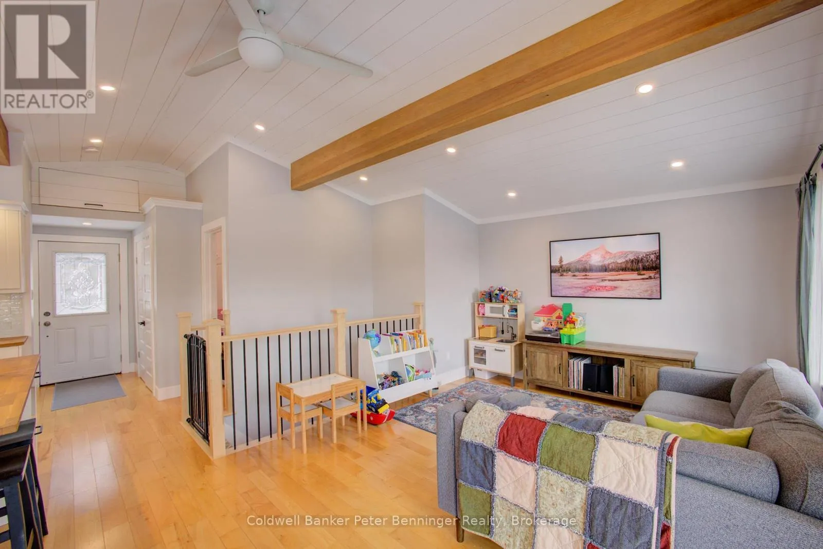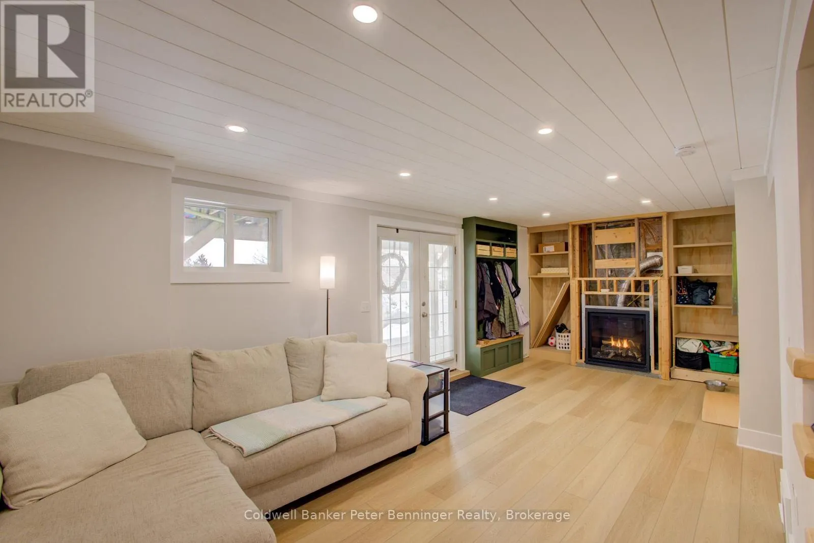 Cross Streets: Balaklava. ** Directions: South through Paisley on Bruce Road 3/Queen St., turn left on Inkerman St., turn right at first stop sign onto James St. Sign on right. Beautifully Updated Home in the Heart of Paisley. Become a homeowner with this charming gem situated on a spacious double lot (132 x 165). This inviting property features a modern kitchen with warm wood countertops and sleek stainless steel appliances, perfect for both everyday living and entertaining. French doors leading from the main living space to a large raised deck is a beautiful feature both visually and functionally. Inside, you'll find rich wood floors, a cozy gas fireplace, shiplap ceilings that create a clean, lined look as seen in modern farmhouses or coastal interiors, upgraded insulation and new drywall. Comfort is ensured year-round with a metal roof and efficient heat pump system. Step outside to enjoy a private yard complete with a deck and patio-ideal for relaxing or hosting gatherings. A standout feature is the detached 16 x 34 workshop/garage with electricity, offering excellent space for hobbies, storage, or projects. Located just steps from the Saugeen River and close to shopping, restaurants, parks, a splash pad, the arena, and much more. This property combines small-town charm with modern convenience - all in the beautiful community of Paisley. Don't miss the opportunity to call this "Home Sweet Home"! Double driveway that holds up to 6 vehicles (2025), flooring, drywall, washer, dryer, dishwasher, water softener, on demand hot water tank and gas stove (2023), heat pump (2022), metal rood (2021). Buyers are responsible for conducting their own due diligence regarding the potential for severance. (id:27476)