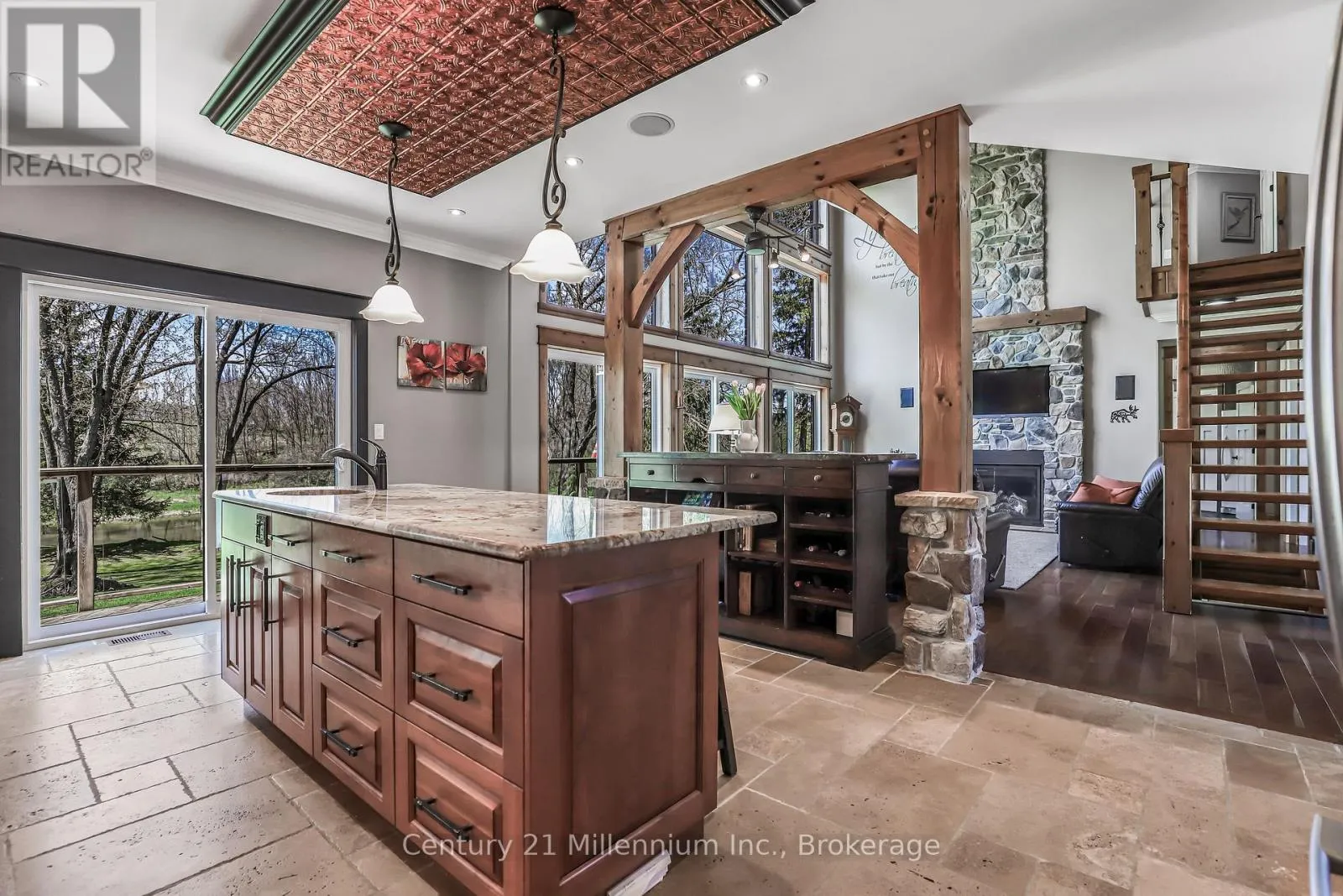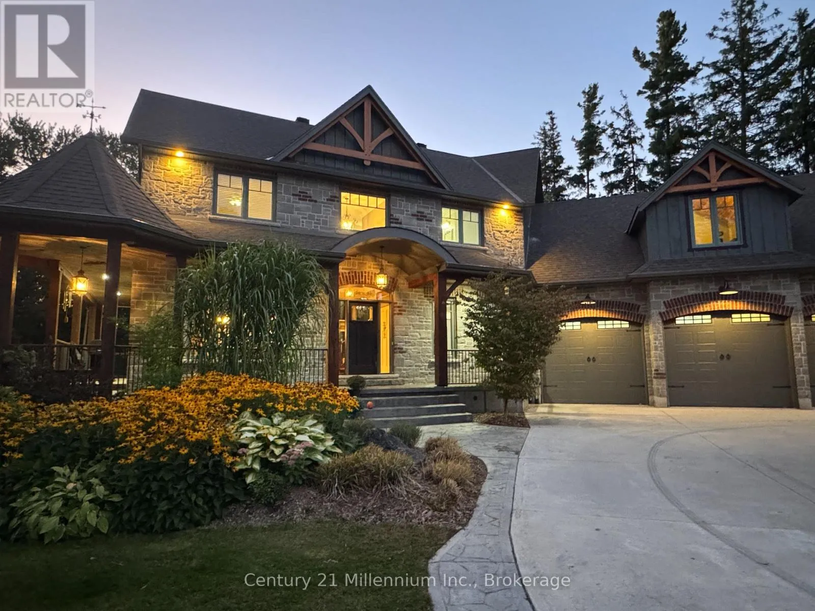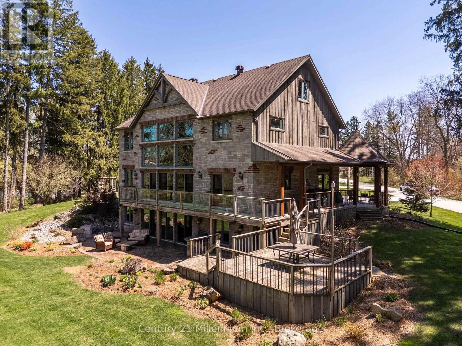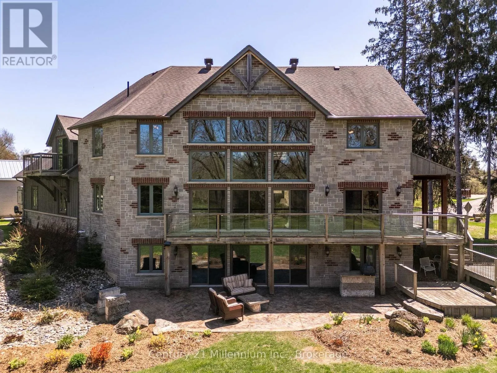 Cross Streets: Mill & Yonge. ** Directions: Yonge St. to Mill. West on Mill to the very last property on the right. Welcome to 142 Mill St., a stunning luxury estate set on approximately 2 acres along the Sauble River. A grand circular concrete drive leads to this serene property where timeless elegance meets modern comfort. The post & beam covered wraparound porch and gazebo create the perfect setting for morning coffee or peaceful evenings, showcasing beautiful river views and seamless indoor-outdoor living. Watch for otter, beaver and muskrat as well as bald eagle, egret and blue heron, fox and turtles along your private shoreline. Inside, a dramatic two-storey foyer with limestone flooring opens to a bright living room with floor-to-ceiling windows reaching to the 23' post and beam cathedral ceiling, rich cherry hardwood, and a striking stone gas fireplace. The gourmet cherry kitchen features granite countertops and sinks, a centre island, built-in appliances, and a breakfast credenza, plus a multi-tiered deck ideal for entertaining against the river backdrop. A formal dining room is perfect for gatherings, while a private main-floor office enjoys inspiring water views. The oversized triple-car garage with in-floor radiant heat (a mechanic's dream) connects to a spacious mudroom. Upstairs, the primary suite offers a sitting area and spa-inspired ensuite with a freestanding tub overlooking the river, glass-and-tile shower, double vanities, and private water closet. Two additional bedrooms with double closets share a full bath, plus second-floor laundry. A third-level bonus room offers many options! The Lower level is an entertainer's dream with a large family room, dry bar, media room, infrared sauna, 5th bedroom, cold room and walk-out to the stamped concrete patio. The property extends across the river with water rights. The 4,000 sq.ft. detached "Bee House" includes a workshop heated with natural gas, playroom, and plenty of flexible storage. A welcoming community, ideally located between Owen Sound, the Lake Huron shoreline, and Bruce Power in the middle of everywhere! (id:27476)