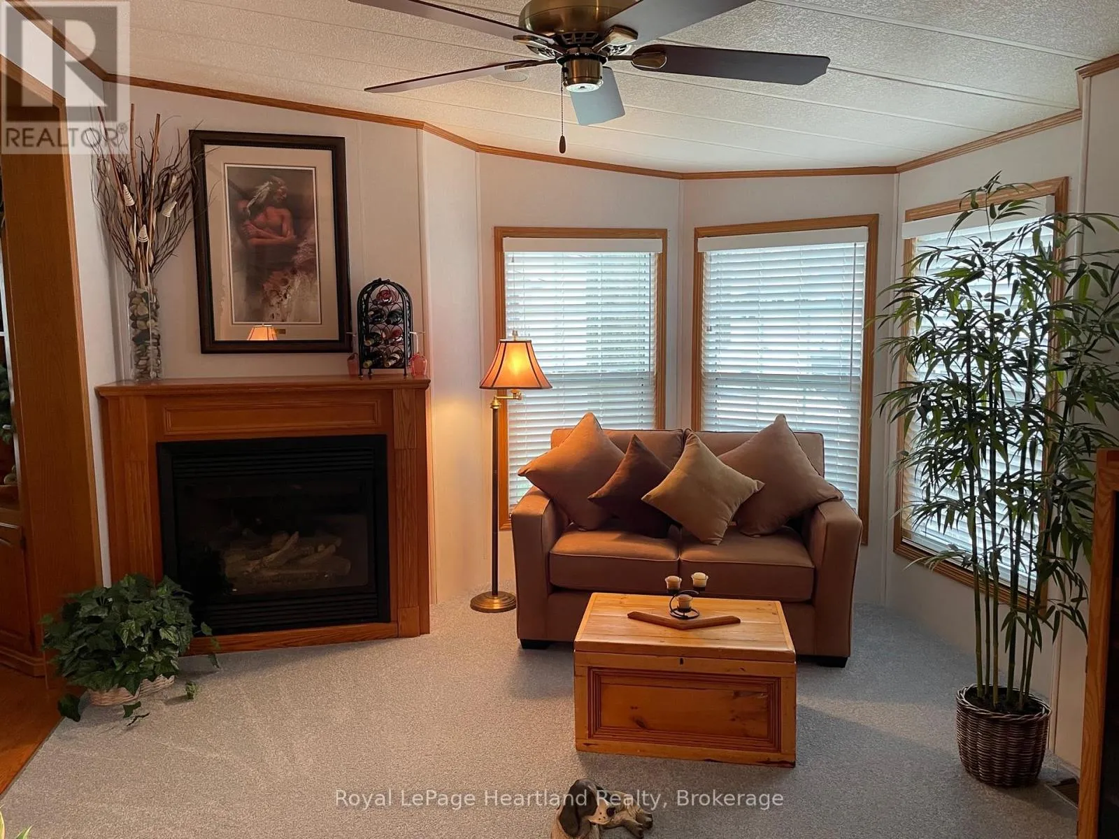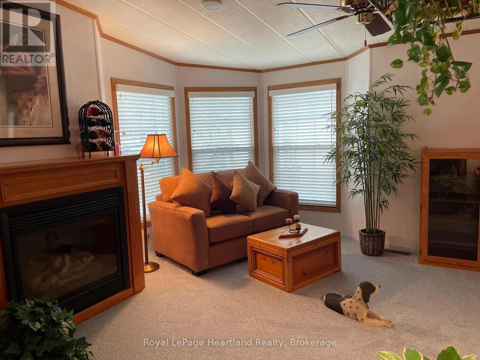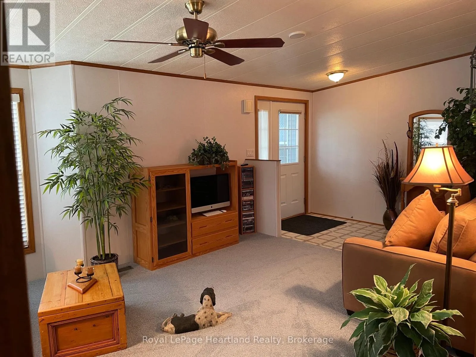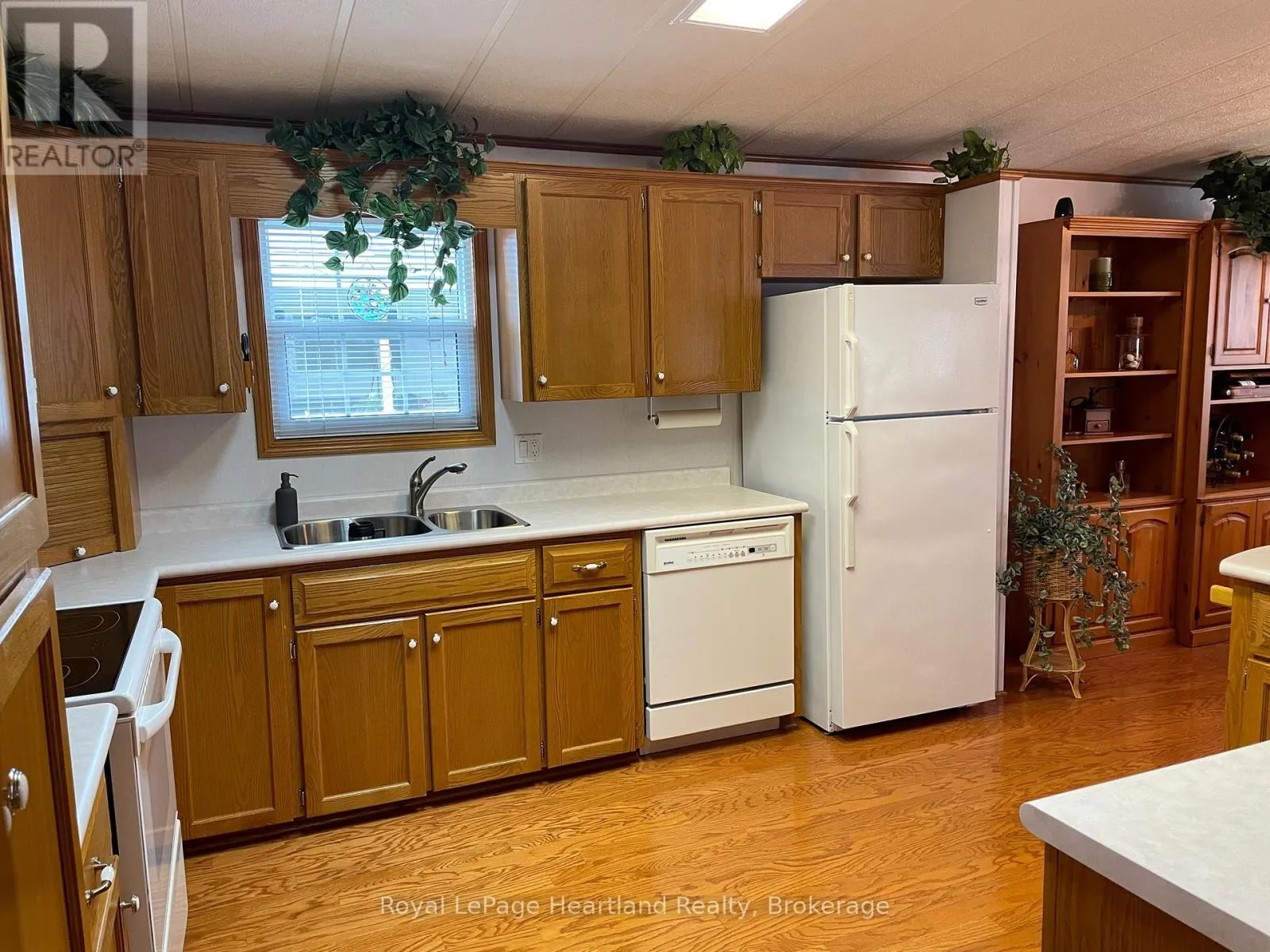 Cross Streets: NONE. ** Directions: Hwy 21 north of Goderich to Airport Road, turn west on Airport Road and follow to the end of the road. Meneset on the Lake entrance is to the left. Follow to 65 Cherokee Lane. Look what has come on the market! A spacious 2+ bedroom, 2 bathroom year round Northlander home is now being offered for sale at 65 Cherokee Lane in the desirable and highly sought after land lease adult lifestyle lakefront community known as Meneset on the Lake. This well maintained, super functional interior floor plan consists of an open concept kitchen with loads of cabinetry, dining room with space for a sideboard and cozy yet elegant living room with a natural gas fireplace. Privacy is ensured at the back of the home where you will find the primary bedroom with lots of closet space and a 3 piece ensuite bathroom. Guests may enjoy their own space with the main 4 piece bathroom and bedroom footsteps apart. The new Buyer will enjoy the additional sitting room or could easily be used as a 3rd bedroom with backyard access. Take note of all the storage space across from the hallway laundry closet, water softener (rented) and owned hot water heater. The home is heated with a new forced air natural gas furnace and central air conditioning (2021). In 2015 all carpet was replaced throughout, new shingles/roof, new water heater purchased and pipes under the home have been insulated. Exterior features include a double paved driveway, beautiful mature lot, partially covered front entrance deck and private garden/patio area with a shed to store off season items or make into your workshop. This is the perfect home for Buyers wanting lots of living space, lakeside living and close to the Town of Goderich. Meneset on the Lake is a lifestyle community with an active clubhouse, drive down immaculate beach, paved streets, garden plots and outdoor storage. When lifestyle, simplicity and an incredible private drive-able beach are your goals, consider this home as your next purchase! (id:27476)