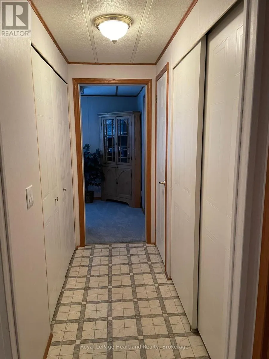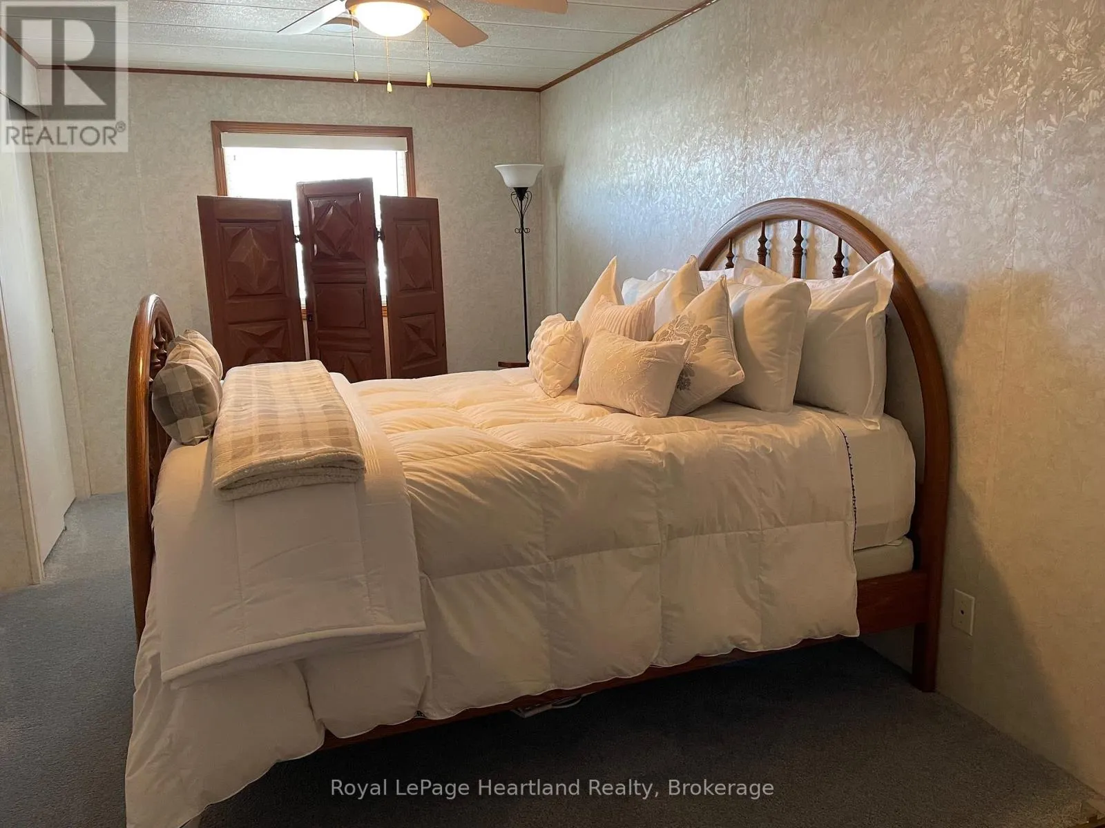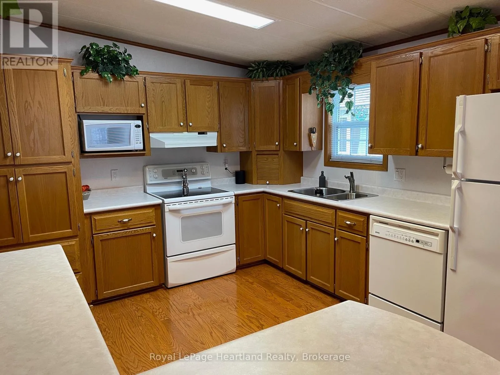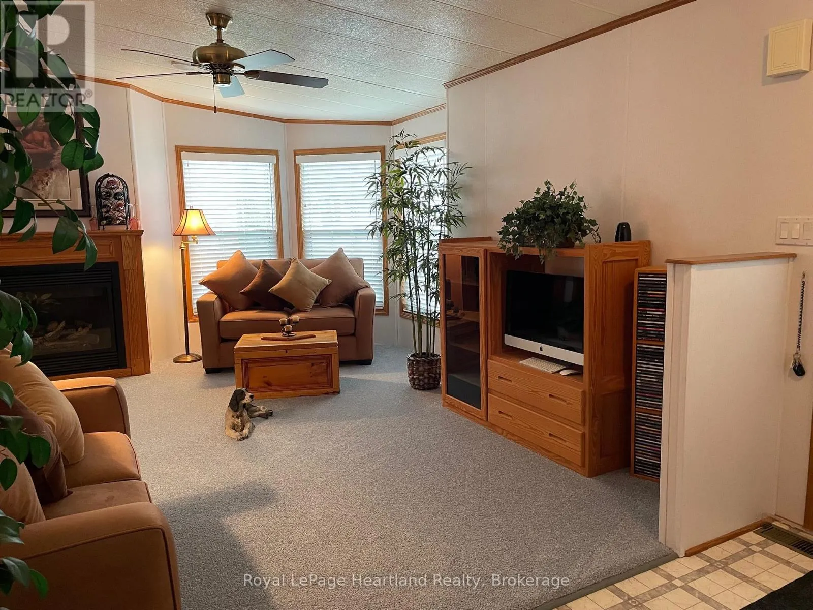 Cross Streets: NONE. ** Directions: Hwy 21 north of Goderich to Airport Road, turn west on Airport Road and follow to the end of the road. Meneset on the Lake entrance is to the left. Follow to 65 Cherokee Lane. Look what has come on the market! A spacious 2+ bedroom, 2 bathroom year round Northlander home is now being offered for sale at 65 Cherokee Lane in the desirable and highly sought after land lease adult lifestyle lakefront community known as Meneset on the Lake. This well maintained, super functional interior floor plan consists of an open concept kitchen with loads of cabinetry, dining room with space for a sideboard and cozy yet elegant living room with a natural gas fireplace. Privacy is ensured at the back of the home where you will find the primary bedroom with lots of closet space and a 3 piece ensuite bathroom. Guests may enjoy their own space with the main 4 piece bathroom and bedroom footsteps apart. The new Buyer will enjoy the additional sitting room or could easily be used as a 3rd bedroom with backyard access. Take note of all the storage space across from the hallway laundry closet, water softener (rented) and owned hot water heater. The home is heated with a new forced air natural gas furnace and central air conditioning (2021). In 2015 all carpet was replaced throughout, new shingles/roof, new water heater purchased and pipes under the home have been insulated. Exterior features include a double paved driveway, beautiful mature lot, partially covered front entrance deck and private garden/patio area with a shed to store off season items or make into your workshop. This is the perfect home for Buyers wanting lots of living space, lakeside living and close to the Town of Goderich. Meneset on the Lake is a lifestyle community with an active clubhouse, drive down immaculate beach, paved streets, garden plots and outdoor storage. When lifestyle, simplicity and an incredible private drive-able beach are your goals, consider this home as your next purchase! (id:27476)
