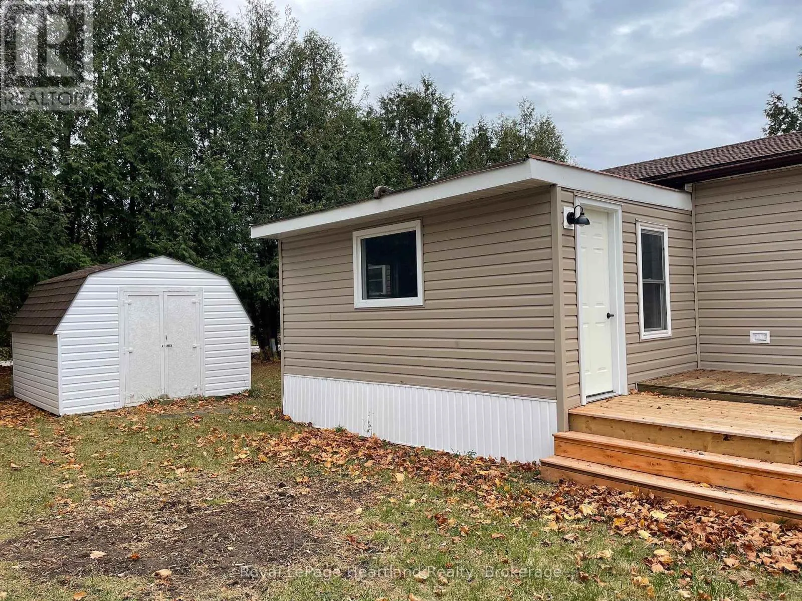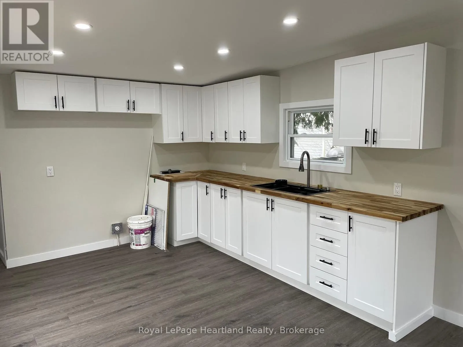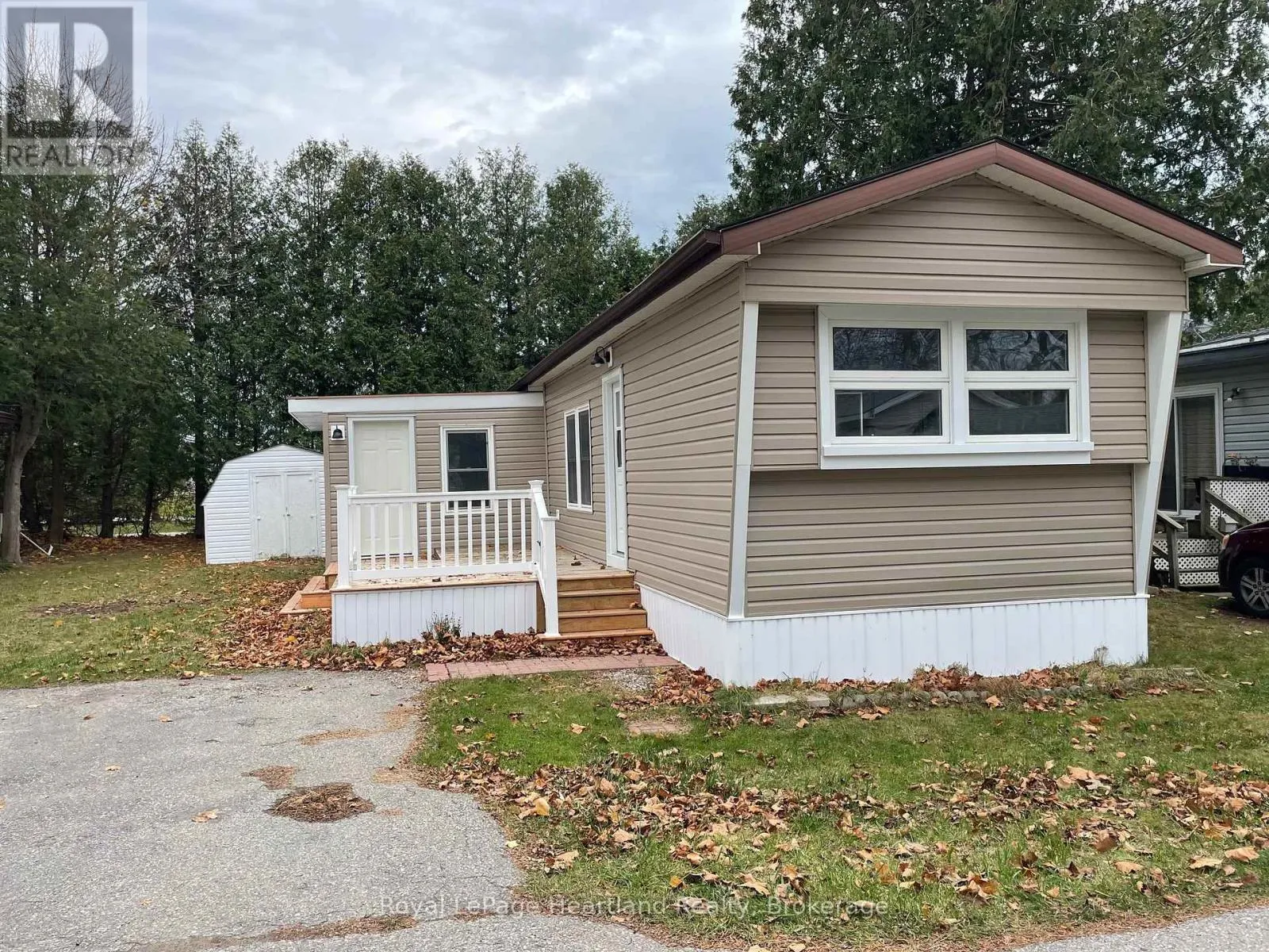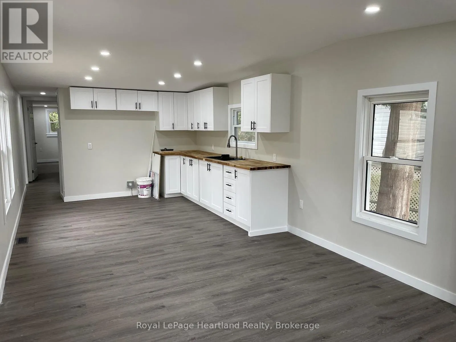 Cross Streets: Hwy 21 North & WEST COAST WAY. ** Directions: Hwy 21 North from Goderich to the main entrance of the Bluffs & Huron Haven Villlage. Follow West Coast Way to the first round - a-bout, turn right into Huron Haven Village. At the second stop sign turn left onto Bloomsbury Dr., home on the left. Renovations are complete! 16 Bloomsbury Drive is now ready for immediate possession in the family friendly land lease community; Huron Haven Village. The minute you walk into this home your eyes are drawn to the brand new white kitchen with gorgeous butcher block style counter top. An eat in dining room easily accommodates your kitchen table or perhaps you would prefer to add your own island with seating in this open concept kitchen floorplan. The cozy living room space is located at the front of the home off the deck with new vinyl railing. A three piece bathroom features all new fixtures including the corner shower, vanity, toilet and lighting. Inside the bathroom closet space is room for a stackable washer and dryer along with the owned water heater. The primary bedroom is at the back of the home for privacy with room for dressers and a large closet for clothing. The addition to the side of the home is currently used as a family/sitting room however a second bedroom and foyer area could be created by the new buyer. Other updates include recessed lighting, all new flooring, drywall, painted throughout, new interior doors and outdoor lighting. Swim during the summer months in the new inground pool, socialize in the clubhouse or enjoy the sandy beaches of Lake Huron close by. Minutes from the Town of Goderich, golf courses and all your shopping needs. (id:27476)