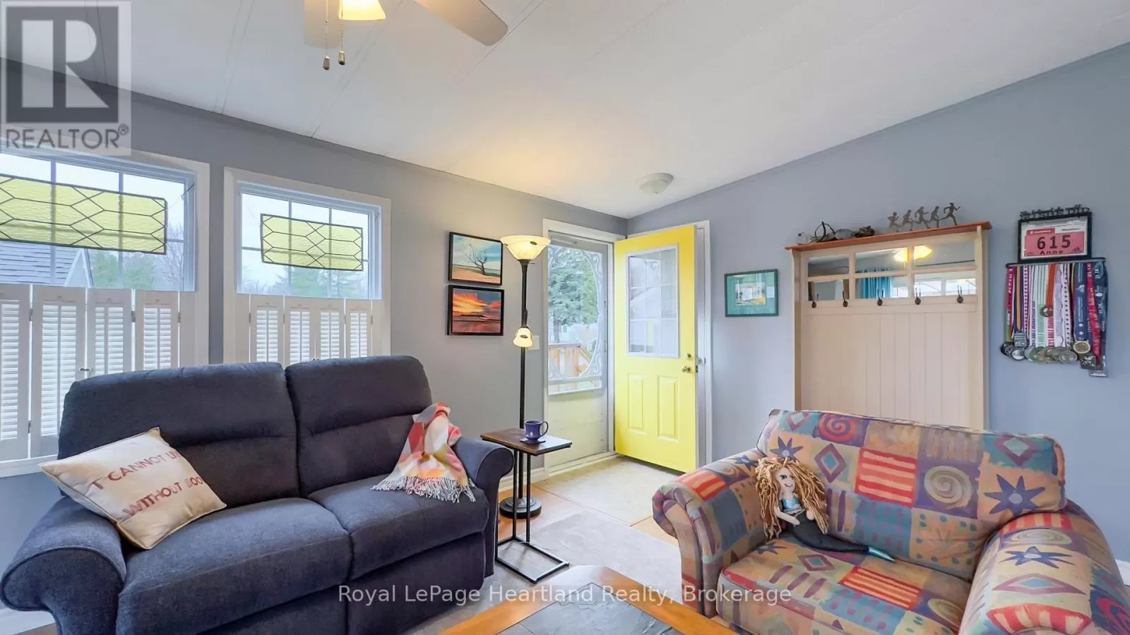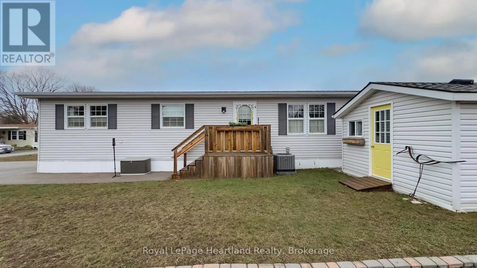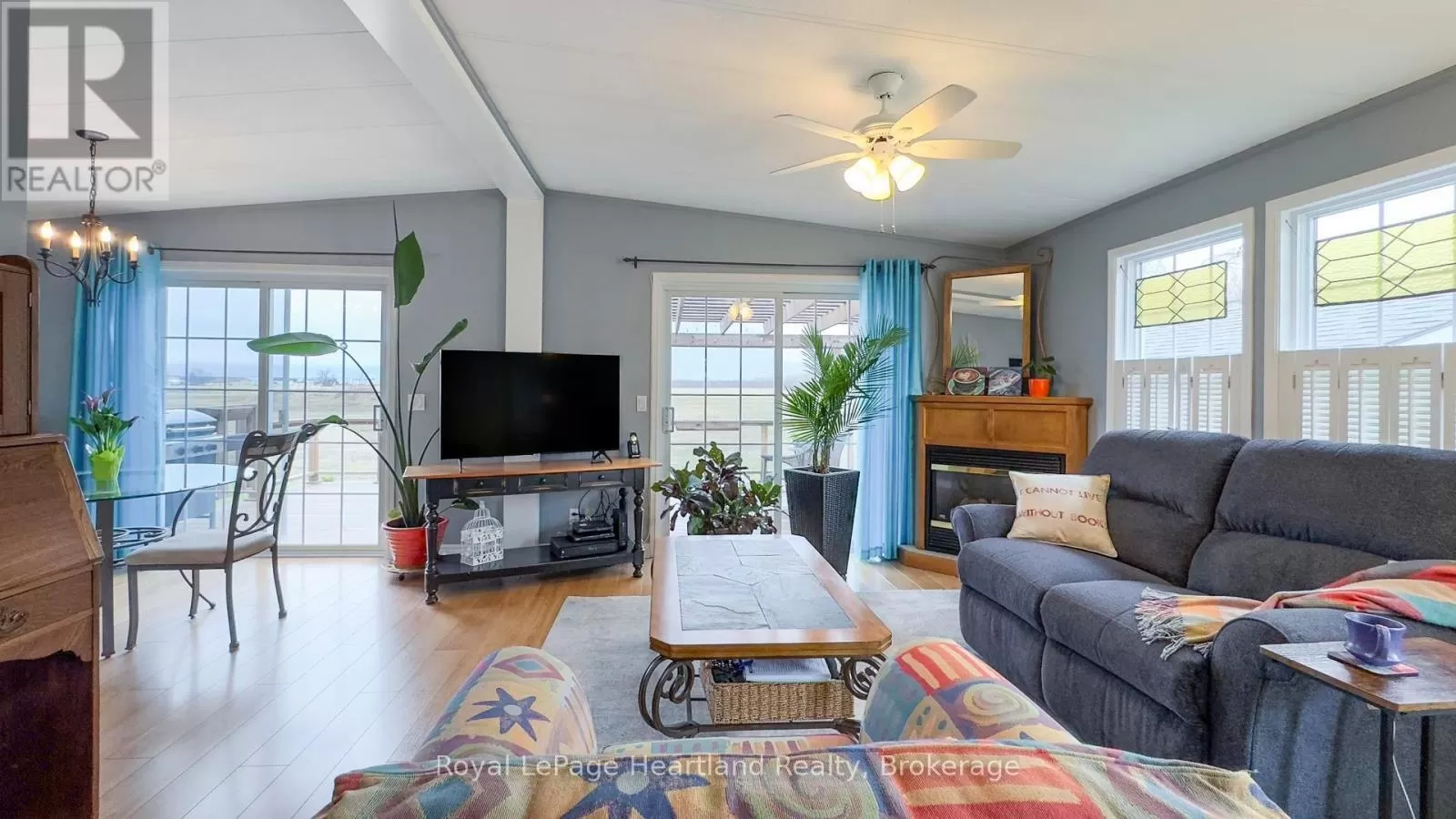 Cross Streets: HWY 21 and Airport Rd. ** Directions: Hwy 21 north of Goderich to Airport Road, turn west on Airport Road and follow to the end of the road. Meneset on the Lake entrance is to the left. Follow to 52 Algonquin Lane. Quiet, serene and scenic best describe the location of this beautiful, well kept 2 bedroom, 2 bathroom open concept home now being offered for sale in the lakefront land lease, 55+community, Meneset on the Lake. With no one living behind you, nature presents itself at all times of the day. Morning coffee couldnt get any better on the spanning easterly facing deck whether it be under the pergola or basking in the sun. Inside the immaculate home you will appreciate the open concept floor plan boasting an oversized living room with cozy gas fireplace, perfect for those colder nights. The dining room is located off to the side of the living room and it is the perfect space for hosting guests. Both the living and dining areas have an abundance of natural light coming from the 2 sets of patio doors leading onto the deck. The kitchen has ample cabinet space and located footsteps away from the laundry area making it an ideal space for those who love to cook. This home easily accommodates family and friends for dinner and social gatherings. The oversized primary bedroom with walk-in closet features a 3 piece ensuite. Guest will appreciate the size of the second bedroom with the main 4 piece main bathroom across the hall. Updates and features include new exterior shutters (2014), custom blinds in bedroom and laundry area, new gas line hook up (2020), new central air (2023), new wiring service to home & shed (2020), fridge & stove (2023), pergola (2022) & water heater, softener and reverse osmosis are owned . Meneset on the Lake is a lifestyle community with an active clubhouse, drive down immaculate beach, paved streets, garden plots and outdoor storage. When living space, lifestyle, low maintenance and the beach check the criteria boxes; wait no longer as this exceptional home will not last long on the market! (id:27476)