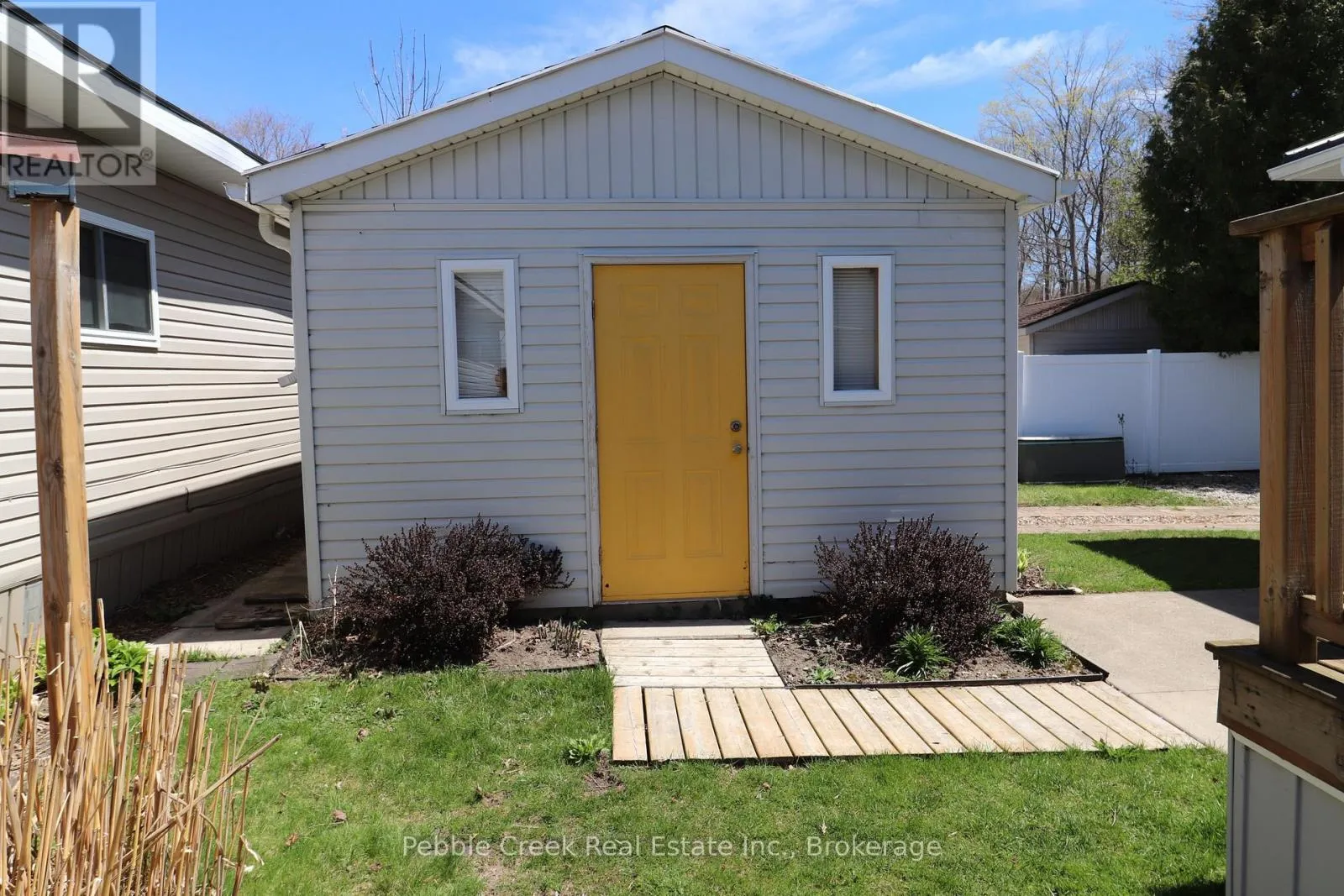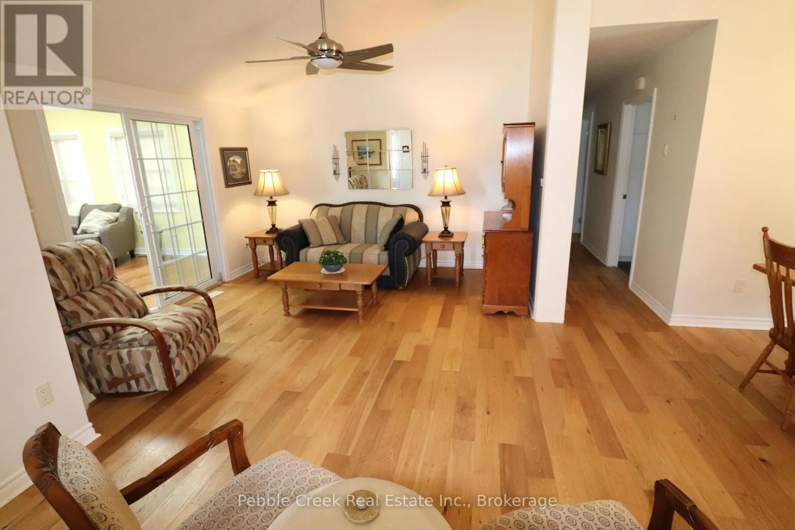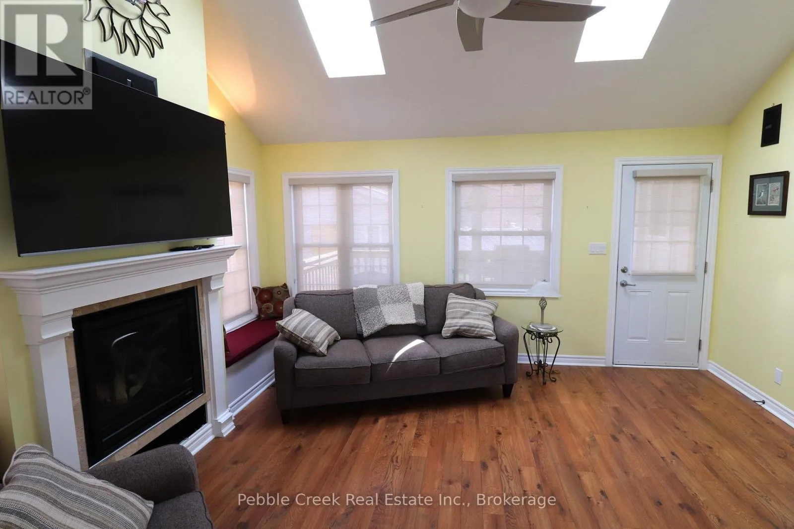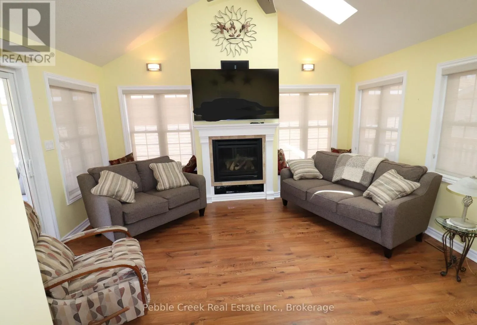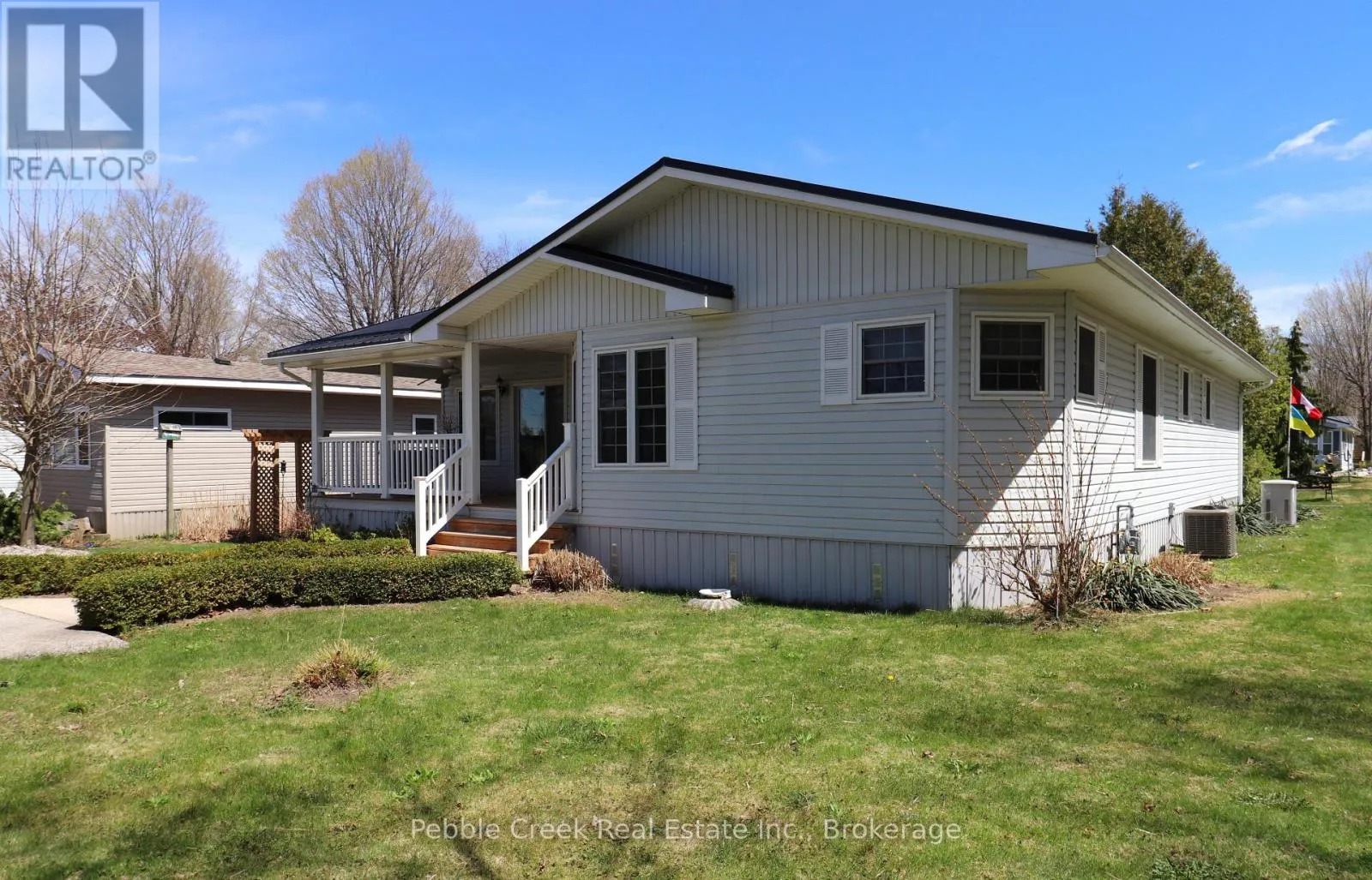 Cross Streets: Iroquois Lane and Algonquin Lane. ** Directions: North from Goderich on Hwy 21, turn West onto Airport Rd. Follow to the end and turn left into Meneset, then South onto Iroquois Lane. Property on the East side at the end. Amazing location! This stunning "Royal Home" is situated on one of the best lots at Meneset on the Lake, an adult lakefront community located just minutes north of Goderich. This fabulous home offers a partial seasonal lakeview and is located across the road from a forested area and path leading to the community's beachfront area! As you walk up to the inviting covered front porch, you will know you've found your new home! Step inside and you will be very impressed with the spacious interior including cathedral ceilings and gorgeous wood flooring. The impressive kitchen features newer premium appliances, an abundance of cabinets and several windows for lots of natural light. There's also a formal dining room, living room and stunning family room addition with cathedral ceiling, skylights and natural gas fireplace! Down the hall from the main living area is a laundry room with sink and primary bedroom with 3 pc en-suite bath and walk in closet. There is a spacious second bedroom as well. At the back of the home there's a deck for grilling, concrete patio, private fenced area and large shed/workshop. Services include forced air gas heating, central A/C, high speed internet and "whole home" generator. An added bonus is the entire roof was replaced in 2022 with long lasting metal. This is a great opportunity to acquire a beautiful home in a very desirable land lease community, complete with its very own club house and recreational activities! If that isn't enough, several golf courses, walking trails and lots of shopping is available nearby in "The "Prettiest town of Canada!" (id:27476)