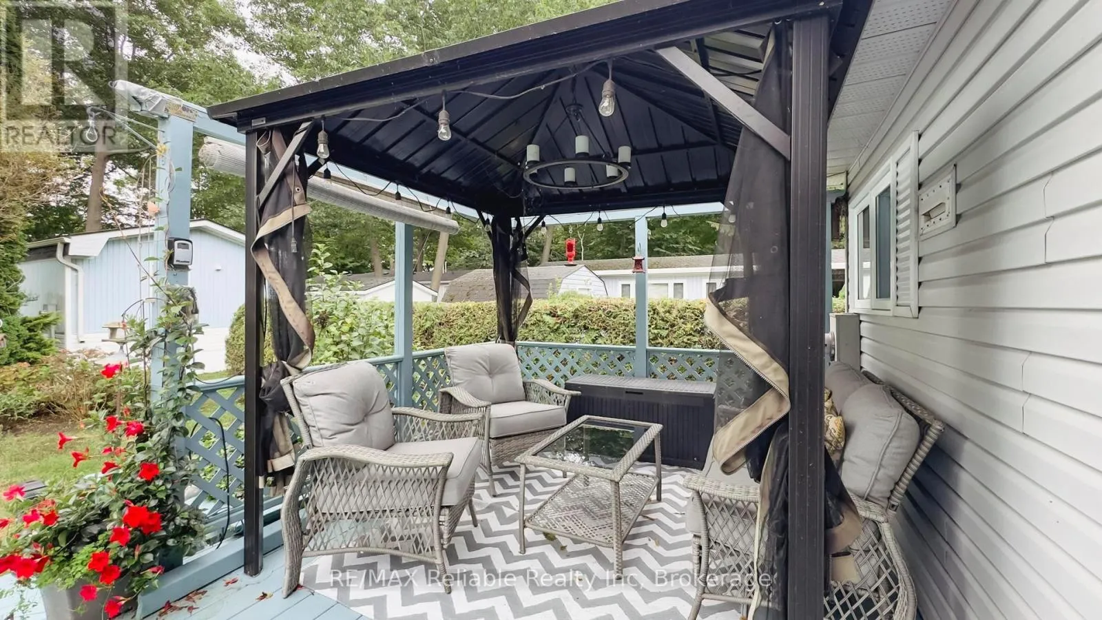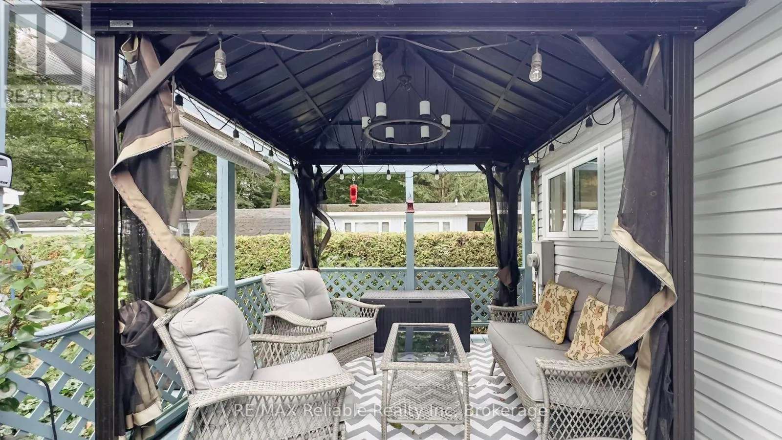 Cross Streets: Champlain Blvd. ** Directions: Follow highway 21 north of Goderich to Airport Road. Turn west. Turn south on Mill Road and West on Champlain Blvd. Turn south on Cree Lane. Home is on east side of street. This well-maintained 2-bedroom, 2-bath home, with detached garage, is uniquely situated on the leased lot and offers a private backyard. From the attractive curb appeal to the gardens, this home feels so welcoming. The floor plan offers a bright atmosphere with the main living space being open-concept, a gas fireplace and separate den addition. The windows offer plentiful natural light. Central air conditioning. Outside, the covered back deck with its gazebo is the perfect place to unwind. The detached garage has additional workshop space for the handy man. Plenty of parking: three spaces in the lane and one in the garage. Set within a friendly land lease community, you'll enjoy so much more than just a home. Stroll the private sandy beach with Lake Huron spectacular sunsets, enjoy the tranquil setting in the mature trees, visit the clubhouse, meet new friends, or make use of the woodworking shop. Here, retirement living is not just easy, its truly enjoyable. (id:27476)