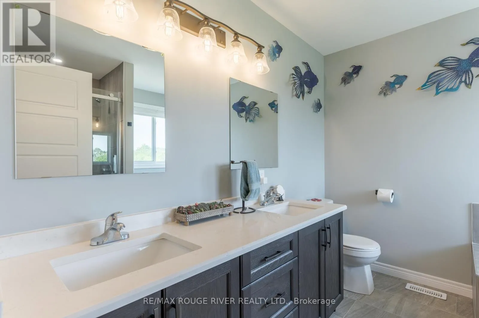 Cross Streets: County Road 40. ** Directions: Maryann to Keeler. Discover this 2022 build by Expert Craftsmanship by Peterborough Homes, positioned at the end of a cul-de-sac, on an oversize lot, offering added privacy and serene views backing onto a pond. This home is a spacious two-storey all-brick home, featuring four bedrooms, three bathrooms, and a 2-car garage. This home stands out with over $73,000 in builder upgrades, which include upgrade for an open floor plan on main floor, gas fireplace, quartz countertops, a butler's pantry off the kitchen, smart appliances, engineered hardwood flooring and stairs, pot lighting throughout the main floor, a master ensuite with tiled shower and tub, an asphalt driveway, and a flagstone walkway. The main floor features a spacious open-concept living, dining & kitchen layout, a large kitchen island with built-in storage, a walk-out from the kitchen, and a butler's pantry with custom cabinetry & space for a bar fridge and 2nd fridge or freezer, making this kitchen really stand out. A half bath & mudroom finish off the main floor. Upstairs, you will find a large master suite with a walk-in closet, upgraded 5-piece ensuite, three additional bedrooms, laundry room, and another 4-piece bath. The basement offers great potential, which is prepped to be finished and offers oversized egress windows, allowing natural light to pour in, tall ceilings, and a roughed-in area for an additional bathroom. You don't want to miss out on this exceptional property in this up-and-coming neighborhood in Norwood, which combines charming rural life with natural beauty and a community-centered atmosphere. It's ideal for those seeking tranquility, highlighted by scenic landscapes, outdoor recreation. Surrounded by rolling hills, lush forests, and peaceful waterways, Norwood provides perfect settings for hiking, biking, and other outdoor activities. (id:27476)