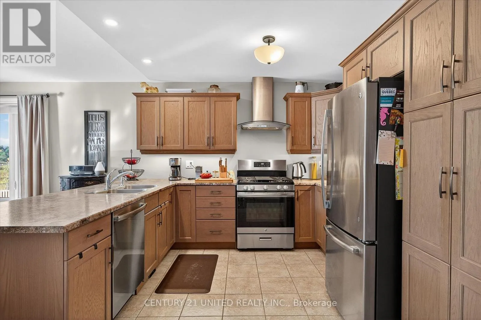 Hwy 40 and Helen St Lovely community neighbourhood! This large 7 year new Peterborough Home has lots of features and extras, double front door was an extra feature, double door pantry, added cupboard beside dishwasher, under counter lighting, gas range, gas line to deck for BBQ hookup, upgraded hardwood staircase, extra pot lights in kitchen and all showers have a light, ceramic tiled laundry room, built-in blinds in patio door, reverse osmosis system in kitchen, water softener, central air and central vac. Beautiful all brick bungalow + double garage in Norwood Park Estates! Upgraded deck looking out to a forest, no neighbours behind. Quality built in 2017 offering 2+2 bedrooms, 3 full bathrooms and fully finished basement. Bright open concept kitchen, dining room and living room with vaulted ceilings, hardwood floors and walkout to oversized deck with natural gas BBQ hook up. Main floor primary bedroom with walk-in closet and 3 piece ensuite. Finished lower level offering rec room with gas fireplace, kitchenette, and walkout to fully fenced backyard, laundry room, 2 bedrooms and 4 piece bathroom. Enjoy municipal services with friendly small-town community feel, walking trails and beautiful Millpond around the corner. Convenient to all amenities of Norwood and 20 mins to Peterborough. (id:27476)