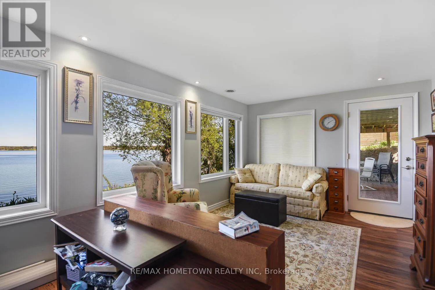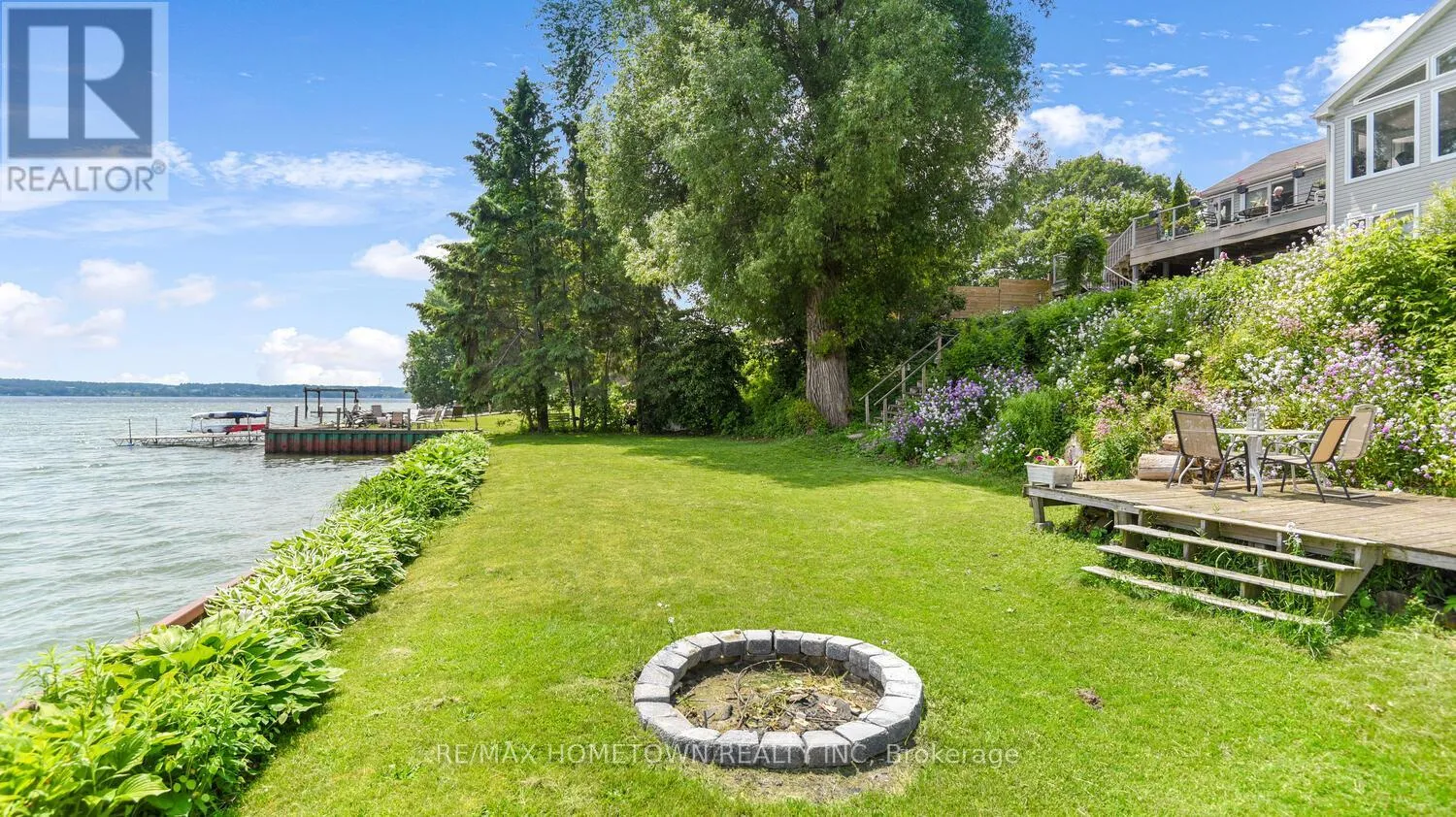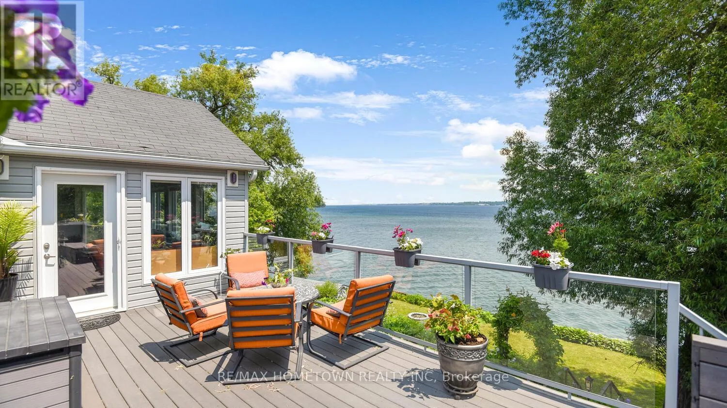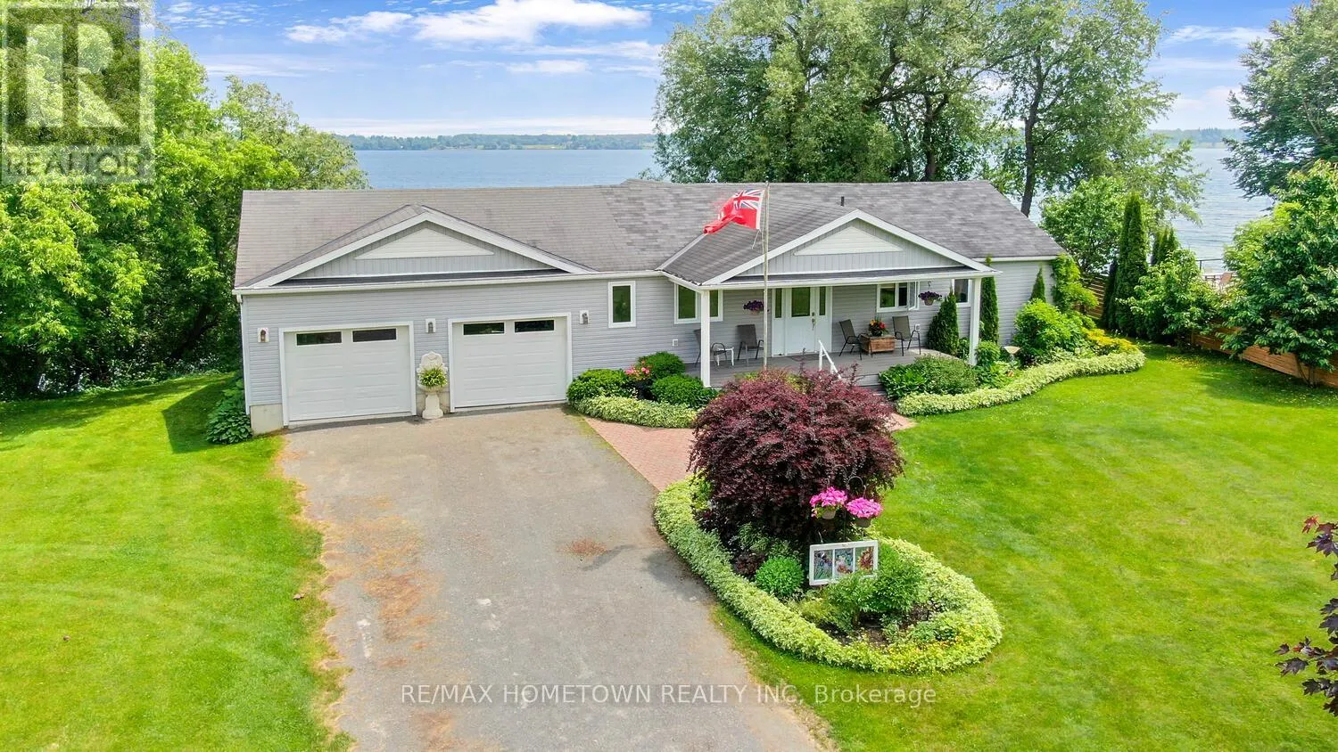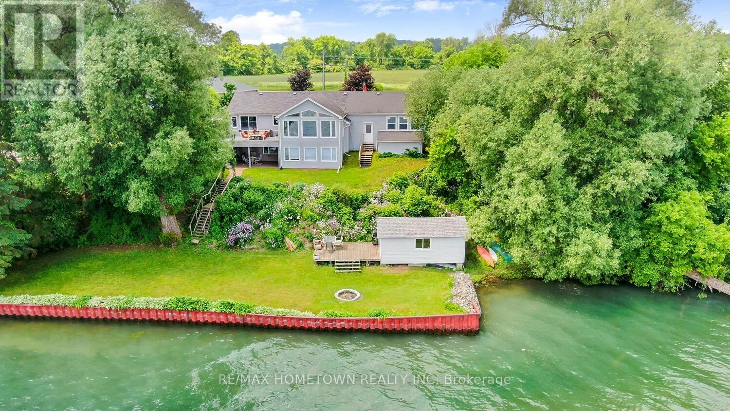Cross Streets: Country Road 2. ** Directions: Exit 716 off the 401, head south down Edward St. to County Road 2, head west, and once you pass Blue Church Road, you will find the property on the left-hand side, #1435 . Welcome to 1435 County Road 2, a rare find on the beautiful St. Lawrence River! If you're looking for peaceful waterfront living, step inside and be instantly greeted with a full view of the river through a wall of large windows. Open-concept living and dining areas. The built-in wall unit includes a buffet, china cabinets, lighting, and lots of storage. Custom walnut kitchen with a generous island, including a prep sink and seating, designed for creating great meals and gathering with friends. Just off the kitchen is a 3-piece bath with a walk-in shower and a separate laundry room with a built-in ironing board. 2-car oversized garage with workshop area.The primary bedroom offers built-in drawers and cupboards and a spacious walk-in closet. Access the large deck from the living room or bedroom. Enjoy quiet mornings with coffee and an expansive river view, and watch the ships go by. Soak in the river views sitting on the deck, with a railing of glass panels and a dining area with built-in seating and storage cupboards, ideal for year-round BBQs. The lower level offers the same large windows as the main-level living room and includes two additional bedrooms, a 4-piece bath with a large soaker tub, a large walk-through storage room, and a big flexible room that can be used as a family room or office.The view may be too distracting to get much work done! Walk out to a covered patio and follow the stairs to the river to a 100 ft wide lawn, a cabin for sleeping,storing kayaks,swimming and fishing supplies. Attached is another deck for dining or lounging. Beyond the cabin is a beach area. Wildlife abounds; every day when you see the resident bald eagle sitting on its perch in the trees, ready to dive for a fish. Sometimes you'll be greeted by a heron standing on the seawall or at the beach. Watch ships and sailboats float by on the mighty St. Lawrence. Surrounding the home are vibrant, low-maintenance perennial gardens and fruit trees (apple, pear, plum,cherry, saskatoon). (id:27476)